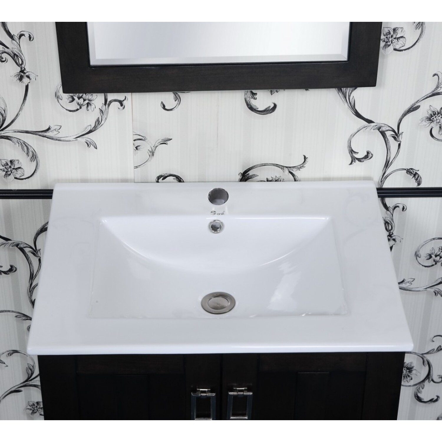 This single sink vanity will update the style of any bathroom. It features a ceramic sink-top and double door design with fashionable drop handles. A matching beveled edged framed wall mirror is also included to complete the look.