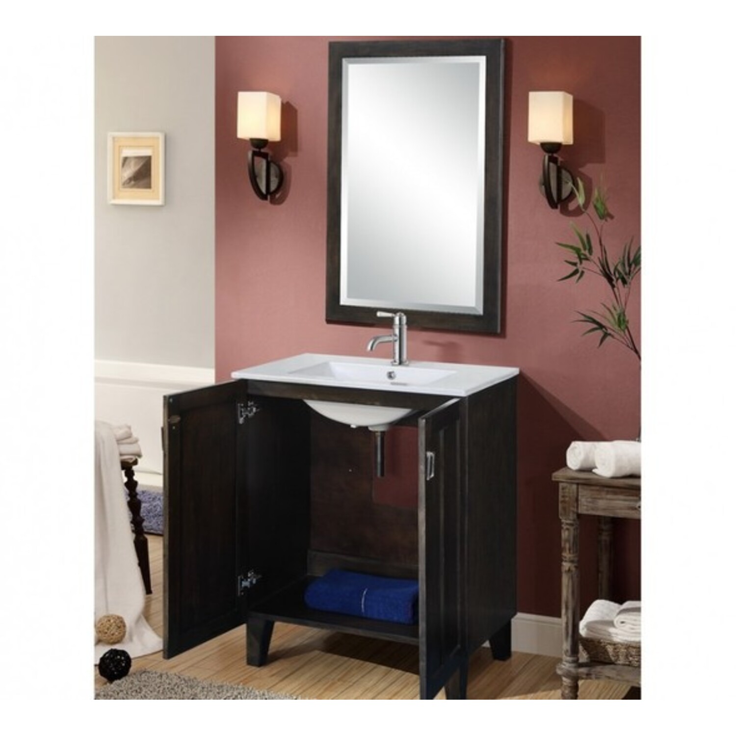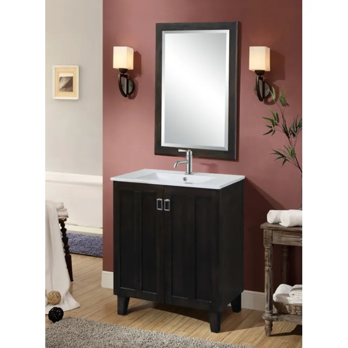 This single sink vanity will update any bathroom. It features a ceramic sink-top and double door design with fashionable drop handles. Matching beveled edged framed wall mirror is also included to complete the look.