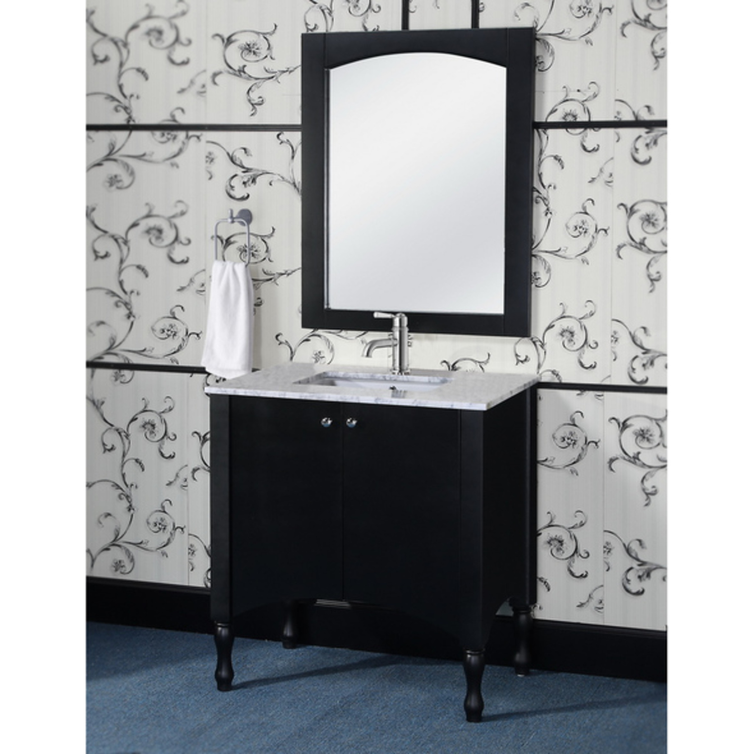 This contemporary style vanity will bring a sense of elegance in any bathroom. It features a Carrara white marble top with an under mounted sink. Soft-closing double-door with plenty of room for storage. A matching framed arched top wall mirror is included to complete the look.