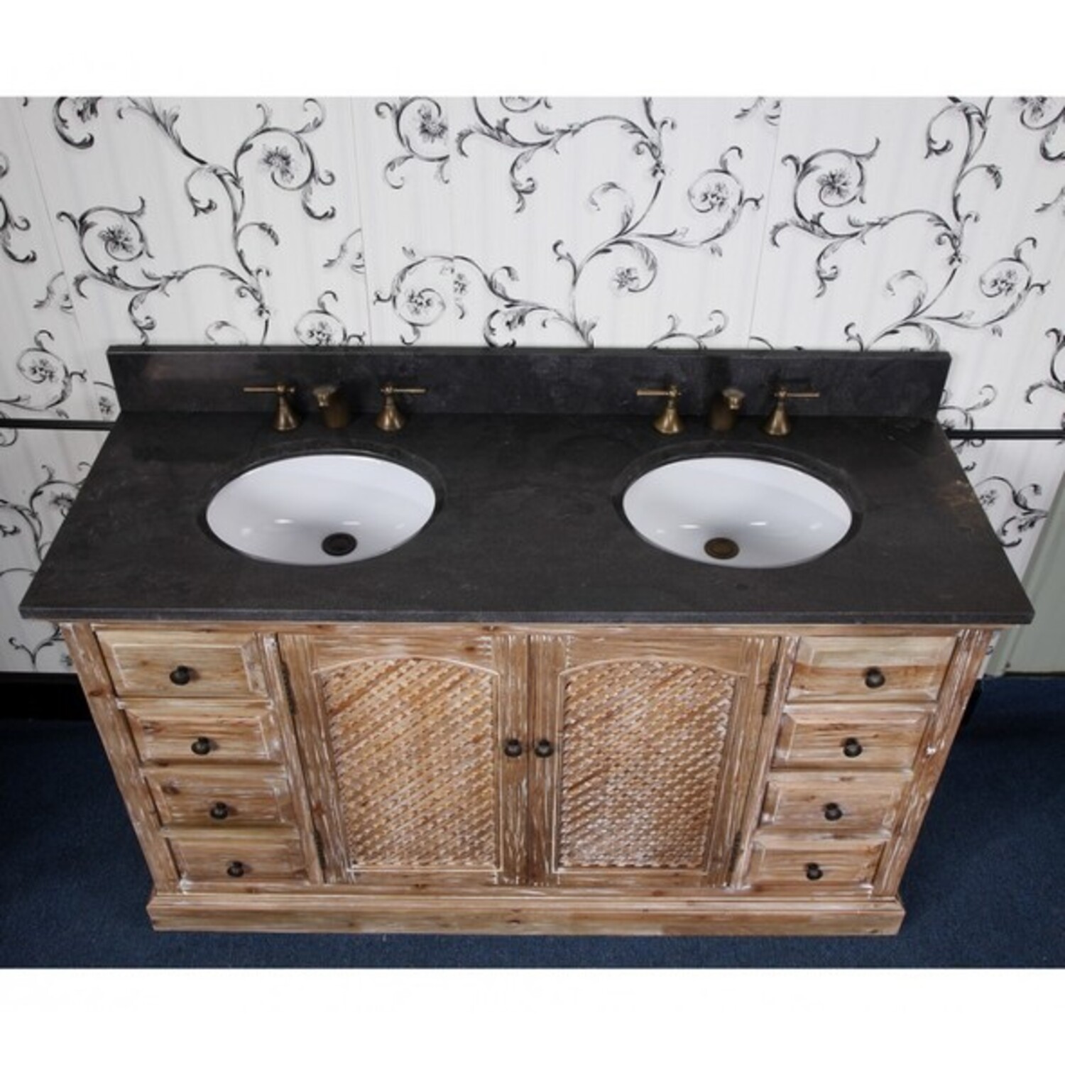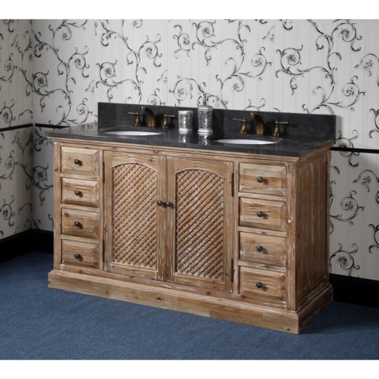 - Set includes: One (1) 61-inch marble top with double-sink, one (1) rustic style bathroom vanity, two (2) wall mirror, and one (1) linen tower