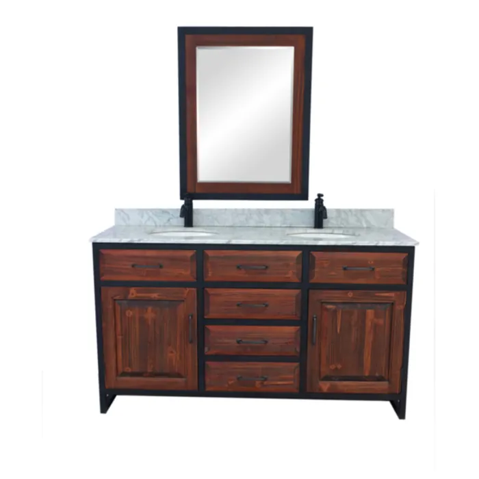 Infurniture 60" Rustic solid fir double sink iron frame vanity in brown with carrara white marble top-no faucet WK8860-BR-CW