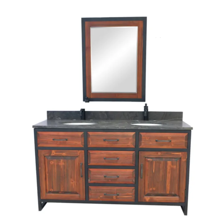Infurniture 60" Rustic solid fir double sink iron frame vanity in brown with limestone top-no faucet WK8860-BR-WK
