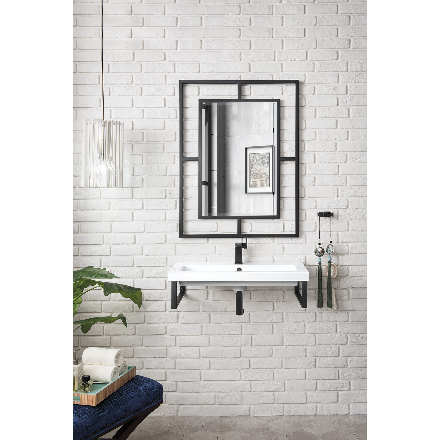 Minimalistic and bold, the design of the Boston floating console by James Martin Vanities will add a sleek look to any bathroom. The Matte Black metal framing creates an open view allowing for the appearance of expanded space. The compelling design of this piece with its substantial frame not only improves stability but also provides a location from which is perfect for hanging towels or washcloths. The smooth White Glossy Composite Stone integrated top and sink is a perfect match for this dynamic piece. The space saving design combines the multiple finishes of the metal structure to durable materials and compact dimensions, features found only in the most sophisticated bathroom.Two 15.25" stainless steel Matte Black wall brackets; one 31.5" Glossy White Composite Stone topHardware Finish: Matte BlackGlossy White Composite Stone integrated top and sink includedTop is pre-drilled for one single hole faucetWall-mounting hardware includedFaucet sold separatelyTake your bathroom from basic to beautifully minimalistic with the Boston by James Martin Vanities. This trendy floating console sink has clean lines and a bright white finish, while the open design of the frame makes the room appear more spacious and inviting. This elegant floating console sink will coordinate with a wide variety of different decors. While the architectural details in the design grant you a modern stylized composition.1 year warranty against manufacturer's defects. We will repair or replace any defective product, if the product is defective in material or workmanship at our discretion. No warranty is expressed or implied regarding damages resulting from consumer misuse.
