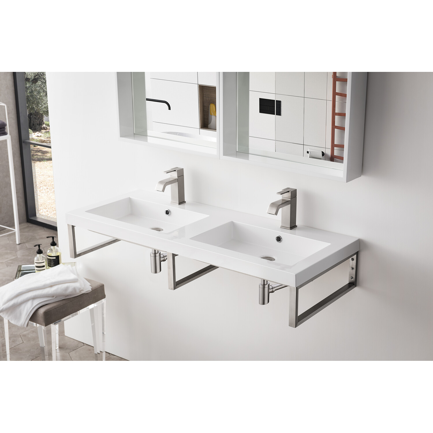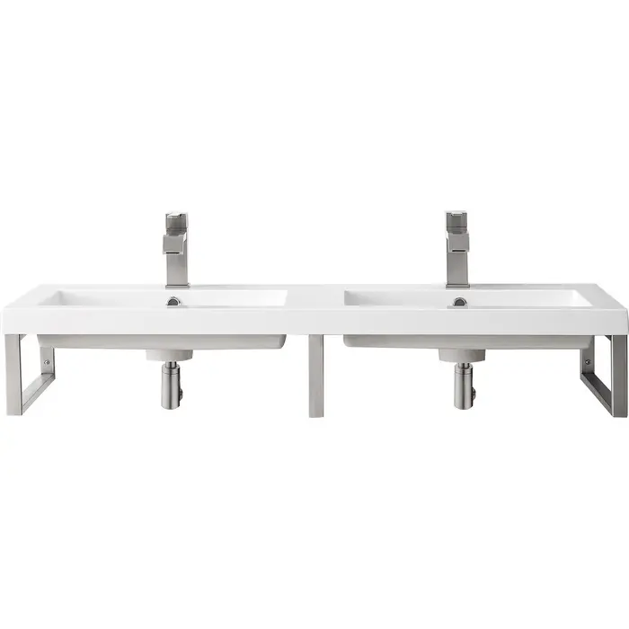 Minimalistic and bold, the design of the Boston floating console by James Martin Vanities will add a sleek look to any bathroom. The Brushed Nickel metal framing creates an open view allowing for the appearance of expanded space. The compelling design of this piece with its substantial frame not only improves stability but also provides a location from which is perfect for hanging towels or washcloths. The smooth White Glossy Composite Stone integrated top and sink is a perfect match for this dynamic piece. The space saving design combines the multiple finishes of the metal structure to durable materials and compact dimensions, features found only in the most sophisticated bathroom.Three 18" stainless steel Brushed Nickel wall brackets; one 47" Glossy White Composite Stone topHardware Finish: Brushed NickelGlossy White Composite Stone integrated top and sink includedTop is pre-drilled for one single hole faucetWall-mounting hardware includedFaucet sold separatelyTake your bathroom from basic to beautifully minimalistic with the Boston by James Martin Vanities. This trendy floating console sink has clean lines and a bright white finish, while the open design of the frame makes the room appear more spacious and inviting. This elegant floating console sink will coordinate with a wide variety of different decors. While the architectural details in the design grant you a modern stylized composition.1 year warranty against manufacturer's defects. We will repair or replace any defective product, if the product is defective in material or workmanship at our discretion. No warranty is expressed or implied regarding damages resulting from consumer misuse.