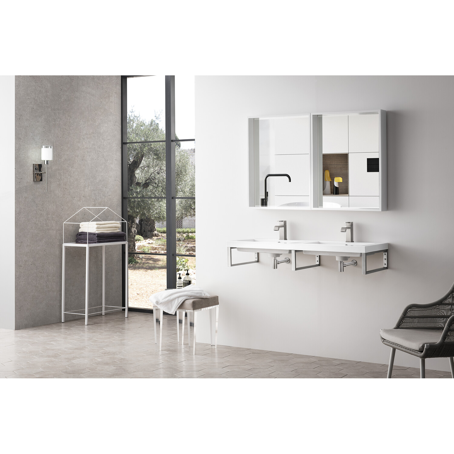 - Take your bathroom from basic to beautifully minimalistic with the Boston by James Martin Vanities. This trendy floating console sink has clean lines and a bright white finish, while the open design of the frame makes the room appear more spacious and inviting. This elegant floating console sink will coordinate with a wide variety of different decors. While the architectural details in the design grant you a modern stylized composition.