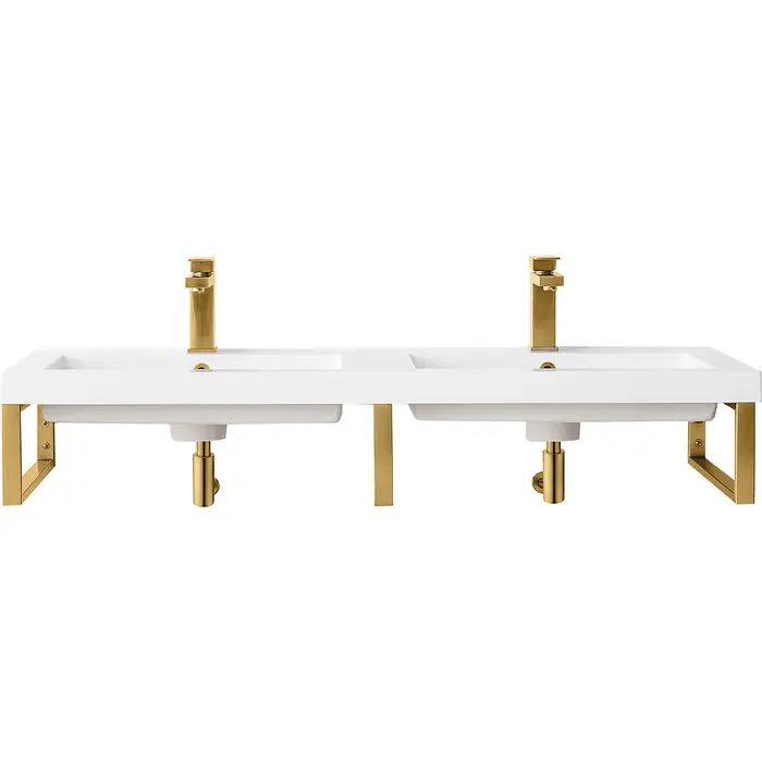 Minimalistic and bold, the design of the Boston floating console by James Martin Vanities will add a sleek look to any bathroom. The Radiant Gold metal framing creates an open view allowing for the appearance of expanded space. The compelling design of this piece with its substantial frame not only improves stability but also provides a location from which is perfect for hanging towels or washcloths. The smooth White Glossy Composite Stone integrated top and sink is a perfect match for this dynamic piece. The space saving design combines the multiple finishes of the metal structure to durable materials and compact dimensions, features found only in the most sophisticated bathroom.Three 18" stainless steel Radiant Gold wall brackets; one 47" Glossy White Composite Stone topHardware Finish: Radiant GoldGlossy White Composite Stone integrated top and sink includedTop is pre-drilled for one single hole faucetWall-mounting hardware includedFaucet sold separatelyTake your bathroom from basic to beautifully minimalistic with the Boston by James Martin Vanities. This trendy floating console sink has clean lines and a bright white finish, while the open design of the frame makes the room appear more spacious and inviting. This elegant floating console sink will coordinate with a wide variety of different decors. While the architectural details in the design grant you a modern stylized composition.1 year warranty against manufacturer's defects. We will repair or replace any defective product, if the product is defective in material or workmanship at our discretion. No warranty is expressed or implied regarding damages resulting from consumer misuse.