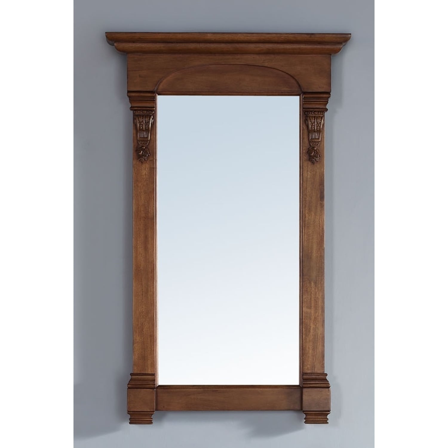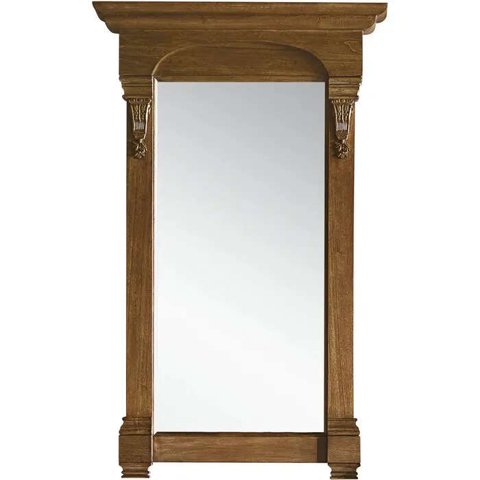 The Brookfield 26" Country Oak Mirror by James Martin Vanities is the perfect meeting of modern and traditional styles. Hand carved accenting filigrees showcase superior craftsmanship while clean lines make this mirror a piece that will compliment any room.26" Country Oak mirror is finished inside and out with a premium undercoat finish for superior moisture and UV resistance3mm glass thicknessWood Species: Poplar solidsPremium quality recessed keyhole style brackets for hangingThe Brookfield Collection by James Martin Vanities features hand carved accenting filigrees and raised panel doors. Various storage options including doors opening to shelves for storage and drawers. This collection is offered in a variety of finish colors. Each cabinet is configured to work with our variety of 3cm countertops. The look is completed with Antique Brass finish door and drawer pulls. A matching decorative wood backsplash is included with each cabinet.1 year warranty against manufacturer's defects. We will repair or replace any defective product, if the product is defective in material or workmanship at our discretion. No warranty is expressed or implied regarding damages resulting from consumer misuse.