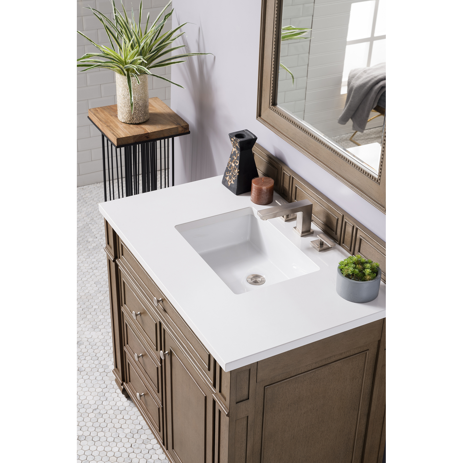 James Martin Bristol 36 inch Single Bathroom Vanity, Whitewashed Walnut w/ 3 CM White Zeus Quartz Top 157-V36-WW-3WZ