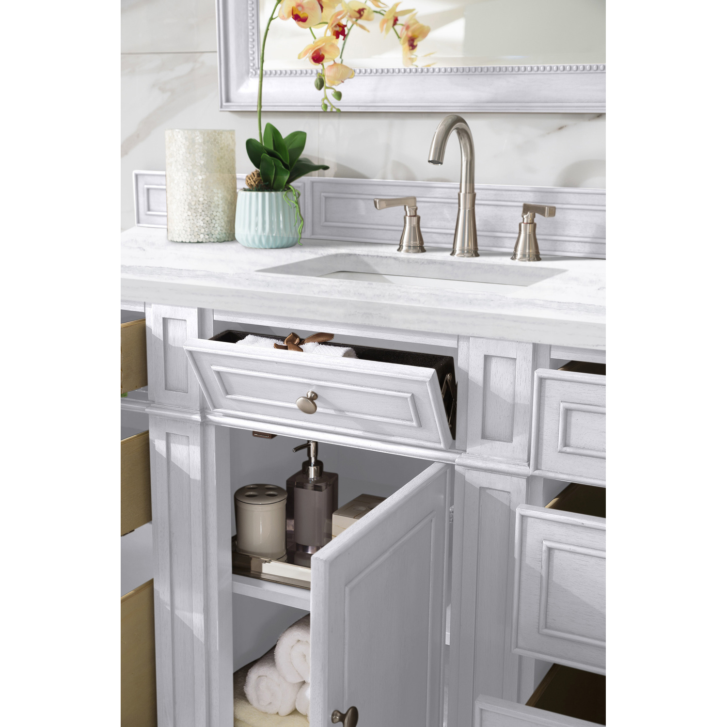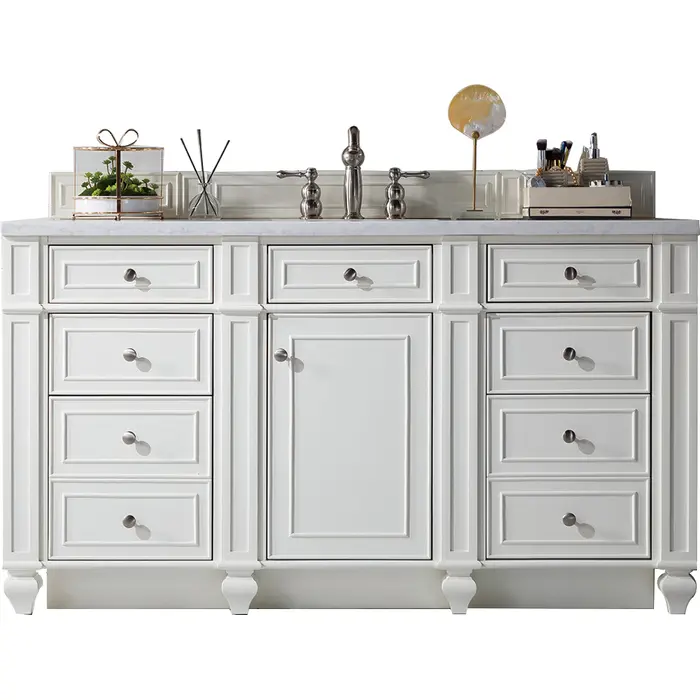 The Bristol 60" Bright White Single Vanity features a full plinth base, also known as a toe kick or pedestal base. This wraparound base allows for quick clean ups. This vanity is complimented by Satin Nickel door and drawer pulls, along with an optional wood backsplash. The look is completed with a 3 CM eased edge Arctic Fall Solid Surface top and one white ceramic rectangular sink.One door Bright White single vanity with seven drawers and interior shelf space; lower drawers are double-height; top outer drawers are tip-out styleHardware Finish: Satin NickelSolid kiln-dried Grade A hardwoodCabinet is finished inside and out with a premium undercoat finish for superior moisture and UV resistanceSoft-close undermount drawer glides and soft-close door hingesDrawer bottoms are lined with our signature brushed aluminum laminateMatching decorative wood backsplash is included3 CM eased edge Arctic Fall Solid Surface top and one white porcelain rectangular sinkCountertop is pre-drilled for one 3-hole 8" spreadFaucet sold separatelyThe Bristol Collection marries personality with function. This series was designed for maximum storage space and maximum ease of use. Directly behind the square “tulip” legs, we have crafted a full plinth base, also known as a toe kick or pedestal base. This wraparound base allows for quick clean ups, so it is perfect for high traffic use bathrooms. Bristol cabinets are constructed from kiln-dried Poplar and Mahogany hardwood solids and Poplar and American Walnut veneers. Cabinets are offered in four neutral, but far from boring finish options: Whitewashed Walnut, Bright White, Saddle Brown, and Vintage Vanilla. Satin Nickel finish knobs compliment the beautiful finishes, and coordinating wooden backsplashes complete the custom appearance of the cabinets.1 year warranty against manufacturer's defects. We will repair or replace any defective product, if the product is defective in material or workmanship at our discretion. No warranty is expressed or implied regarding damages resulting from consumer misuse.