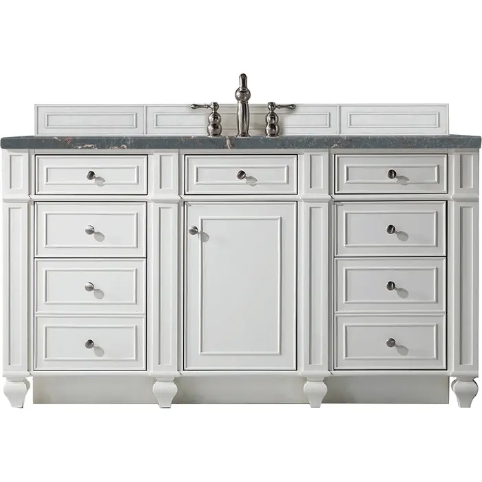 Detailed and distinctive, the Bristol 60” Single Vanity features recessed and raised picture frame molding. This single door cabinet with one shelf and seven drawers, lower drawers are "double height", top middle drawer is tip out style. Gracefully supported by tulip-shaped legs, this vanity offers a mix of craftsmanship and functionality. This distinguished vanity is enhanced by the Parisien Bleu Silestone top, offering a deep bluish hue with broad and intricate neutral veins highlighted by fine coppery accents.Vanity set includes a 3cm eased edge Parisien Bleu Silestone top, which includes one white porcelain rectangular undermount sink that ships separately, as well as mounting brackets for easy installation. The top is pre-drilled for an 8" widespread faucet.One door Bright White single vanity with seven drawers and interior shelf space; lower drawers are double-height; top outer drawers are tip-out styleConstructed with a solid Para wood solid frame, Plywood panels that are covered with solid Black Walnut veneers.Drawer boxes are constructed using English Dovetail joinery, feature soft-close undermount glides and a Brushed Aluminum laminate drawer bottom.Satin Nickel hardwareIncludes one removable Bamboo drawer organizer trayMatching decorative wood backsplash is includedFaucet sold separatelyCountertop is pre-drilled for one 3-hole 8" spreadThe Bristol Collection marries personality with function. This series was designed for maximum storage space and maximum ease of use. Directly behind the square “tulip” legs, we have crafted a full plinth base, also known as a toe kick or pedestal base. This wraparound base allows for quick clean ups, so it is perfect for high traffic use bathrooms. Bristol cabinets are constructed from kiln-dried Poplar and Mahogany hardwood solids and Poplar and American Walnut veneers. Cabinets are offered in four neutral, but far from boring finish options: Whitewashed Walnut, Bright White, Saddle Brown, and Vintage Vanilla. Satin Nickel finish knobs compliment the beautiful finishes, and coordinating wooden backsplashes complete the custom appearance of the cabinets.1 year warranty against manufacturer's defects. We will repair or replace any defective product, if the product is defective in material or workmanship at our discretion. No warranty is expressed or implied regarding damages resulting from consumer misuse.