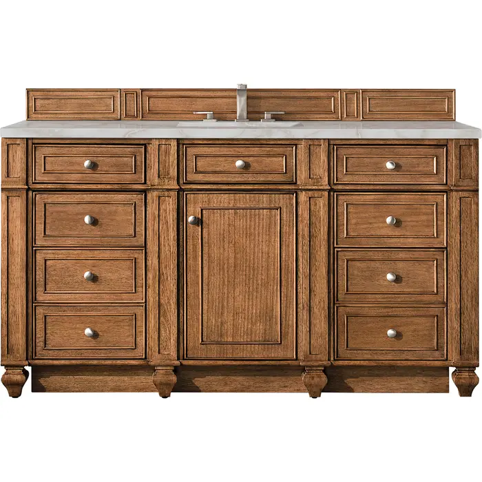 The Bristol 60" Saddle Brown Single Vanity by James Martin Vanities is a perfect blend of elegance and practicality for your bathroom. This detailed and distinctive vanity is designed with ample storage, featuring one top-row tip-out drawer, six full-extension aluminum laminate-lined drawers, and one door that opens to reveal an internal shelf. Satin Nickel door and drawer pulls add a touch of modern elegance, while the tulip legs optional wood backsplash provides an additional decorative element. The cabinet is topped with a 3 CM Silestone® Victorian Silver countertop, with a white porcelain undermount rectangular sink. This unit is enabled with FreePower wireless charging; featuring a single-device charger seamlessly embedded into the countertop, indicated by a light-up halo to the left of the sink. Designed for modern living, FreePower offers convenient, integrated, wireless charging when and where you need it.FreePower Wireless Charging; single-device unit left of sinkOne-door cabinet with six full extension drawers (two double-deep) and one top-row tip-out drawerDrawer boxes feature English Dovetail joinery with premium, soft-close undermount drawer slides; doors feature soft-close, adjustable door hingesCabinet features a multi-stage premium finish coat to offer UV and moisture resistanceSaddle Brown finish with Satin Nickel hardwareCountertop is pre-drilled for 8" widespread faucet(s); our 3cm eased edge countertops come with white porcelain rectangular sink(s) that ship separately and include mounting brackets for easy installationFaucet sold separatelyDrawers lined with our signature brushed aluminum laminate for easy cleaningTop-row tip-out drawerComes with optional, coordinating wood backsplash; matching stone backsplash available as add-on purchaseFreestanding VanityDetailed and distinctive, the Bristol Collection by James Martin Vanities features recessed and raised picture frame molding. Gracefully supported by tulip-shaped legs, this collection offers the perfect mix of craftsmanship and functionality. Available in three finishes and five sizes, Bristol can complement a variety of decors.1 year warranty against manufacturer's defects. We will repair or replace any defective product, if the product is defective in material or workmanship at our discretion. No warranty is expressed or implied regarding damages resulting from consumer misuse.