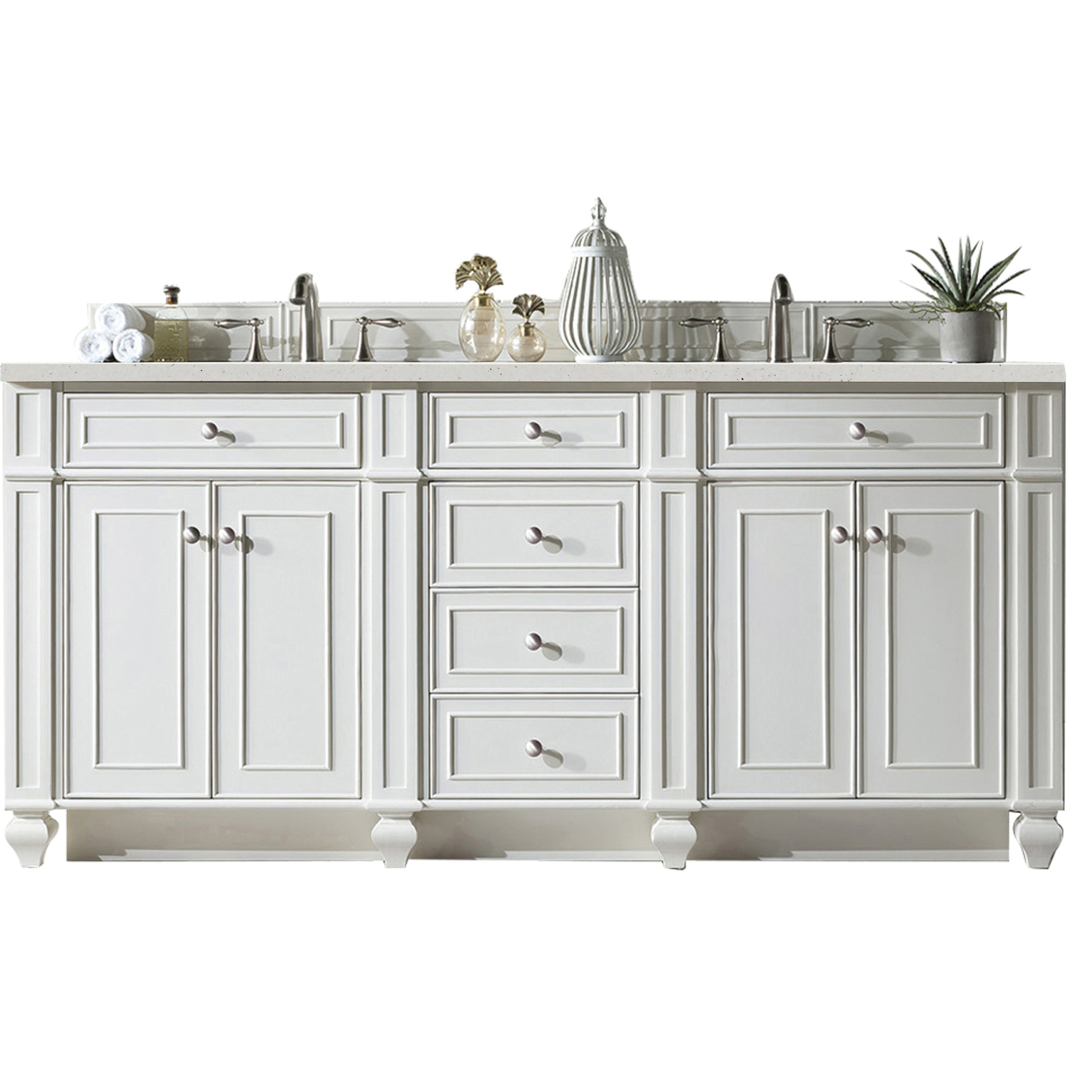 Detailed and distinctive, the Bristol 72” Double Vanity in Bright White features recessed and raised picture frame molding. This four-door cabinet with two shelves and six drawers, top outside drawers are tip out style. Gracefully supported by tulip-shaped legs, this vanity offers a mix of craftsmanship and functionality. This distinguished vanity is enhanced by the Parisien Bleu Silestone top, offering a deep bluish hue with broad and intricate neutral veins highlighted by fine coppery accents.Vanity set includes a 3cm eased edge Parisien Bleu Silestone top, which includes two white porcelain rectangular undermount sinks that ship separately, as well as mounting brackets for easy installation. The top is pre-drilled for two 8" widespread faucetFour door Bright White double vanity with six drawers and interior shelf space; top outside drawers are tip-out styleConstructed with a solid Para wood solid frame, Plywood panels that are covered with solid Black Walnut veneers.Drawer boxes are constructed using English Dovetail joinery, feature soft-close undermount glides and a Brushed Aluminum laminate drawer bottom.Satin Nickel hardwareIncludes one removable Bamboo drawer organizer trayMatching decorative wood backsplash is includedFaucets sold separatelyCountertop is pre-drilled for two 3-hole 8" spreadsThe Bristol Collection marries personality with function. This series was designed for maximum storage space and maximum ease of use. Directly behind the square “tulip” legs, we have crafted a full plinth base, also known as a toe kick or pedestal base. This wraparound base allows for quick clean ups, so it is perfect for high traffic use bathrooms. Bristol cabinets are constructed from kiln-dried Poplar and Mahogany hardwood solids and Poplar and American Walnut veneers. Cabinets are offered in four neutral, but far from boring finish options: Whitewashed Walnut, Bright White, Saddle Brown, and Vintage Vanilla. Satin Nickel finish knobs compliment the beautiful finishes, and coordinating wooden backsplashes complete the custom appearance of the cabinets.1 year warranty against manufacturer's defects. We will repair or replace any defective product, if the product is defective in material or workmanship at our discretion. No warranty is expressed or implied regarding damages resulting from consumer misuse.