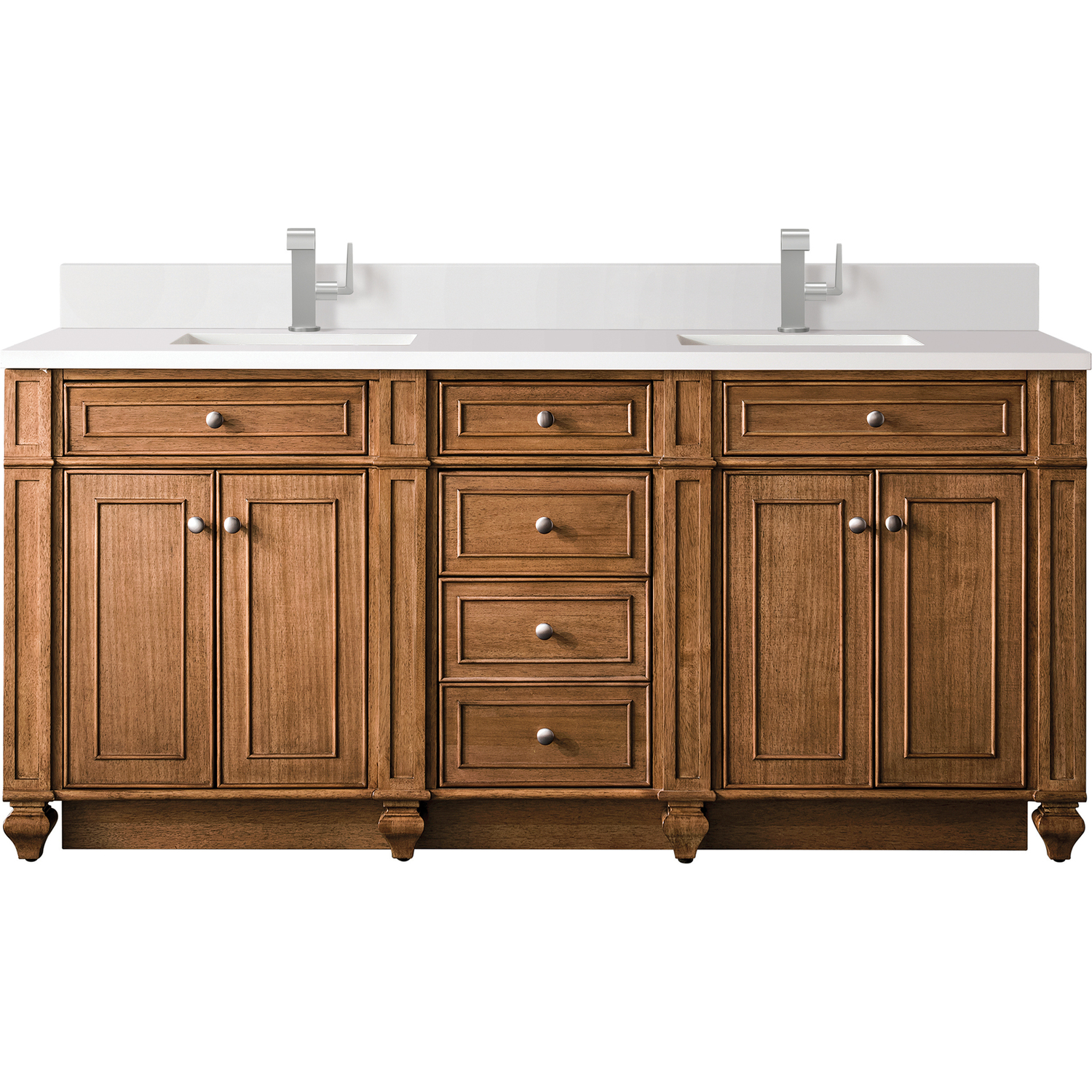 Detailed and distinctive, the Bristol 72” Double Vanity in Saddle Brown features recessed and raised picture frame molding. This four-door cabinet with two shelves and six drawers, top outside drawers are tip out style. Gracefully supported by tulip-shaped legs, this vanity offers a mix of craftsmanship and functionality. The timeless, White Zeus Silestone top and backsplash provides a contemporary touch, or choose to use the top with included wood backsplash.Vanity set includes a 3cm eased edge White Zeus Silestone top with matching backsplash, two white porcelain rectangular sinks and mounting brackets for easy installation. Top is pre-drilled for two single hole faucets. Faucets not included.Four door Saddle Brown double vanity with six drawers and interior shelf space; top outside drawers are tip-out styleConstructed with a solid Para wood solid frame, Plywood panels that are covered with solid Black Walnut veneers.Drawer boxes are constructed using English Dovetail joinery, feature soft-close undermount glides and a Brushed Aluminum laminate drawer bottom.Satin Nickel hardwareIncludes one removable Bamboo drawer organizer trayMatching White Zeus 3cm Silestone backsplash & decorative wood backsplash included.Faucets sold separatelyThe Bristol Collection marries personality with function. This series was designed for maximum storage space and maximum ease of use. Directly behind the square “tulip” legs, we have crafted a full plinth base, also known as a toe kick or pedestal base. This wraparound base allows for quick clean ups, so it is perfect for high traffic use bathrooms. Bristol cabinets are constructed from kiln-dried Poplar and Mahogany hardwood solids and Poplar and American Walnut veneers. Cabinets are offered in four neutral, but far from boring finish options: Whitewashed Walnut, Bright White, Saddle Brown, and Vintage Vanilla. Satin Nickel finish knobs compliment the beautiful finishes, and coordinating wooden backsplashes complete the custom appearance of the cabinets.1 year warranty against manufacturer's defects. We will repair or replace any defective product, if the product is defective in material or workmanship at our discretion. No warranty is expressed or implied regarding damages resulting from consumer misuse.
