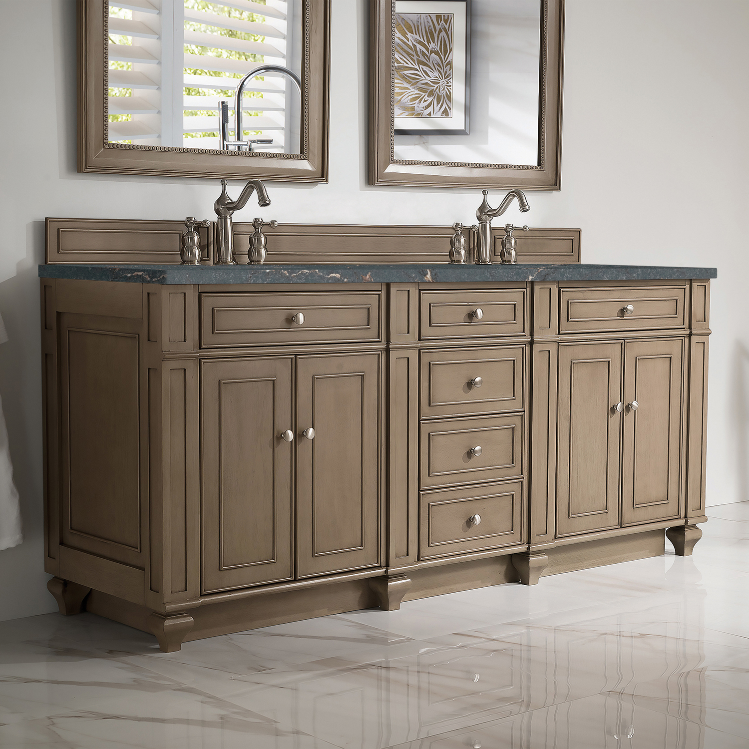 James Martin Bristol 72 inch Double Vanity, Whitewashed Walnut w/ 3 CM Parisien Bleu Quartz Top, 840108967627, 157-V72-WW-3PBL