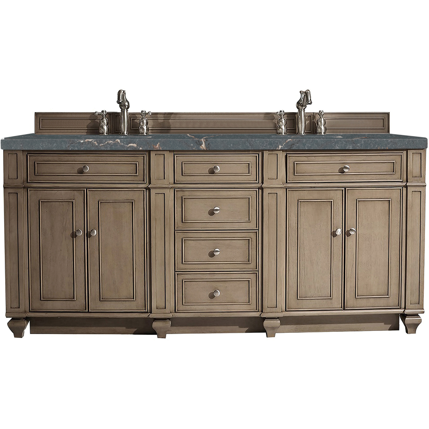 Detailed and distinctive, the Bristol 72” Double Vanity in Whitewashed Walnut features recessed and raised picture frame molding. This four-door cabinet with two shelves and six drawers, top outside drawers are tip out style. Gracefully supported by tulip-shaped legs, this vanity offers a mix of craftsmanship and functionality. This distinguished vanity is enhanced by the Parisien Bleu Silestone top, offering a deep bluish hue with broad and intricate neutral veins highlighted by fine coppery accents.Vanity set includes a 3cm eased edge Parisien Bleu Silestone top, which includes two white porcelain rectangular undermount sinks that ship separately, as well as mounting brackets for easy installation. The top is pre-drilled for two 8" widespread faucetFour door Whitewashed Walnut double vanity with six drawers and interior shelf space; top outside drawers are tip-out styleConstructed with a solid Para wood solid frame, Plywood panels that are covered with solid Black Walnut veneers.Drawer boxes are constructed using English Dovetail joinery, feature soft-close undermount glides and a Brushed Aluminum laminate drawer bottom.Satin Nickel hardwareIncludes one removable Bamboo drawer organizer trayMatching decorative wood backsplash is includedFaucets sold separatelyCountertop is pre-drilled for two 3-hole 8" spreadsThe Bristol Collection marries personality with function. This series was designed for maximum storage space and maximum ease of use. Directly behind the square “tulip” legs, we have crafted a full plinth base, also known as a toe kick or pedestal base. This wraparound base allows for quick clean ups, so it is perfect for high traffic use bathrooms. Bristol cabinets are constructed from kiln-dried Poplar and Mahogany hardwood solids and Poplar and American Walnut veneers. Cabinets are offered in four neutral, but far from boring finish options: Whitewashed Walnut, Bright White, Saddle Brown, and Vintage Vanilla. Satin Nickel finish knobs compliment the beautiful finishes, and coordinating wooden backsplashes complete the custom appearance of the cabinets.1 year warranty against manufacturer's defects. We will repair or replace any defective product, if the product is defective in material or workmanship at our discretion. No warranty is expressed or implied regarding damages resulting from consumer misuse.