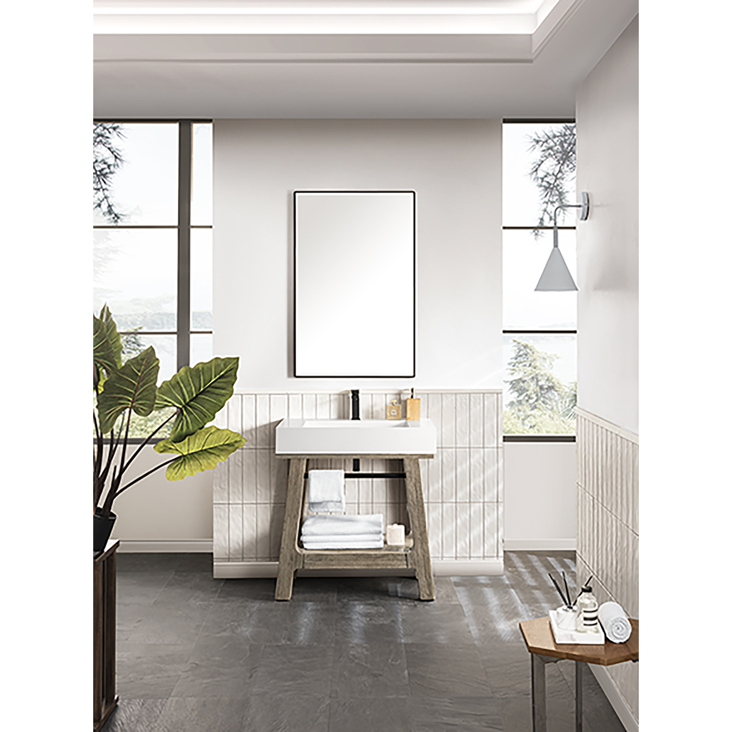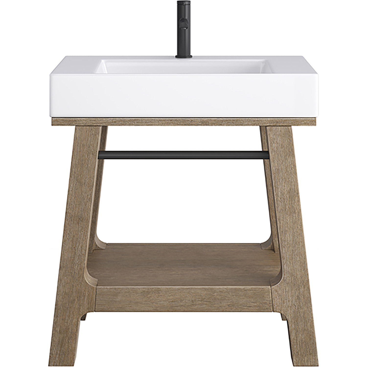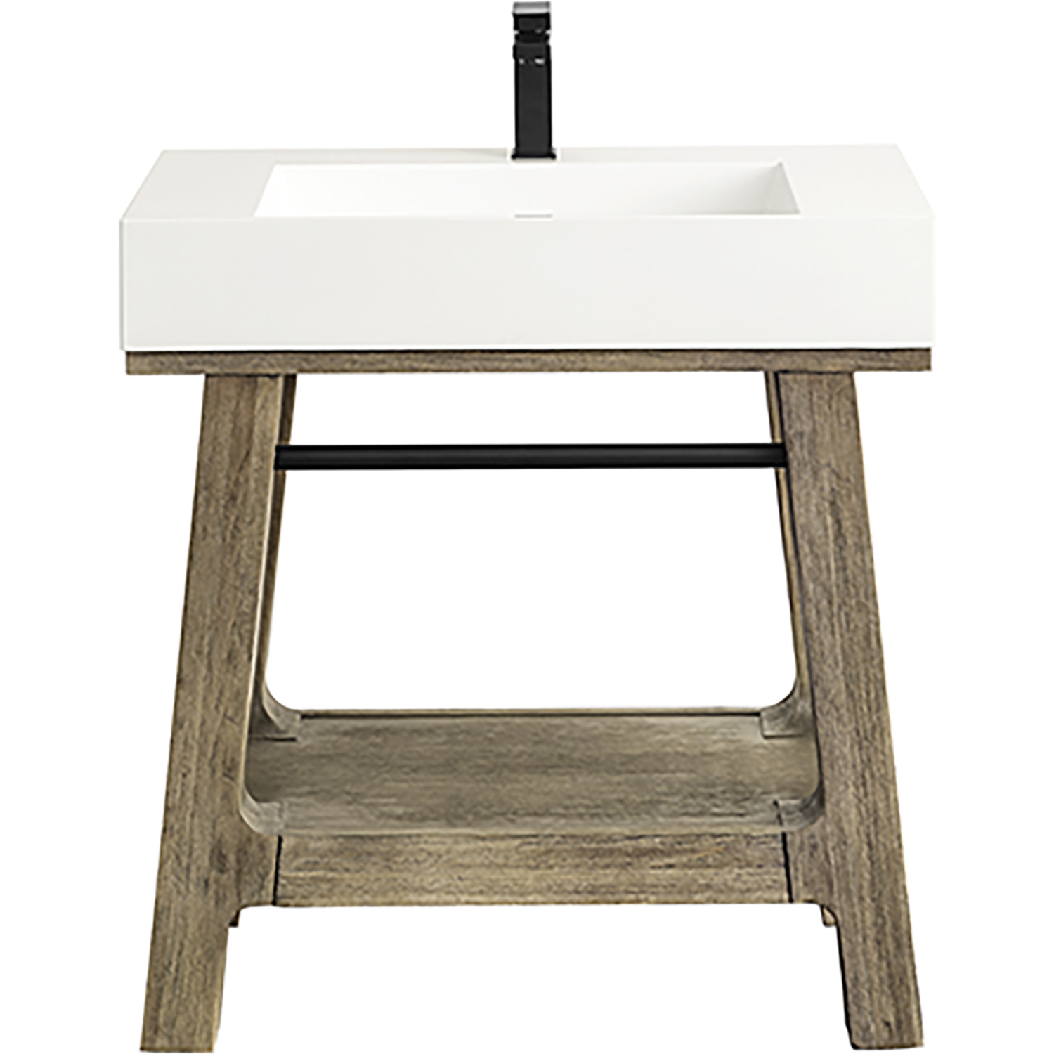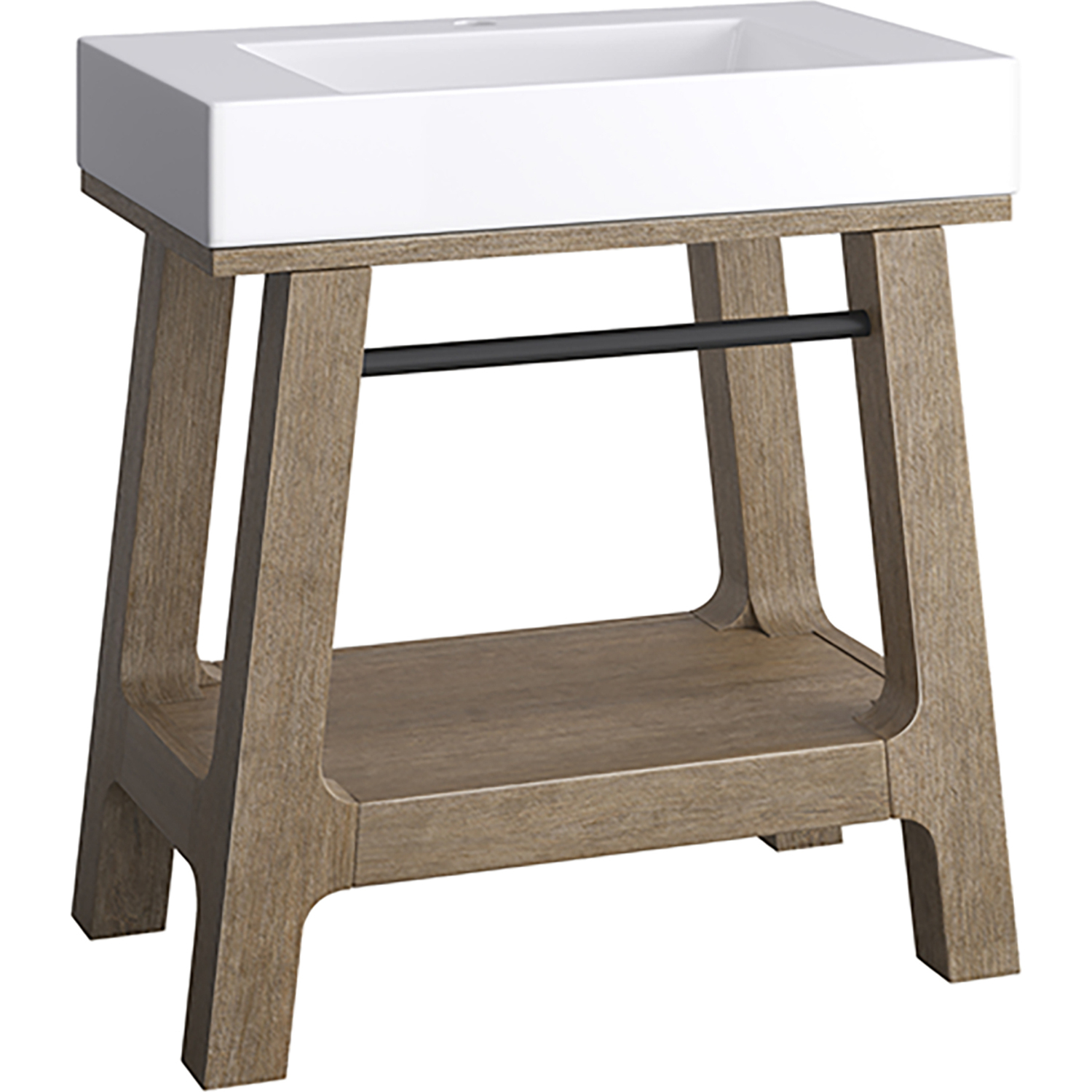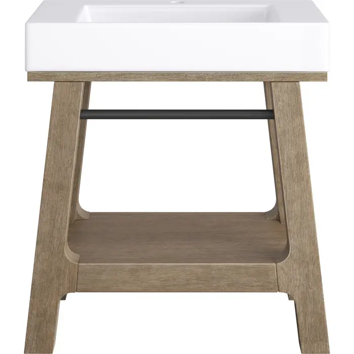 A blend of rustic and Scandinavian design, the 31.5" Auburn console vanity has a modern shape that features rugged yet elegant details. The wire-brushed finish showcases natural texture and wood grains with subtle distressing. The smooth, high-profile integrated Composite Stone sink top in Glossy White adds an unexpected modern texture. The integrated Matte Black towel bar and shelf serve as functional and decorative storage for towels and bath accessories.Solid Poplar wood frame with Poplar veneers over a plywood core, sealed with our premium moisture and UV resistant coatingsThe 31.5" sinktop features a sloped, trough-style basin with a removable drain cover that blends seamlessly with the sink while still allowing water to pass through. The integrated basin is fabricated from durable, antibacterial composite stone.Sink is pre-drilled for a single hole faucetConsole frame base with integrated sink topSink has 5" of counter space on either side and at the 4-1/2" in the backConsole frame arrives full assembledSink top ships in a separate cartonA blend of rustic and Scandinavian design, the Auburn Console Vanity has a modern shape that features rugged yet elegant details. The wire-brushed finish showcases natural texture and wood grains with subtle distressing. The smooth, high-profile integrated composite sink top, available in Glossy White or Matte Black, adds an unexpected modern texture while the tapered frame adds visual interest.1 year warranty against manufacturer's defects. We will repair or replace any defective product, if the product is defective in material or workmanship at our discretion. No warranty is expressed or implied regarding damages resulting from consumer misuse.