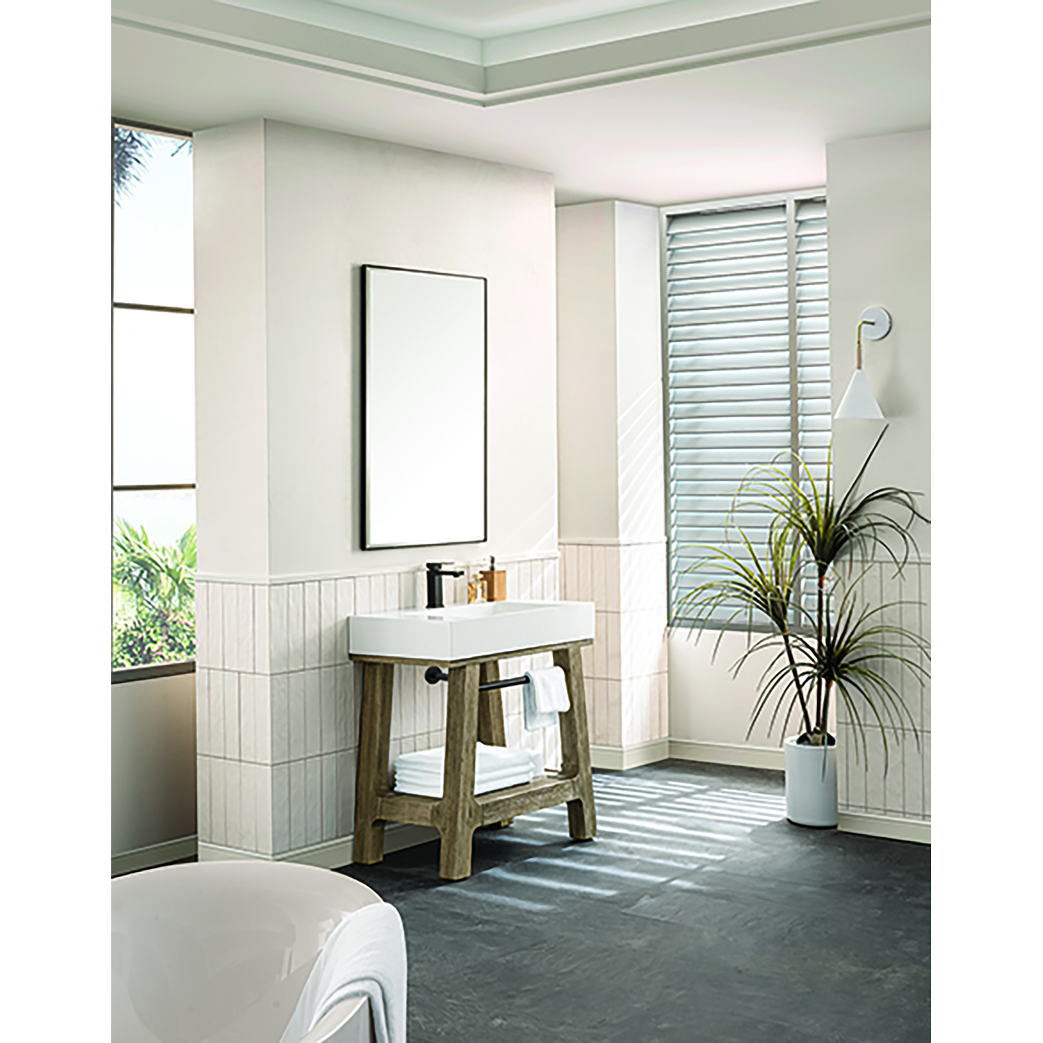 - A blend of rustic and Scandinavian design, the Auburn Console Vanity has a modern shape that features rugged yet elegant details. The wire-brushed finish showcases natural texture and wood grains with subtle distressing. The smooth, high-profile integrated composite sink top, available in Glossy White or Matte Black, adds an unexpected modern texture while the tapered frame adds visual interest.