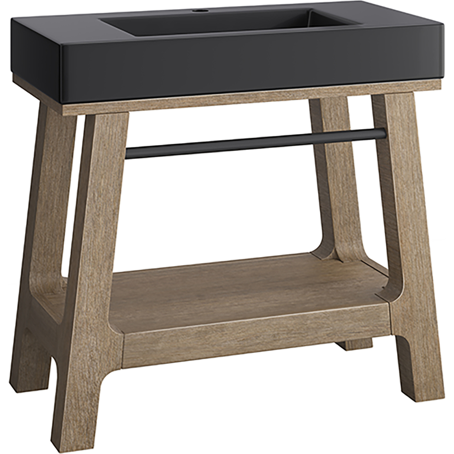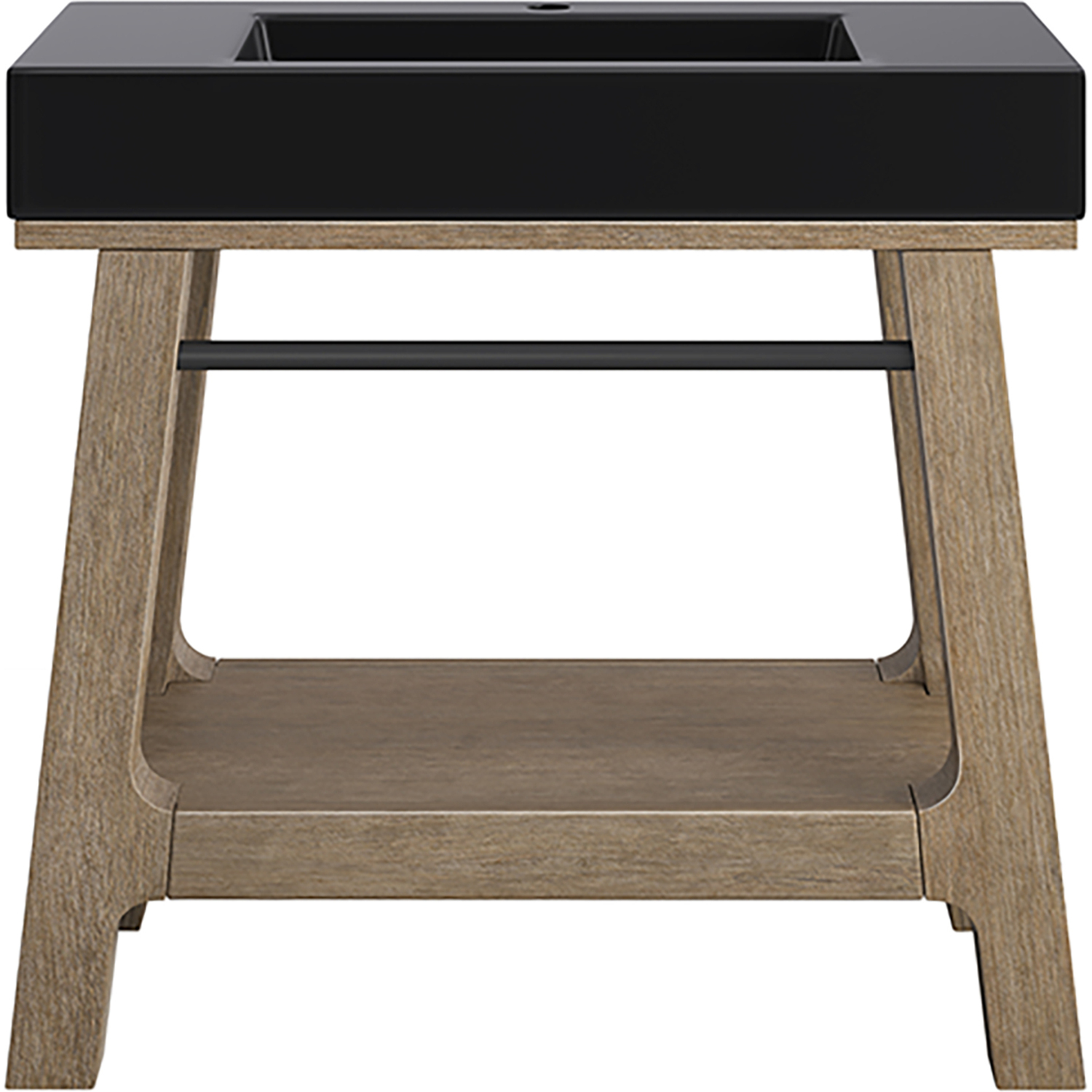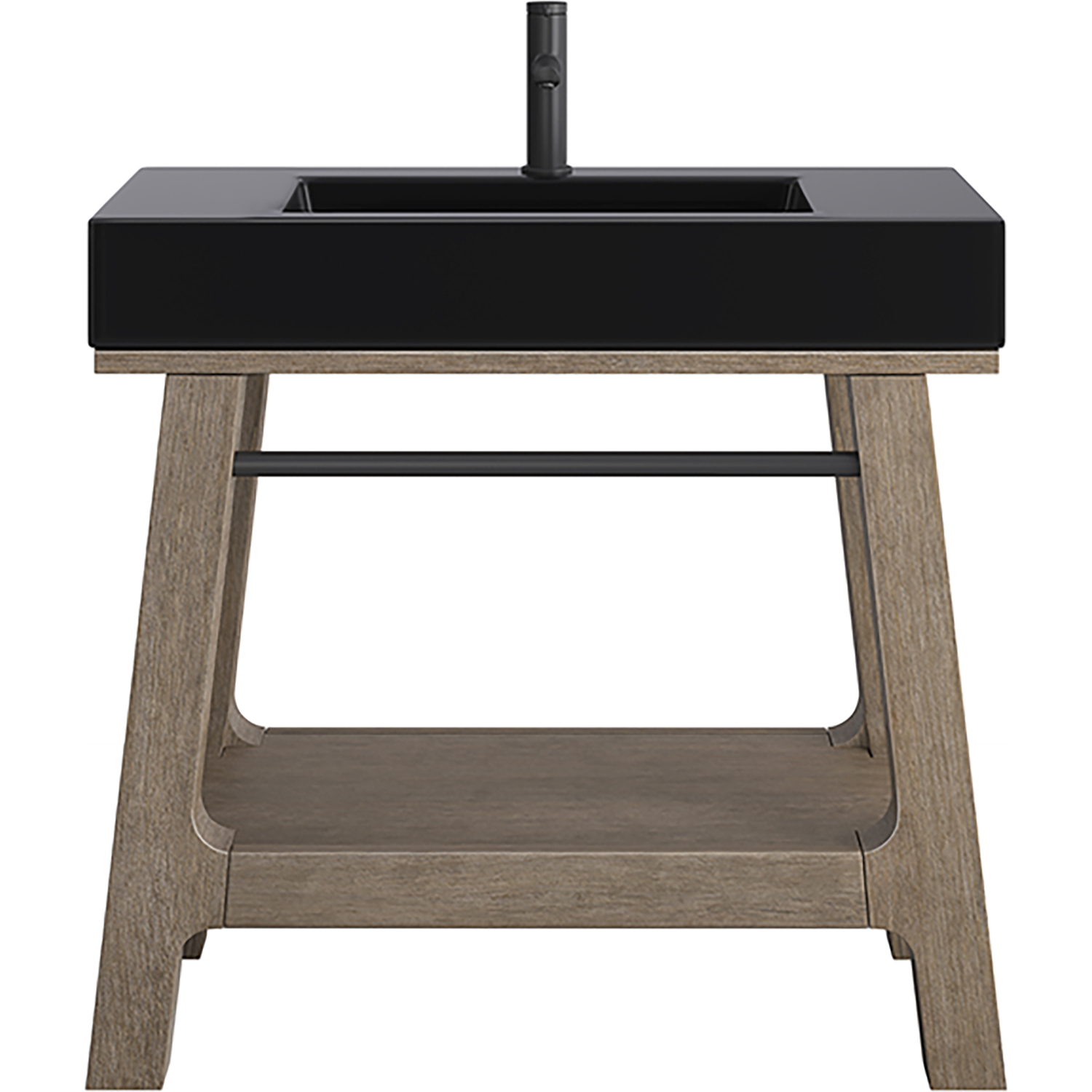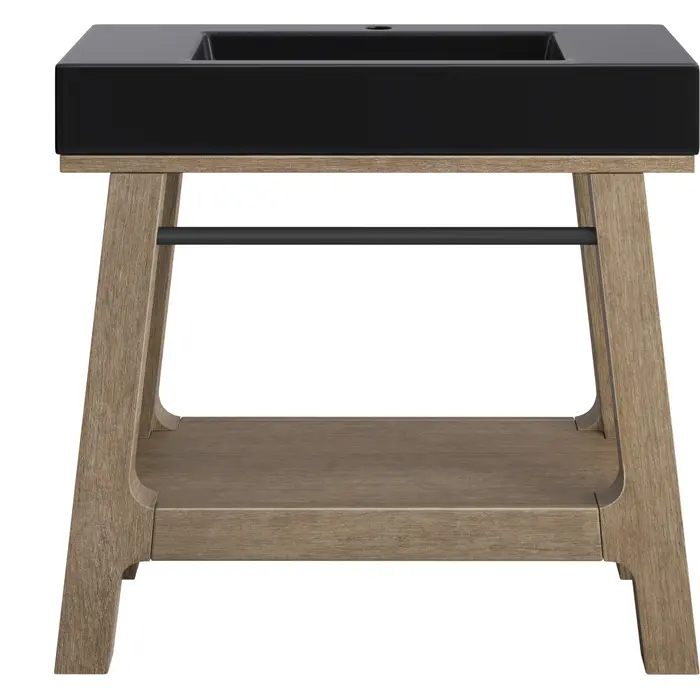 A blend of rustic and Scandinavian design, the 36" Auburn console vanity has a modern shape that features rugged yet elegant details. The wire-brushed finish showcases natural texture and wood grains with subtle distressing. The smooth, high-profile integrated Composite Stone sink top in Black Matte adds an unexpected modern texture. The integrated Matte Black towel bar and shelf serve as functional and decorative storage for towels and bath accessories.Solid Poplar wood frame with Poplar veneers over a plywood core, sealed with our premium moisture and UV resistant coatingsThe 36" sinktop features a square, flat-shaped basin, fabricated from durable, antibacterial composite stone.Sink is pre-drilled for a single hole faucetConsole frame base with integrated sink topSinktop has 7-7/8" of counter space on either side and at the 4-7/8" in the backConsole frame arrives full assembledSink top ships in a separate cartonA blend of rustic and Scandinavian design, the Auburn Console Vanity has a modern shape that features rugged yet elegant details. The wire-brushed finish showcases natural texture and wood grains with subtle distressing. The smooth, high-profile integrated composite sink top, available in Glossy White or Matte Black, adds an unexpected modern texture while the tapered frame adds visual interest.1 year warranty against manufacturer's defects. We will repair or replace any defective product, if the product is defective in material or workmanship at our discretion. No warranty is expressed or implied regarding damages resulting from consumer misuse.