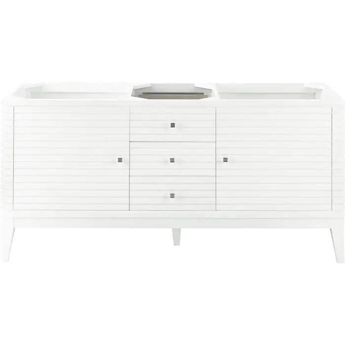 The Linear 59" Glossy White Double Vanity features spacious storage options with two doors, two shelves, and three drawers. Cabinet exterior is made from poplar solids, highlighted by clean lines and Satin Nickel finish knobs. Premium features include one faux shagreen drawer organizer and one 120 Volt UL Rated electrical component with two electrical and two USB outlets. The recessed interior drawer is designed to only extend and open half way.Two door Glossy White double vanity cabinet with two drawers and interior shelf spaceHardware Finish: Satin NickelSolid kiln-dried Grade A hardwoodCabinet is finished inside and out with a premium undercoat finish for superior moisture and UV resistanceSoft-close undermount drawer glides and soft-close door hingesDrawer bottoms are lined with our signature brushed aluminum laminateOne 120 Volt UL rated electrical component with two electrical and two USB (2.0) outletsOne faux shagreen drawer organizerCabinet only, countertop not includedThe Linear 210 series has three cabinet widths: 36” 59” and 72” The wider cabinets: 59” and 72” features a component with electrical and USB outlets and a faux shagreen drawer organizer. Cabinets are constructed with premium hardwood plywood cores with solid wood braces and brackets. The Glossy White cabinet exterior is made from solid Birch and Poplar, while exteriors of both walnut color finishes (WLT and WWW) are crafted from solid American Walnut. The 210 series also features custom sized solid surface countertops with integrated basins.1 year warranty against manufacturer's defects. We will repair or replace any defective product, if the product is defective in material or workmanship at our discretion. No warranty is expressed or implied regarding damages resulting from consumer misuse.