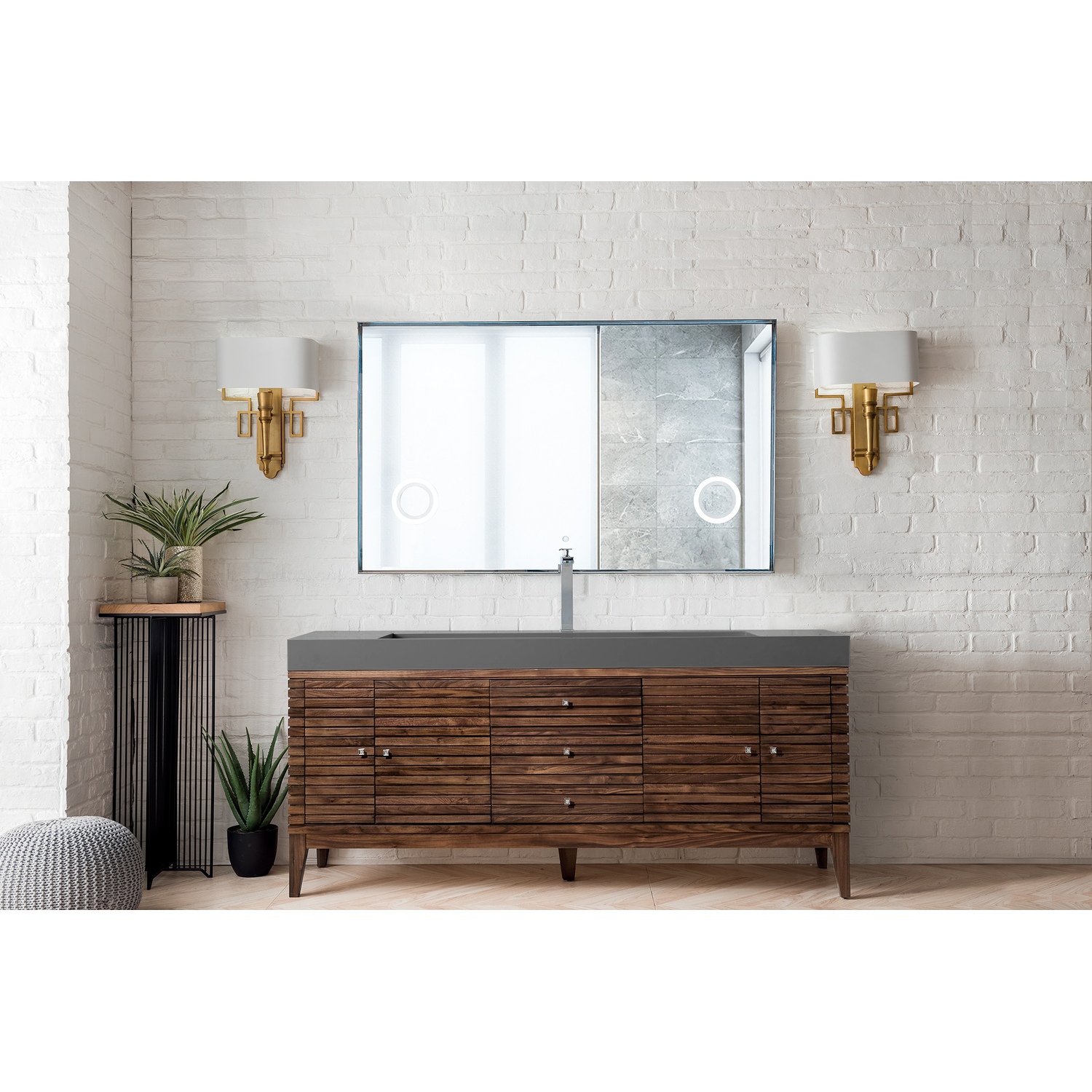 The Linear 72" Mid-Century Walnut Single Vanity features spacious storage options with four doors, two shelves, and three drawers. Cabinet exterior is made from solid American Walnut, highlighted by clean lines and Satin Nickel finish knobs. Premium features include one faux shagreen drawer organizer and one 120 Volt UL Rated electrical component with two electrical and two USB outlets. The look is completed with a Dusk Grey Glossy Composite Stone integrated top and sink. The recessed interior drawer is designed to only extend and open half way.Four door Mid-Century Walnut single vanity with two shelves and interior shelf space; top two drawers are U-shaped to allow for storage as well as plumbingHardware Finish: Satin NickelSolid kiln-dried Grade A hardwoodCabinet is finished inside and out with a premium undercoat finish for superior moisture and UV resistanceSoft-close undermount drawer glides and soft-close door hingesDrawer bottoms are lined with our signature brushed aluminum laminateOne 120 Volt UL rated electrical component with two electrical and two USB (2.0) outletsOne faux shagreen drawer organizerDusk Grey Glossy Composite Stone integrated top and sink includedFaucet sold separatelyCountertop is pre-drilled for one single hole faucetThe Linear 210 series has three cabinet widths: 36” 59” and 72” The wider cabinets: 59” and 72” features a component with electrical and USB outlets and a faux shagreen drawer organizer. Cabinets are constructed with premium hardwood plywood cores with solid wood braces and brackets. The Glossy White cabinet exterior is made from solid Birch and Poplar, while exteriors of both walnut color finishes (WLT and WWW) are crafted from solid American Walnut. The 210 series also features custom sized composite countertops with integrated basins.1 year warranty against manufacturer's defects. We will repair or replace any defective product, if the product is defective in material or workmanship at our discretion. No warranty is expressed or implied regarding damages resulting from consumer misuse.