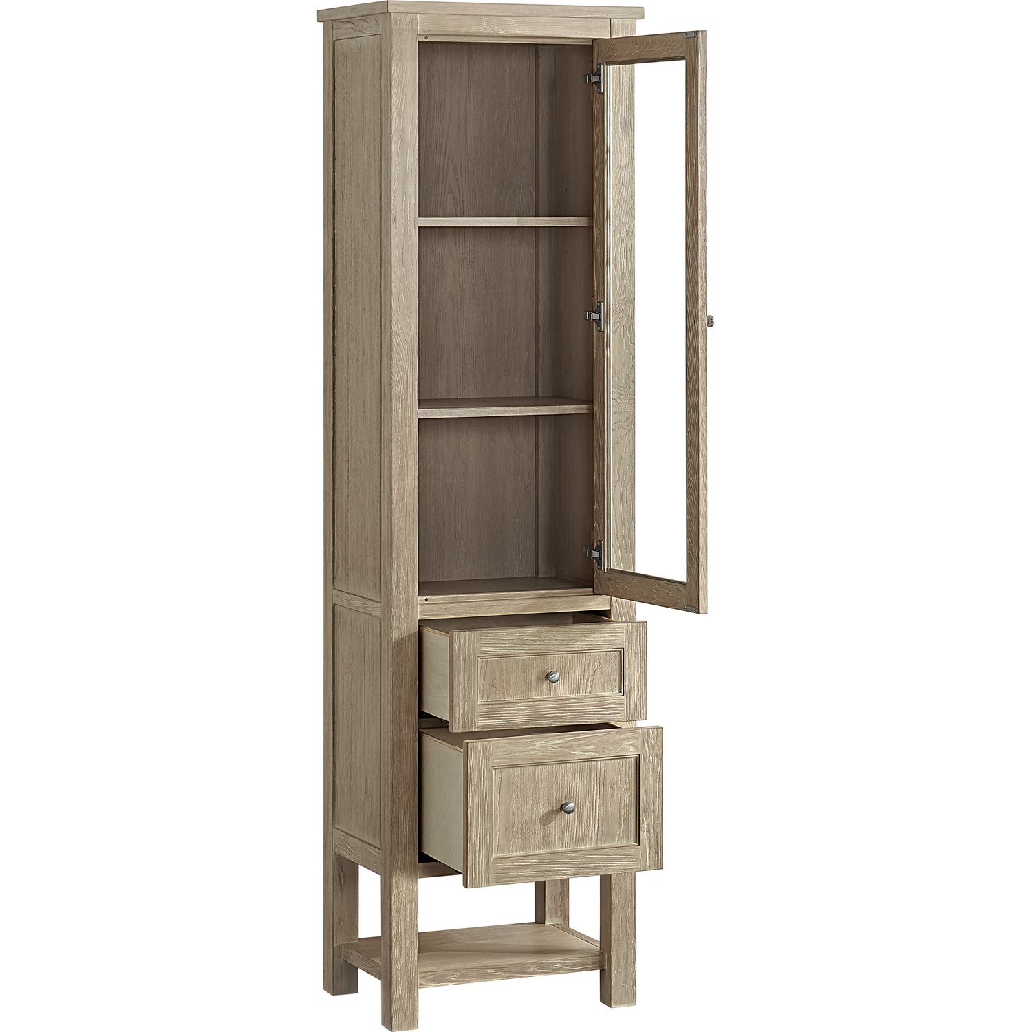The Breckenridge 22" Linen Cabinet is a fresh take on traditional Mission furniture that easily transitions to Modern Farmhouse style with an air of understated sophistication. The neatly inset drawer fronts maintain the symmetry of the Shaker aesthetic and help highlight the beautiful wood grain of the Whitewashed Oak finish. A single reversible door, allowing for left or right opening installation, is inset with premium clear glass and opens to two adjustable shelves where you can show off your bathroom essentials. Two full-extension drawers and an open lower shelf offer additional storage. Designed with both form and function in mind, the Breckenridge Linen Cabinet comes with all three hardware options for additional customization.Single reversible glass-paned door with two adjustable shelves and two full-extension drawersDrawer boxes feature English Dovetail joinery with premium, soft-close undermount drawer slides; doors feature soft-close, adjustable door hingesCabinet features a multi-stage premium finish coat to offer UV and moisture resistanceWhitewashed Oak finishLinen Cabinet comes with all three hardware options (Satin Nickel, Champagne Brass, and Matte Black)Drawers lined with our signature brushed aluminum laminate for easy cleaningFreestanding Linen CabinetA fresh take on traditional Mission furniture, the Breckenridge Collection easily transitions to Modern Farmhouse style with an air of understated sophistication. With clean lines and a chic design, this mirror is destined to become a classic.1 year warranty against manufacturer's defects. We will repair or replace any defective product, if the product is defective in material or workmanship at our discretion. No warranty is expressed or implied regarding damages resulting from consumer misuse.
