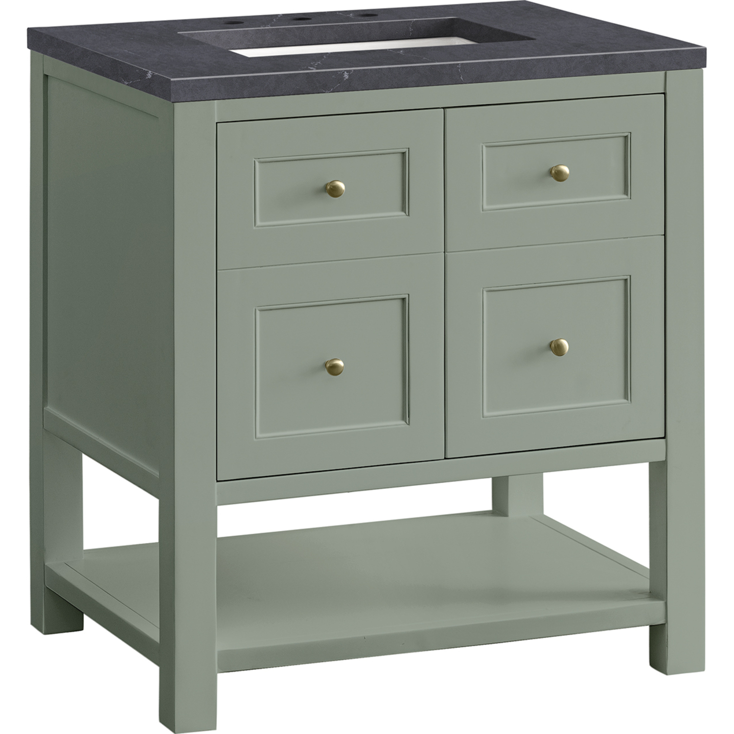 The Breckenridge 30" Single Vanity is a fresh take on traditional Mission furniture that easily transitions to Modern Farmhouse style with an air of understated sophistication. Champagne Brass knobs complement the Smokey Celadon finish, while the neatly inset door and drawer fronts lend a fresh appeal to this clean-lined classic. A two-door cabinet opens to reveal an interior shelf equipped with convenient built-in USB/120V power outlet. This console-style vanity also features an open lower shelf for additional storage. A suede-finished Charcoal Soapstone Silestone top with undermount sink completes the look.Two door cabinet with one interior, adjustable height shelfDoors feature soft-close, adjustable door hingesCabinet features a multi-stage premium finish coat to offer UV and moisture resistanceSmokey Celadon finish with Champagne Brass hardwareCountertop is pre-drilled for an 8" widespread faucet; our 3cm eased edge countertops come with white porcelain rectangular sink(s) that ship separately and include mounting brackets for easy installationIntegrated 120V outlet with USB portsFreestanding VanityFaucet sold separatelyA fresh take on traditional Mission furniture, the Breckenridge Collection easily transitions to Modern Farmhouse style with an air of understated sophistication. This console-style vanity has an integrated open shelf for additional storage, neatly inset door and drawer fronts to maintain the symmetry of the Shaker aesthetic, and coordinating knobs that complement each of the available finishes. With clean lines and a chic design, this vanity is destined to become a classic.1 year warranty against manufacturer's defects. We will repair or replace any defective product, if the product is defective in material or workmanship at our discretion. No warranty is expressed or implied regarding damages resulting from consumer misuse.