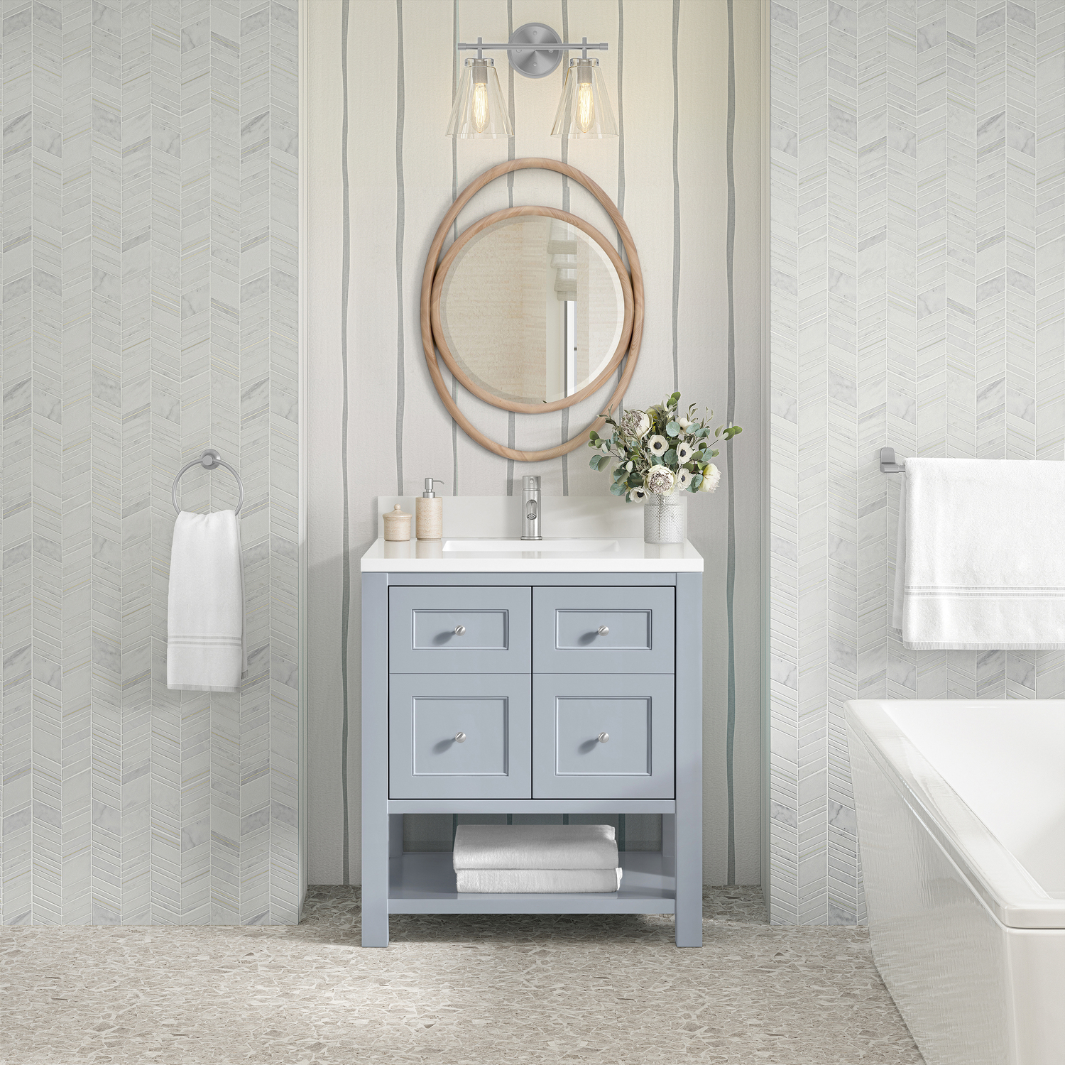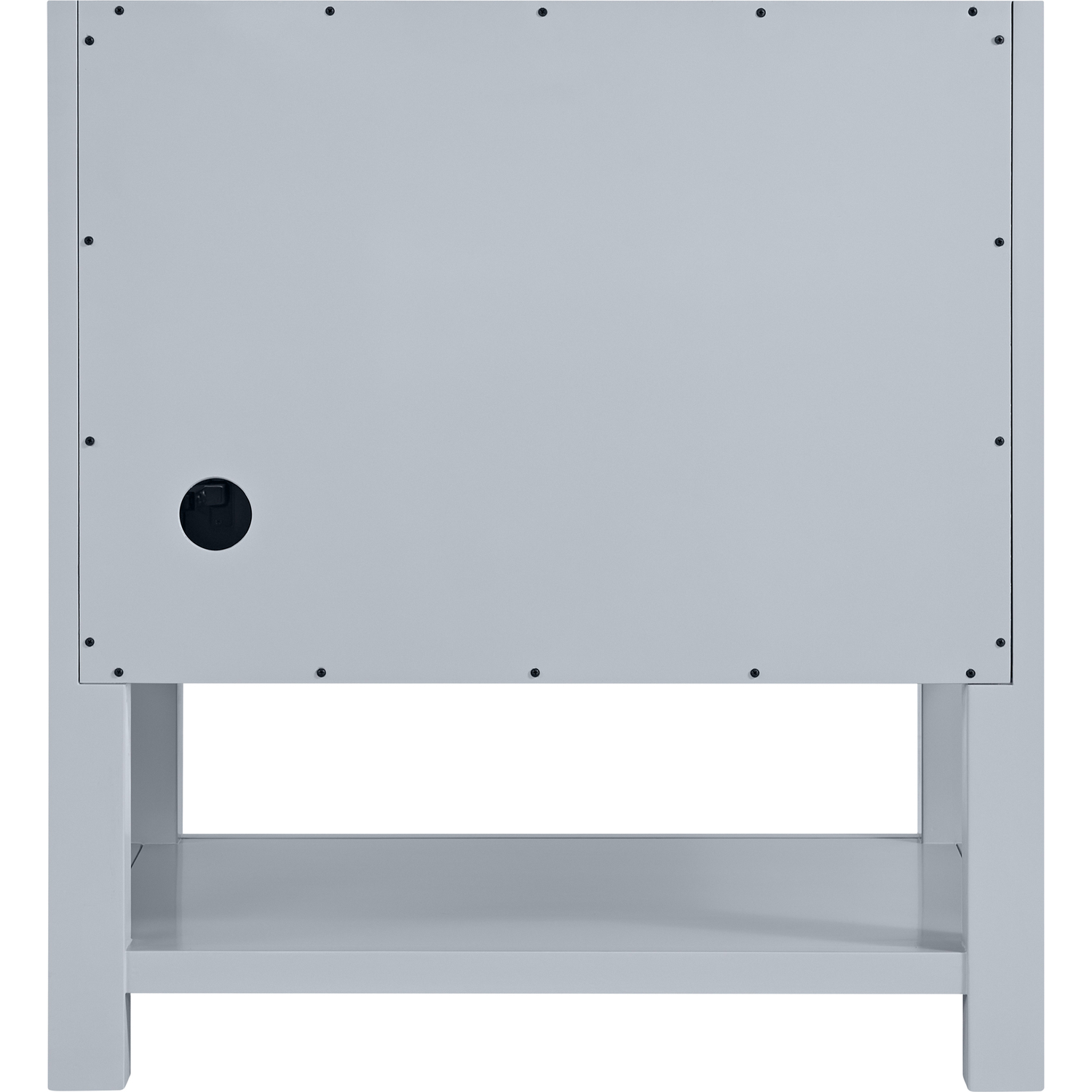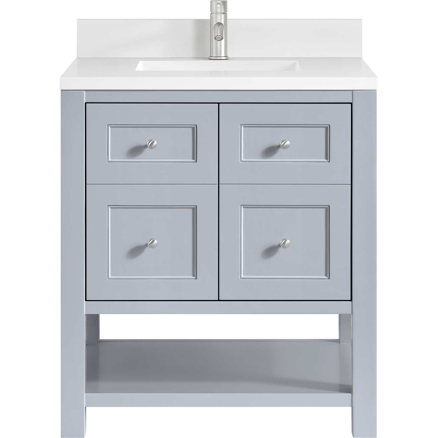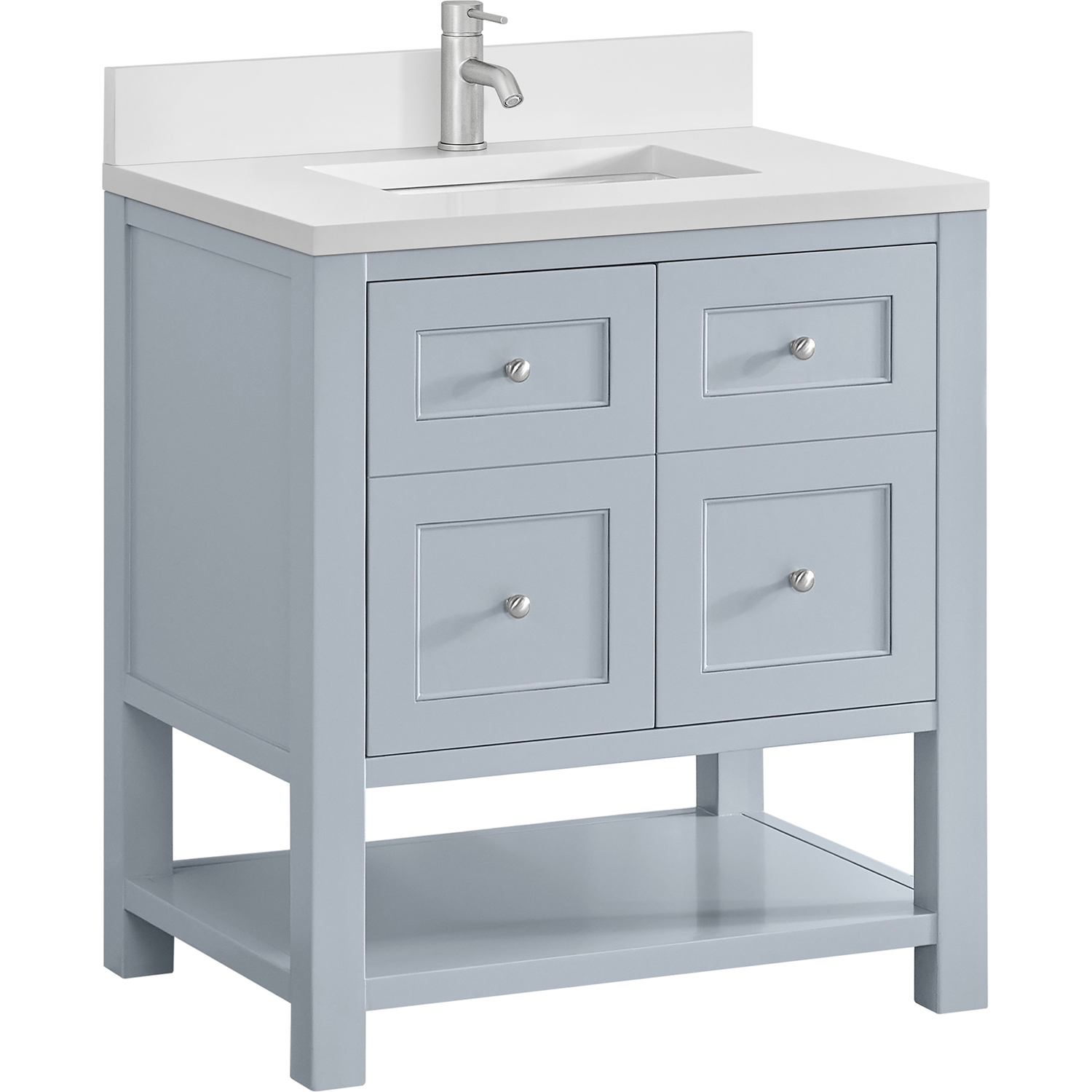 The Breckenridge 30" Single Vanity is a fresh take on traditional Mission furniture that easily transitions to Modern Farmhouse style with an air of understated sophistication. Satin Nickel knobs complement the Serenity Blue finish, while the neatly inset door and drawer fronts lend a fresh appeal to this clean-lined classic. A two-door cabinet opens to reveal an interior shelf equipped with convenient built-in USB/120V power outlet. This console-style vanity also features an open lower shelf for additional storage. A single-hole faucet White Zeus Silestone top with undermount sink and backsplash complete the look with a contemporary touch.Two door cabinet with one interior, adjustable height shelfDoors feature soft-close, adjustable door hingesCabinet features a multi-stage premium finish coat to offer UV and moisture resistanceSerenity Blue finish with Satin Nickel hardwareWhite Zeus Silestone top with backsplash is pre-drilled for a single-hole faucet; our 3cm eased edge countertops come with white porcelain rectangular undermount sink(s) that ship separately and include mounting brackets for easy installationIntegrated 120V outlet with USB portsFreestanding VanityMatching White Zeus 3cm Silestone BacksplashFaucet sold separatelyA fresh take on traditional Mission furniture, the Breckenridge Collection easily transitions to Modern Farmhouse style with an air of understated sophistication. This console-style vanity has an integrated open shelf for additional storage, neatly inset door and drawer fronts to maintain the symmetry of the Shaker aesthetic, and coordinating knobs that complement each of the available finishes. With clean lines and a chic design, this vanity is destined to become a classic.1 year warranty against manufacturer's defects. We will repair or replace any defective product, if the product is defective in material or workmanship at our discretion. No warranty is expressed or implied regarding damages resulting from consumer misuse.