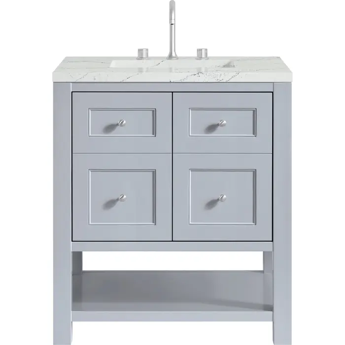 The Breckenridge 30" Single Vanity is a fresh take on traditional Mission furniture that easily transitions to Modern Farmhouse style with an air of understated sophistication. Satin Nickel knobs complement the Serenity Blue finish, while the neatly inset door and drawer fronts lend a fresh appeal to this clean-lined classic. A two-door cabinet opens to reveal an interior shelf equipped with convenient built-in USB/120V power outlet. This console-style vanity also features an open lower shelf for additional storage. A stunning Ethereal Noctis Silestone top with undermount sink completes the look.Two door cabinet with one interior, adjustable height shelfDoors feature soft-close, adjustable door hingesCabinet features a multi-stage premium finish coat to offer UV and moisture resistanceSerenity Blue finish with Satin Nickel hardwareCountertop is pre-drilled for an 8" widespread faucet; our 3cm eased edge countertops come with white porcelain rectangular sink(s) that ship separately and include mounting brackets for easy installationIntegrated 120V outlet with USB portsFreestanding VanityFaucet sold separatelyA fresh take on traditional Mission furniture, the Breckenridge Collection easily transitions to Modern Farmhouse style with an air of understated sophistication. This console-style vanity has an integrated open shelf for additional storage, neatly inset door and drawer fronts to maintain the symmetry of the Shaker aesthetic, and coordinating knobs that complement each of the available finishes. With clean lines and a chic design, this vanity is destined to become a classic.1 year warranty against manufacturer's defects. We will repair or replace any defective product, if the product is defective in material or workmanship at our discretion. No warranty is expressed or implied regarding damages resulting from consumer misuse.