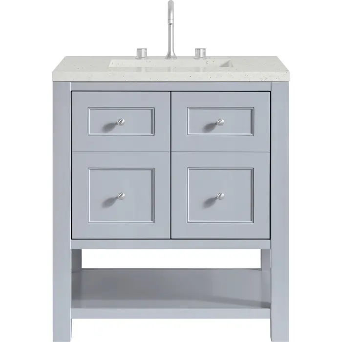 The Breckenridge 30" Single Vanity is a fresh take on traditional Mission furniture that easily transitions to Modern Farmhouse style with an air of understated sophistication. Satin Nickel knobs complement the Serenity Blue finish, while the neatly inset door and drawer fronts lend a fresh appeal to this clean-lined classic. A two-door cabinet opens to reveal an interior shelf equipped with convenient built-in USB/120V power outlet. This console-style vanity also features an open lower shelf for additional storage. A suede-finished Lime Delight Silestone top with undermount sink completes the look.Two door cabinet with one interior, adjustable height shelfDoors feature soft-close, adjustable door hingesCabinet features a multi-stage premium finish coat to offer UV and moisture resistanceSerenity Blue finish with Satin Nickel hardwareCountertop is pre-drilled for an 8" widespread faucet; our 3cm eased edge countertops come with white porcelain rectangular sink(s) that ship separately and include mounting brackets for easy installationIntegrated 120V outlet with USB portsFreestanding VanityFaucet sold separatelyA fresh take on traditional Mission furniture, the Breckenridge Collection easily transitions to Modern Farmhouse style with an air of understated sophistication. This console-style vanity has an integrated open shelf for additional storage, neatly inset door and drawer fronts to maintain the symmetry of the Shaker aesthetic, and coordinating knobs that complement each of the available finishes. With clean lines and a chic design, this vanity is destined to become a classic.1 year warranty against manufacturer's defects. We will repair or replace any defective product, if the product is defective in material or workmanship at our discretion. No warranty is expressed or implied regarding damages resulting from consumer misuse.