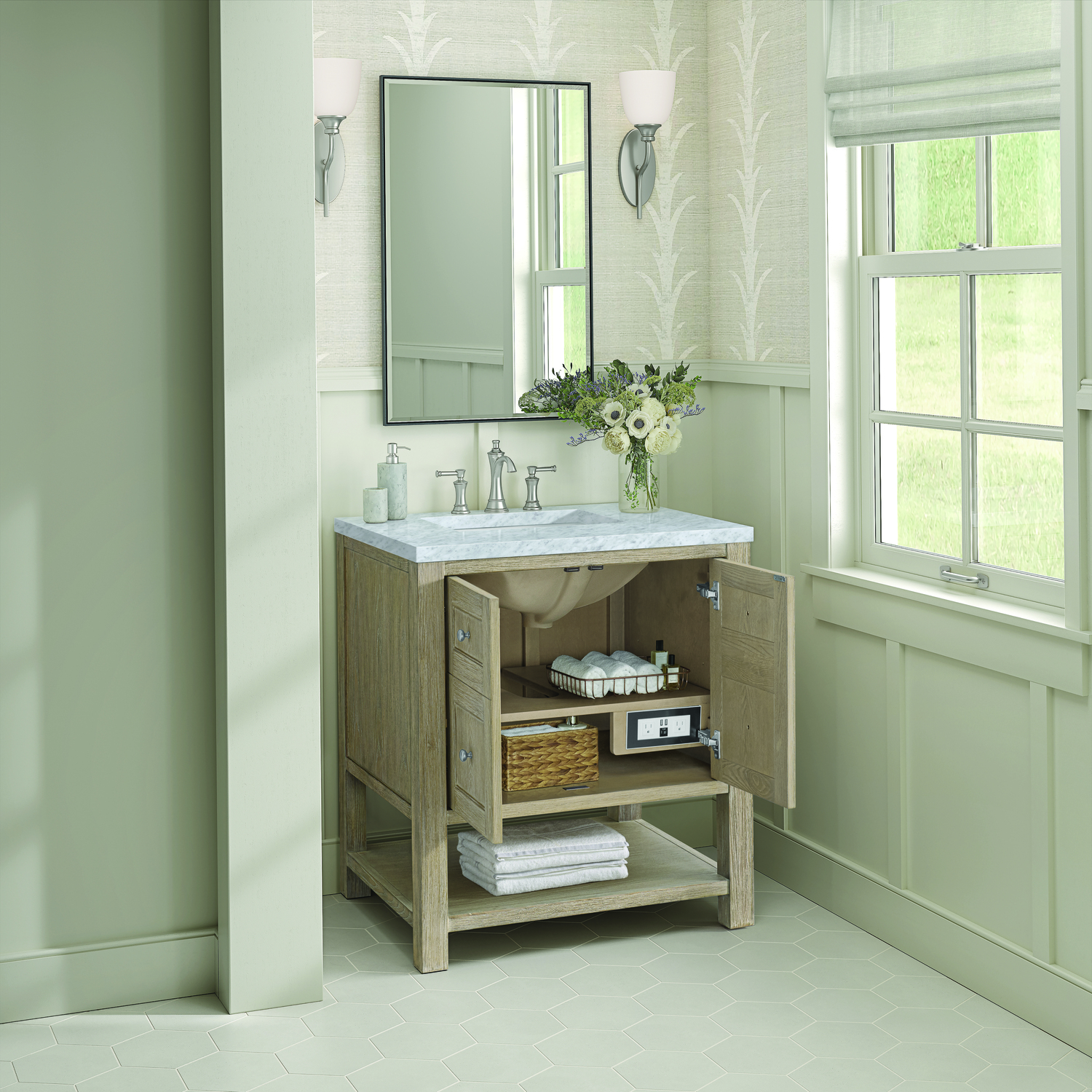 The Breckenridge 30" Single Vanity is a fresh take on traditional Mission furniture that easily transitions to Modern Farmhouse style with an air of understated sophistication. Satin Nickel knobs complement the Whitewashed Oak finish, while the neatly inset door and drawer fronts lend a fresh appeal to this clean-lined classic. A two-door cabinet opens to reveal an interior shelf equipped with convenient built-in USB/120V power outlet. This console-style vanity also features an open lower shelf for additional storage. A classic Carrara Marble top with undermount sink completes the look.Two door cabinet with one interior, adjustable height shelfDoors feature soft-close, adjustable door hingesCabinet features a multi-stage premium finish coat to offer UV and moisture resistanceWhitewashed Oak finish with Satin Nickel hardwareCountertop is pre-drilled for an 8" widespread faucet; our 3cm eased edge countertops come with white porcelain curved basin sink(s) that ship separately and include mounting brackets for easy installationIntegrated 120V outlet with USB portsFreestanding VanityFaucet sold separatelyA fresh take on traditional Mission furniture, the Breckenridge Collection easily transitions to Modern Farmhouse style with an air of understated sophistication. This console-style vanity has an integrated open shelf for additional storage, neatly inset door and drawer fronts to maintain the symmetry of the Shaker aesthetic, and coordinating knobs that complement each of the available finishes. With clean lines and a chic design, this vanity is destined to become a classic.1 year warranty against manufacturer's defects. We will repair or replace any defective product, if the product is defective in material or workmanship at our discretion. No warranty is expressed or implied regarding damages resulting from consumer misuse.