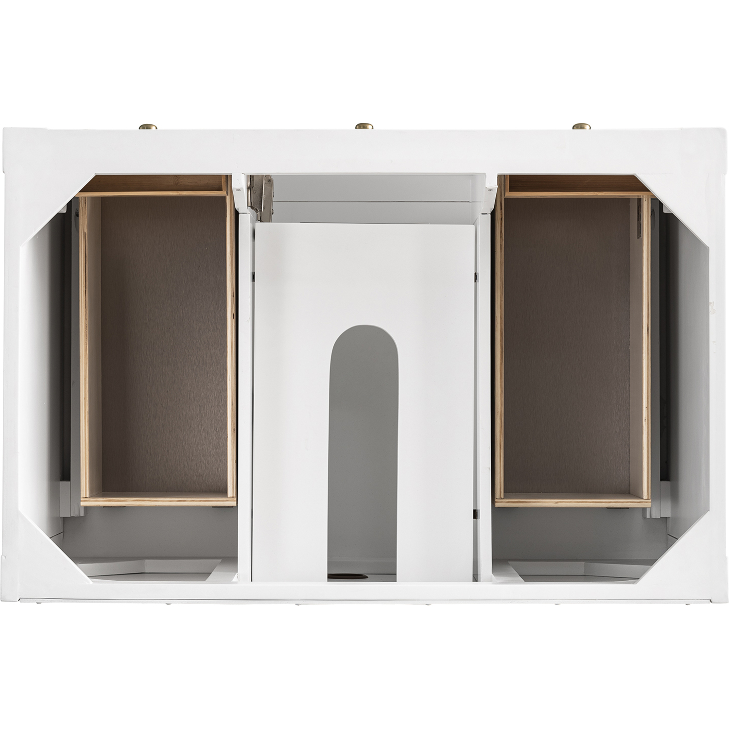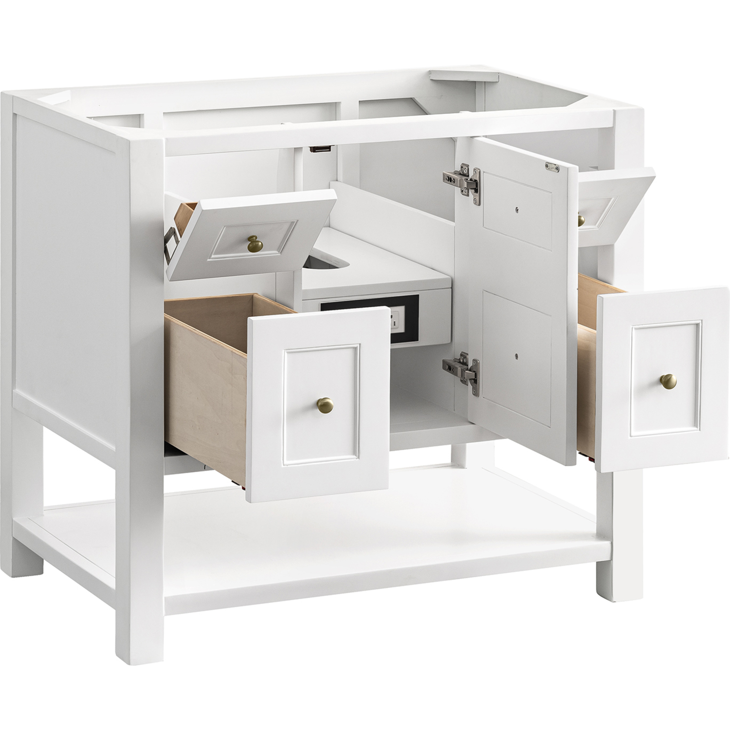 The Breckenridge 36" Single Vanity Cabinet is a fresh take on traditional Mission furniture that easily transitions to Modern Farmhouse style with an air of understated sophistication. Champagne Brass knobs complement the Bright White finish, while the neatly inset door and drawer fronts lend a fresh appeal to this clean-lined classic. A single-door cabinet opens to reveal an interior shelf equipped with convenient built-in USB/120V power outlet. This console-style vanity also features two top-row tip-out drawers, two standard full-extension drawers, and an open lower shelf for additional storage. Complete the look with one of our 3 cm tops.Single door cabinet with one adjustable interior shelf, two top-row tip-out drawers, and two standard full-extension drawersDrawer boxes feature English Dovetail joinery with premium, soft-close undermount drawer slides; doors feature soft-close, adjustable door hingesCabinet features a multi-stage premium finish coat to offer UV and moisture resistanceBright White finish with Champagne Brass hardwareCabinet only; select one of our countertops to complete the vanityIntegrated 120V outlet with USB portsDrawers lined with our signature brushed aluminum laminate for easy cleaningFreestanding VanityA fresh take on traditional Mission furniture, the Breckenridge Collection easily transitions to Modern Farmhouse style with an air of understated sophistication. This console-style vanity has an integrated open shelf for additional storage, neatly inset door and drawer fronts to maintain the symmetry of the Shaker aesthetic, and coordinating knobs that complement each of the available finishes. With clean lines and a chic design, this vanity is destined to become a classic.1 year warranty against manufacturer's defects. We will repair or replace any defective product, if the product is defective in material or workmanship at our discretion. No warranty is expressed or implied regarding damages resulting from consumer misuse.