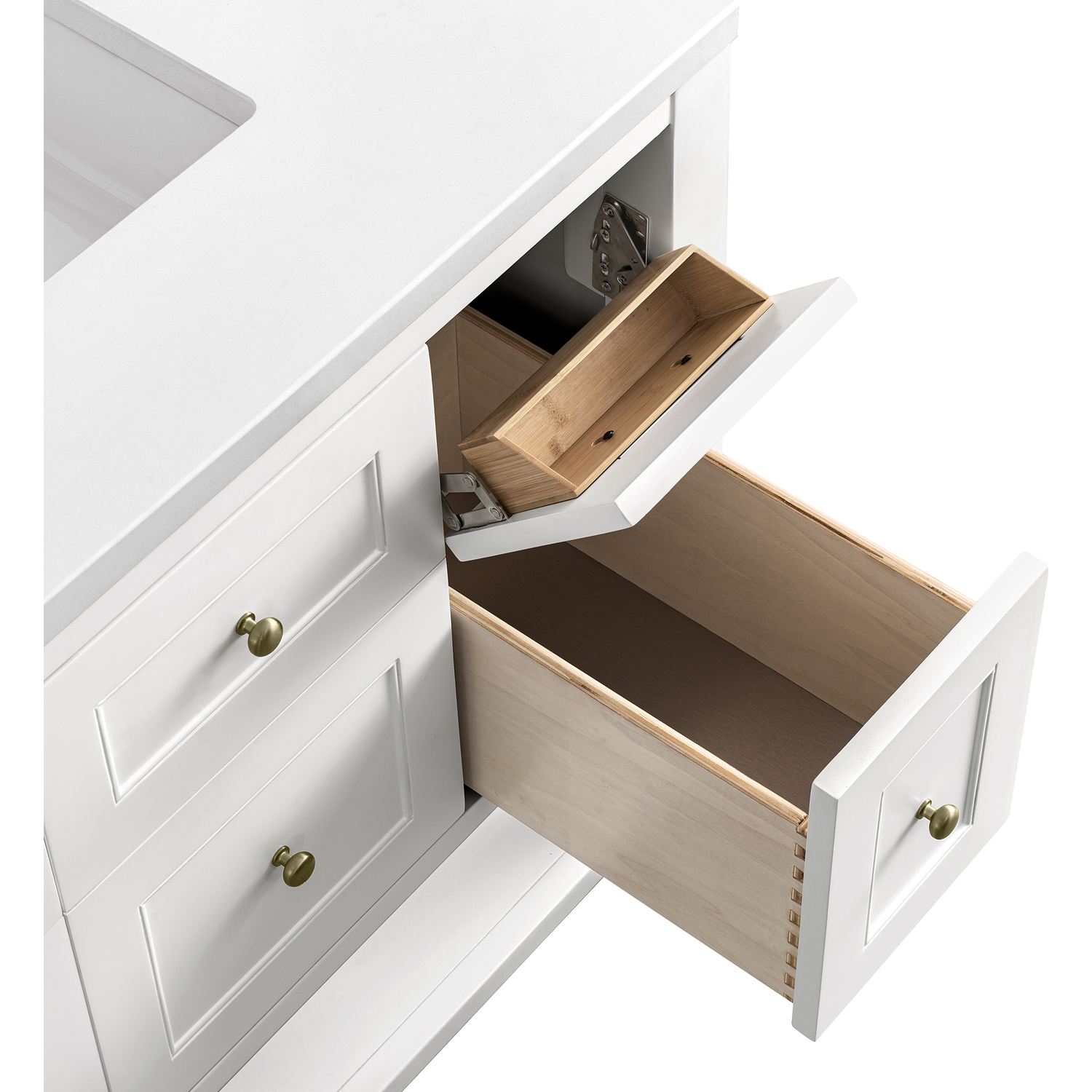 - Soft-close, undermount drawer glides and soft-close door hinges