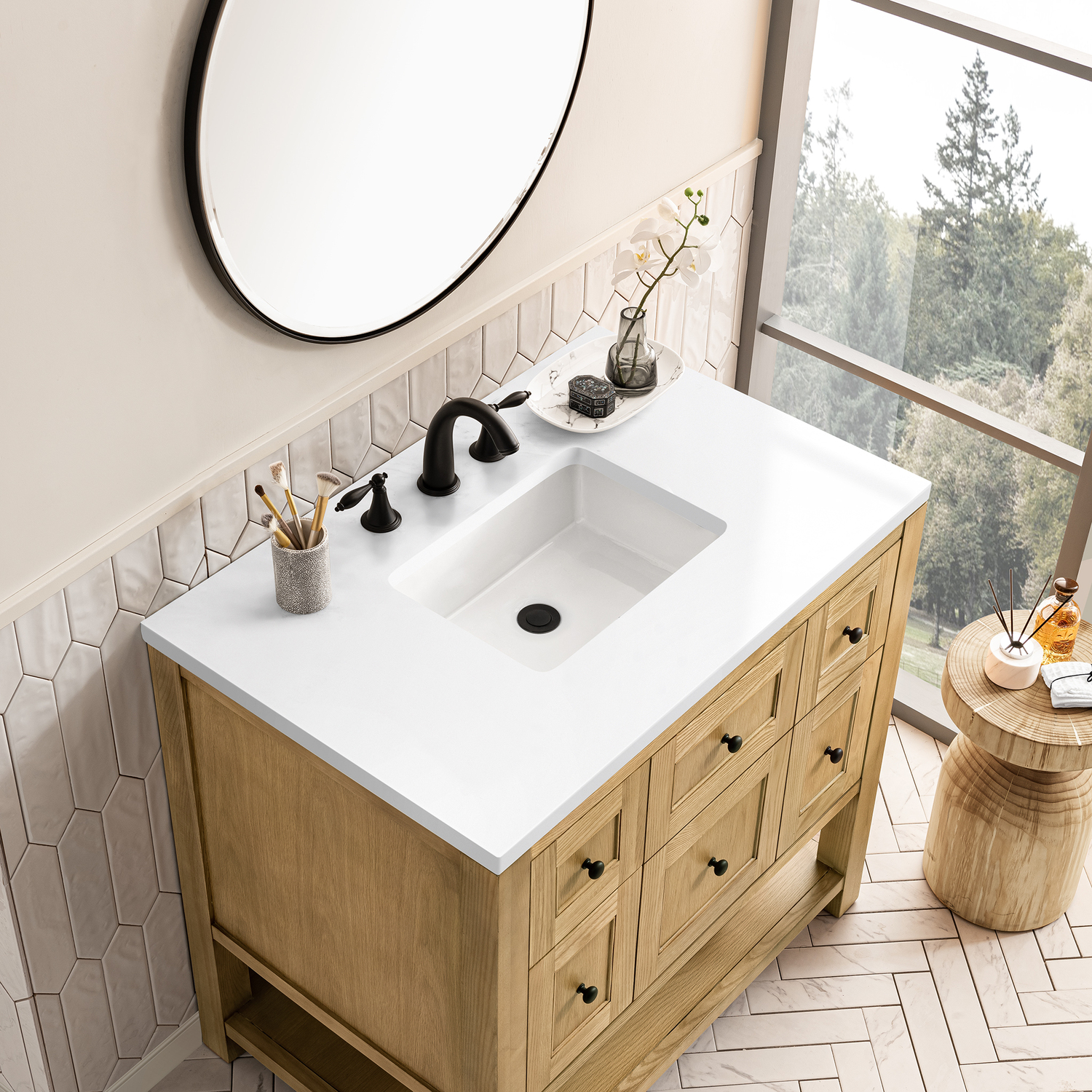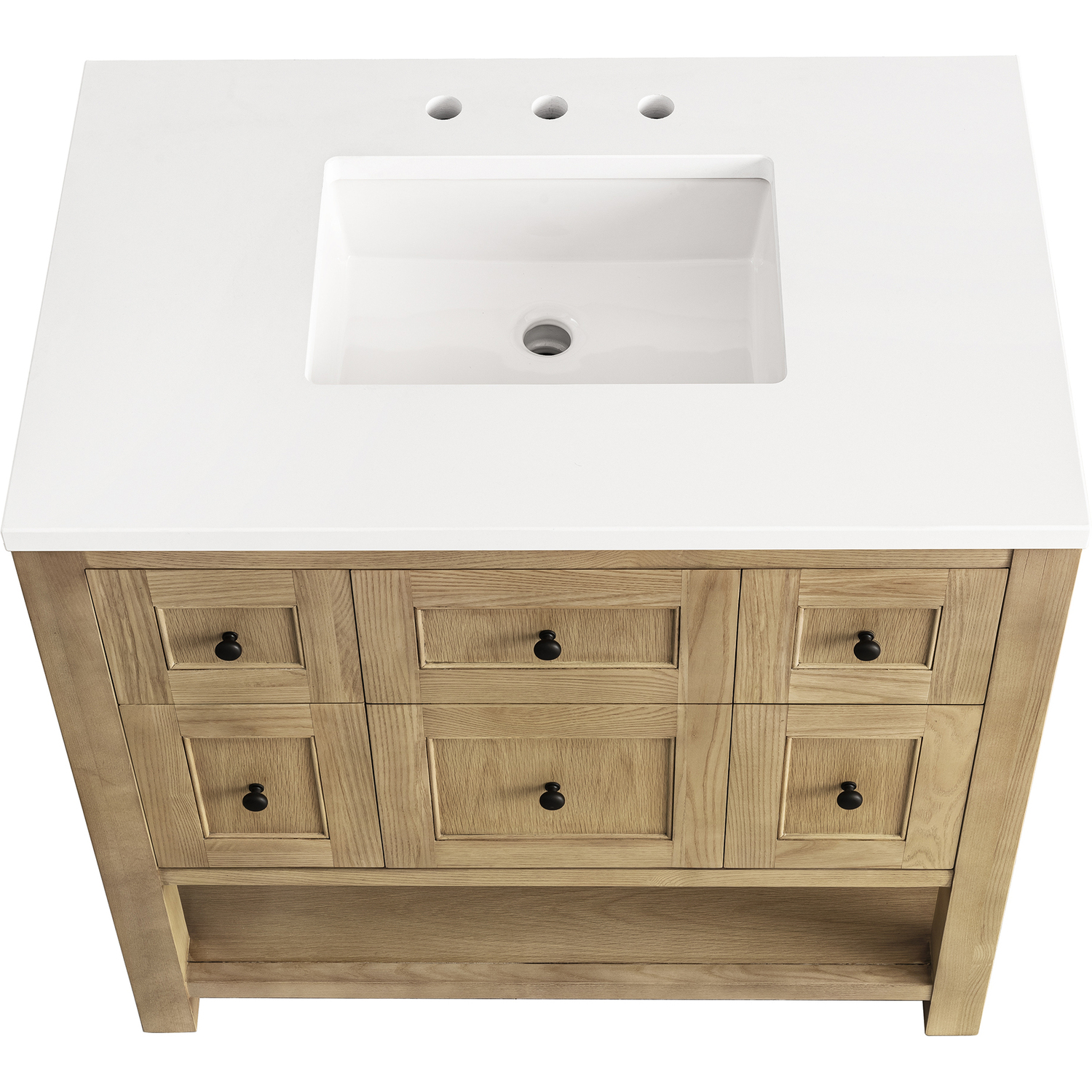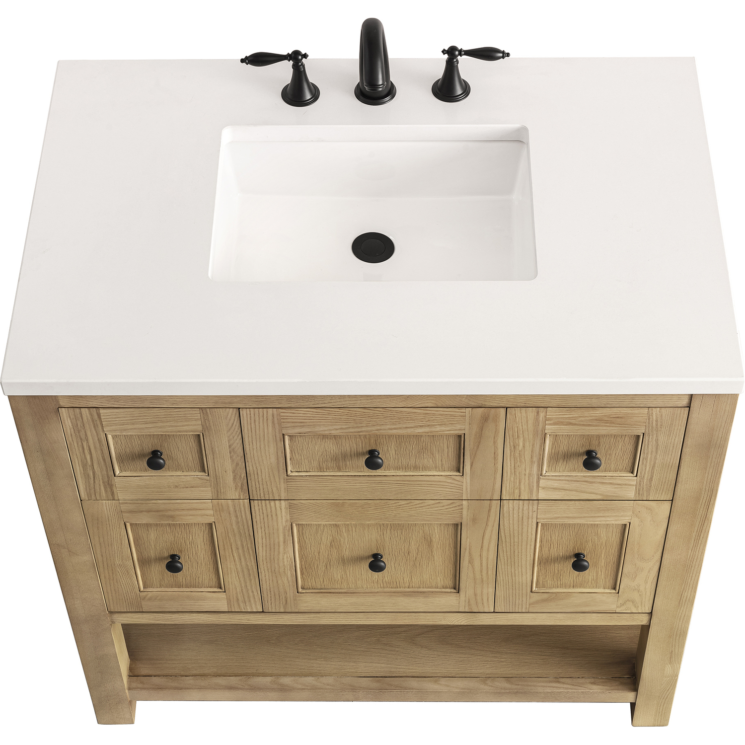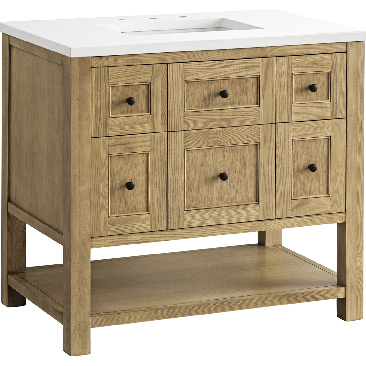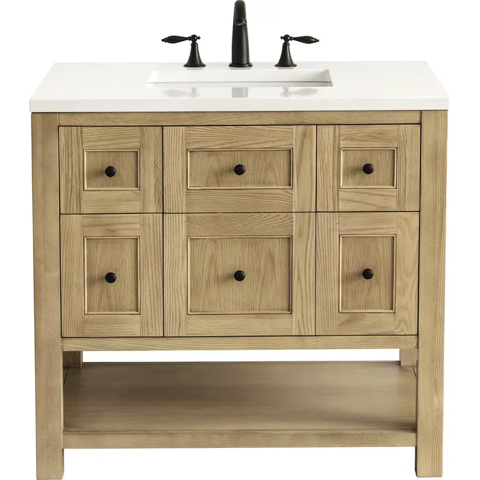 The Breckenridge 36" Single Vanity is a fresh take on traditional Mission furniture that easily transitions to Modern Farmhouse style with an air of understated sophistication. Matte Black knobs complement the Light Natural Oak finish, while the neatly inset door and drawer fronts lend a fresh appeal to this clean-lined classic. A single-door cabinet opens to reveal an interior shelf equipped with convenient built-in USB/120V power outlet. This console-style vanity also features two top-row tip-out drawers, two standard full-extension drawers, and an open lower shelf for additional storage. A classic White Zeus Silestone top with undermount sink completes the look.Single door cabinet with one adjustable interior shelf, two top-row tip-out drawers, and two standard full-extension drawersDrawer boxes feature English Dovetail joinery with premium, soft-close undermount drawer slides; doors feature soft-close, adjustable door hingesCabinet features a multi-stage premium finish coat to offer UV and moisture resistanceLight Natural Oak finish with Matte Black hardwareCountertop is pre-drilled for an 8" widespread faucet; our 3cm eased edge countertops come with white porcelain rectangular sink(s) that ship separately and include mounting brackets for easy installationIntegrated 120V outlet with USB portsDrawers lined with our signature brushed aluminum laminate for easy cleaningFreestanding VanityFaucet sold separatelyA fresh take on traditional Mission furniture, the Breckenridge Collection easily transitions to Modern Farmhouse style with an air of understated sophistication. This console-style vanity has an integrated open shelf for additional storage, neatly inset door and drawer fronts to maintain the symmetry of the Shaker aesthetic, and coordinating knobs that complement each of the available finishes. With clean lines and a chic design, this vanity is destined to become a classic.1 year warranty against manufacturer's defects. We will repair or replace any defective product, if the product is defective in material or workmanship at our discretion. No warranty is expressed or implied regarding damages resulting from consumer misuse.