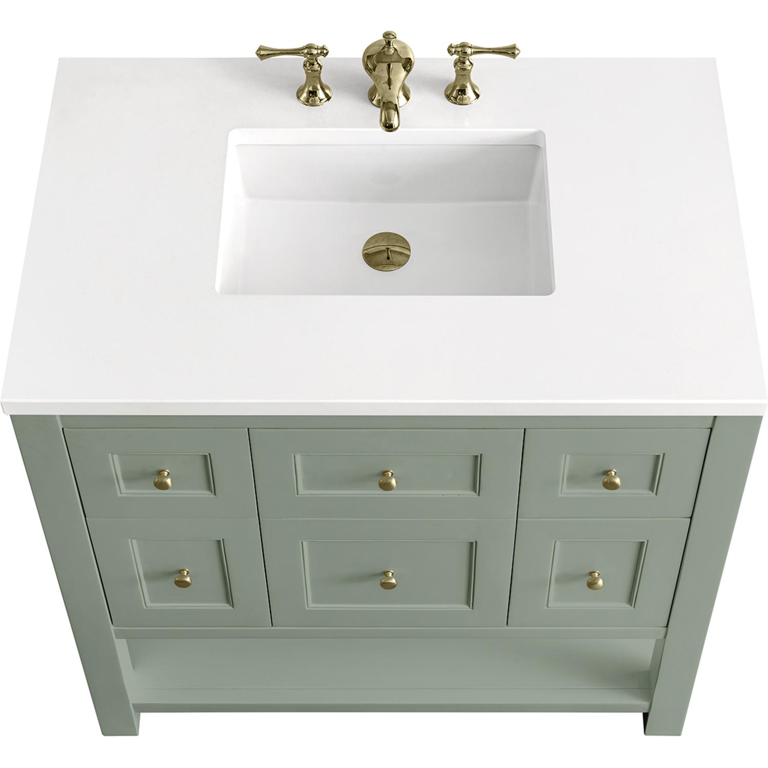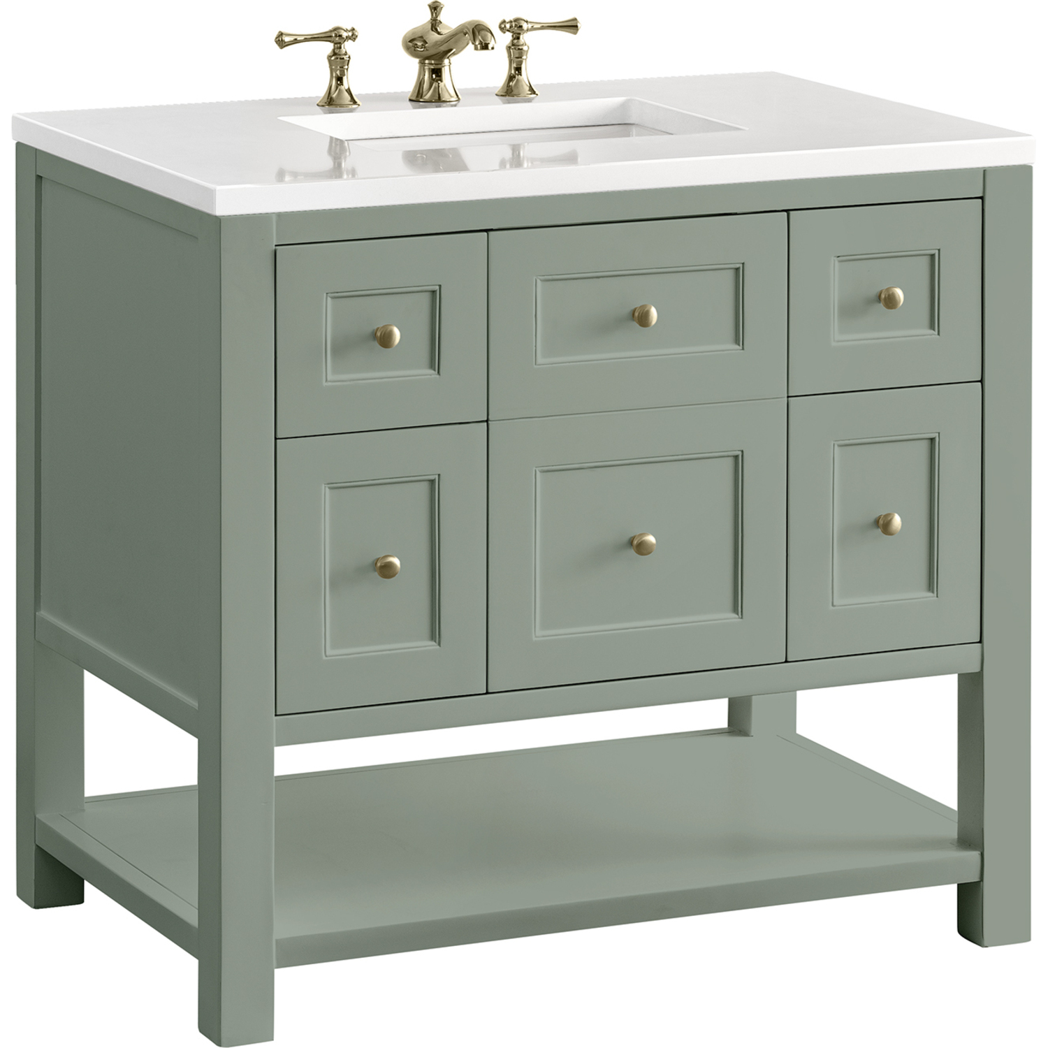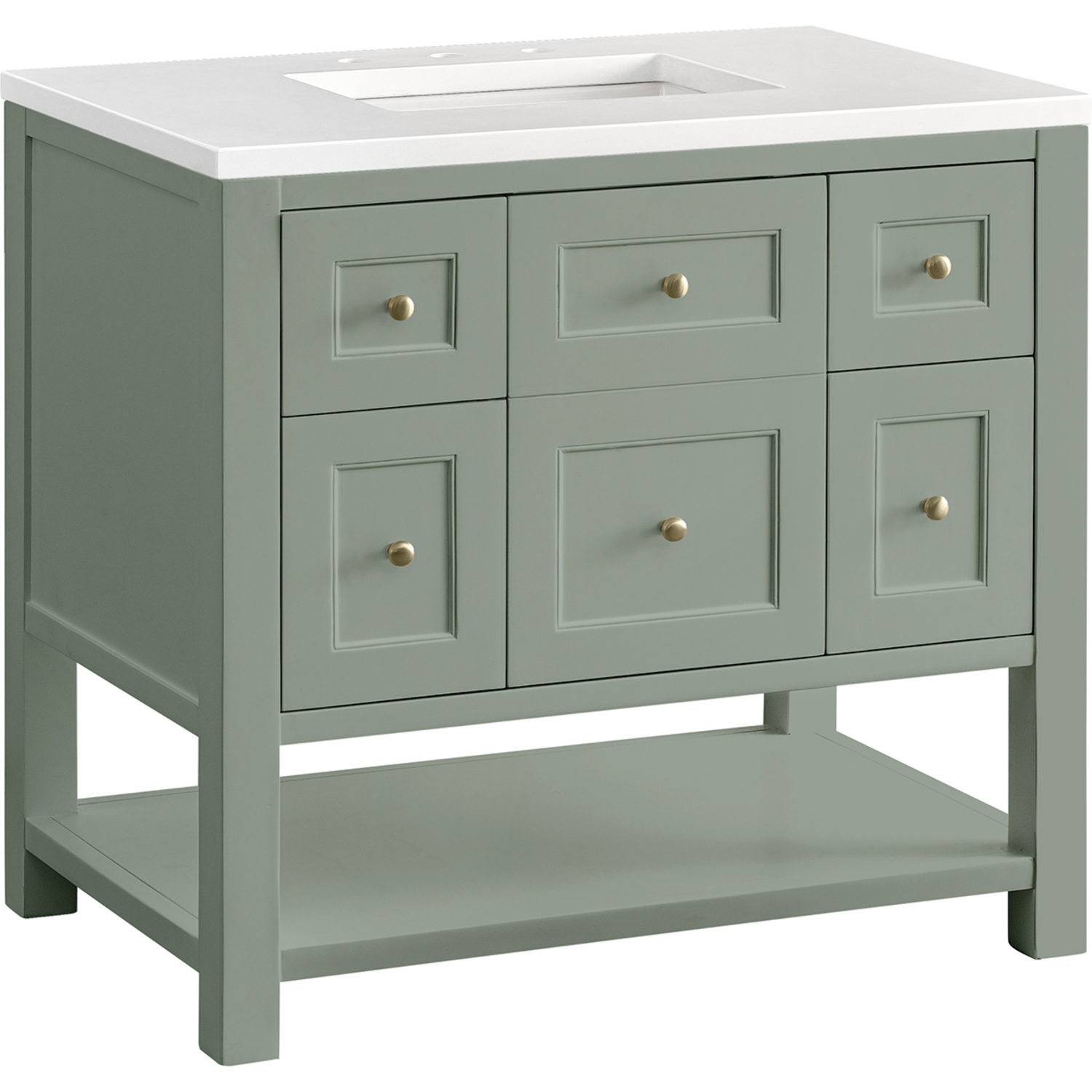 The Breckenridge 36" Single Vanity is a fresh take on traditional Mission furniture that easily transitions to Modern Farmhouse style with an air of understated sophistication. Champagne Brass knobs complement the Smokey Celadon finish, while the neatly inset door and drawer fronts lend a fresh appeal to this clean-lined classic. A single-door cabinet opens to reveal an interior shelf equipped with convenient built-in USB/120V power outlet. This console-style vanity also features two top-row tip-out drawers, two standard full-extension drawers, and an open lower shelf for additional storage. A classic White Zeus Silestone top with undermount sink completes the look.Single door cabinet with one adjustable interior shelf, two top-row tip-out drawers, and two standard full-extension drawersDrawer boxes feature English Dovetail joinery with premium, soft-close undermount drawer slides; doors feature soft-close, adjustable door hingesCabinet features a multi-stage premium finish coat to offer UV and moisture resistanceSmokey Celadon finish with Champagne Brass hardwareCountertop is pre-drilled for an 8" widespread faucet; our 3cm eased edge countertops come with white porcelain rectangular sink(s) that ship separately and include mounting brackets for easy installationIntegrated 120V outlet with USB portsDrawers lined with our signature brushed aluminum laminate for easy cleaningFreestanding VanityFaucet sold separatelyA fresh take on traditional Mission furniture, the Breckenridge Collection easily transitions to Modern Farmhouse style with an air of understated sophistication. This console-style vanity has an integrated open shelf for additional storage, neatly inset door and drawer fronts to maintain the symmetry of the Shaker aesthetic, and coordinating knobs that complement each of the available finishes. With clean lines and a chic design, this vanity is destined to become a classic.1 year warranty against manufacturer's defects. We will repair or replace any defective product, if the product is defective in material or workmanship at our discretion. No warranty is expressed or implied regarding damages resulting from consumer misuse.