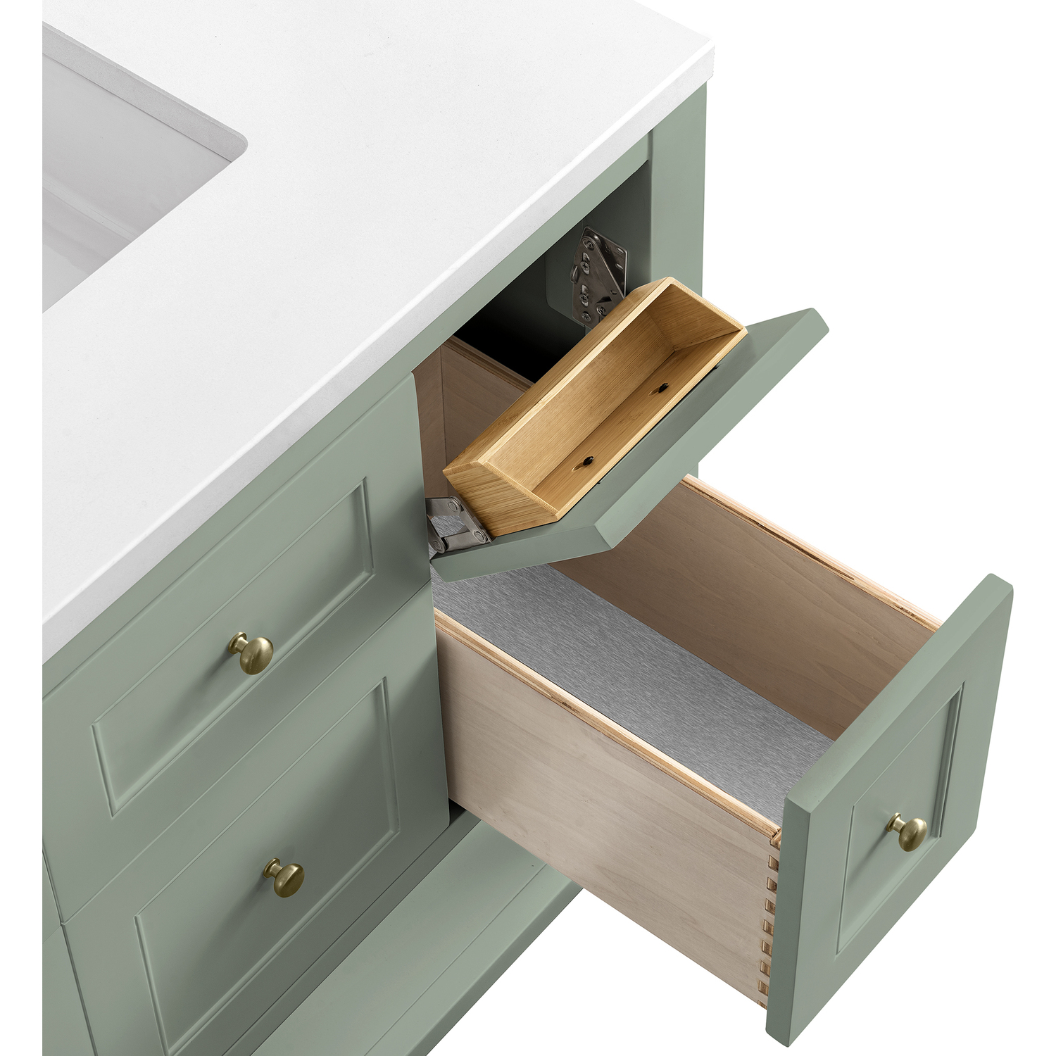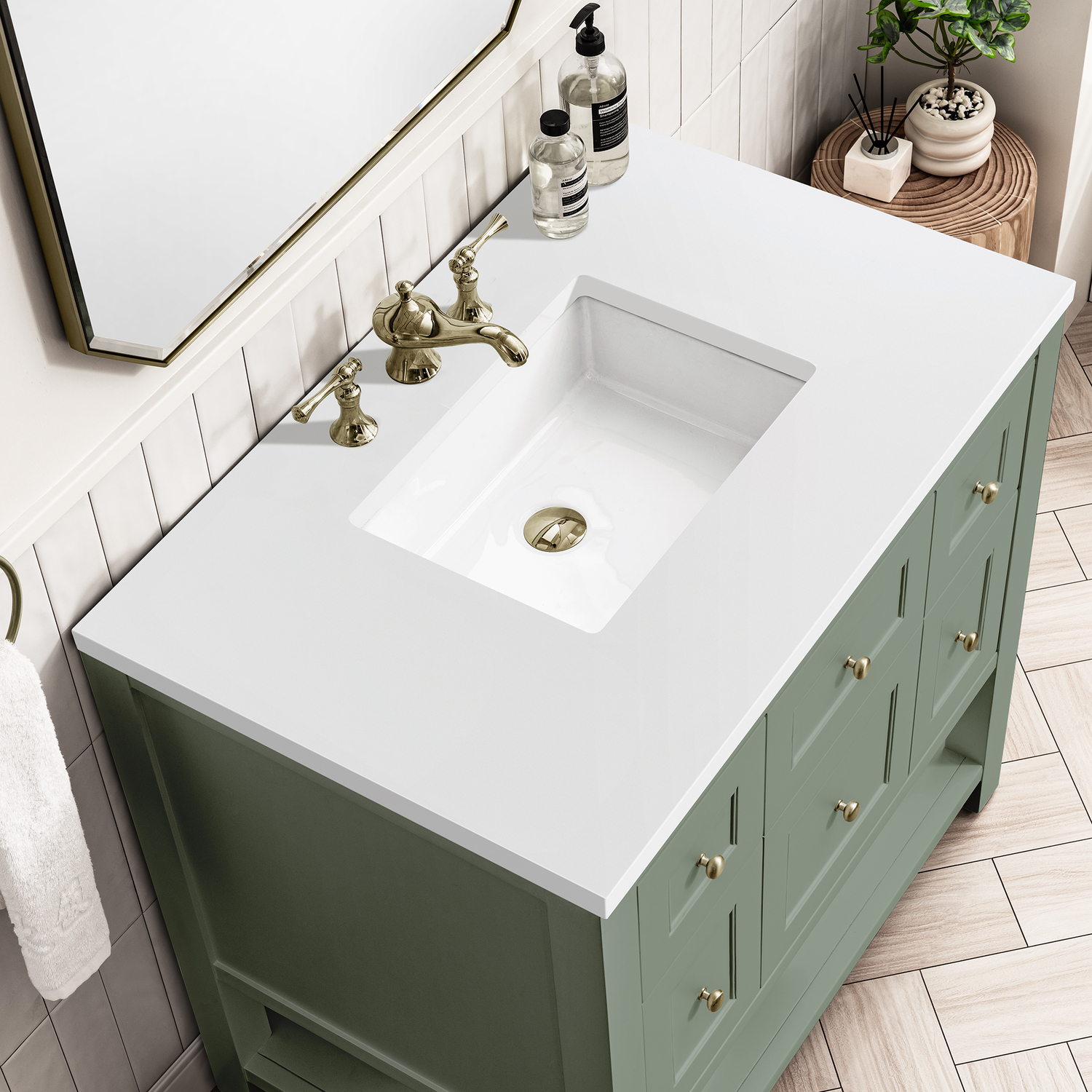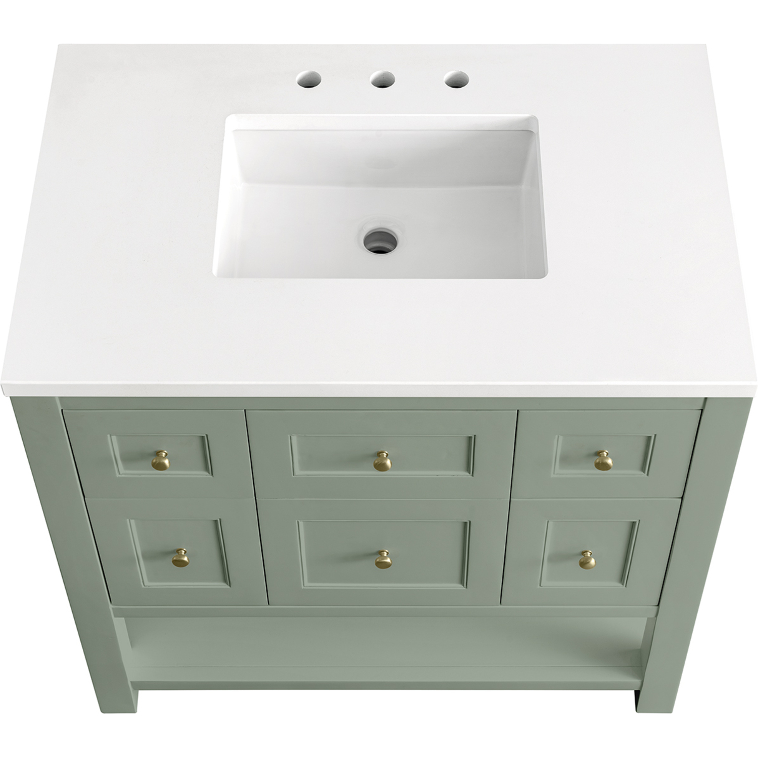 The Breckenridge 36" Single Vanity is a fresh take on traditional Mission furniture that easily transitions to Modern Farmhouse style with an air of understated sophistication. Champagne Brass knobs complement the Smokey Celadon finish, while the neatly inset door and drawer fronts lend a fresh appeal to this clean-lined classic. A single-door cabinet opens to reveal an interior shelf equipped with convenient built-in USB/120V power outlet. This console-style vanity also features two top-row tip-out drawers, two standard full-extension drawers, and an open lower shelf for additional storage. A classic White Zeus Silestone top with undermount sink completes the look.Single door cabinet with one adjustable interior shelf, two top-row tip-out drawers, and two standard full-extension drawersDrawer boxes feature English Dovetail joinery with premium, soft-close undermount drawer slides; doors feature soft-close, adjustable door hingesCabinet features a multi-stage premium finish coat to offer UV and moisture resistanceSmokey Celadon finish with Champagne Brass hardwareCountertop is pre-drilled for an 8" widespread faucet; our 3cm eased edge countertops come with white porcelain rectangular sink(s) that ship separately and include mounting brackets for easy installationIntegrated 120V outlet with USB portsDrawers lined with our signature brushed aluminum laminate for easy cleaningFreestanding VanityFaucet sold separatelyA fresh take on traditional Mission furniture, the Breckenridge Collection easily transitions to Modern Farmhouse style with an air of understated sophistication. This console-style vanity has an integrated open shelf for additional storage, neatly inset door and drawer fronts to maintain the symmetry of the Shaker aesthetic, and coordinating knobs that complement each of the available finishes. With clean lines and a chic design, this vanity is destined to become a classic.1 year warranty against manufacturer's defects. We will repair or replace any defective product, if the product is defective in material or workmanship at our discretion. No warranty is expressed or implied regarding damages resulting from consumer misuse.