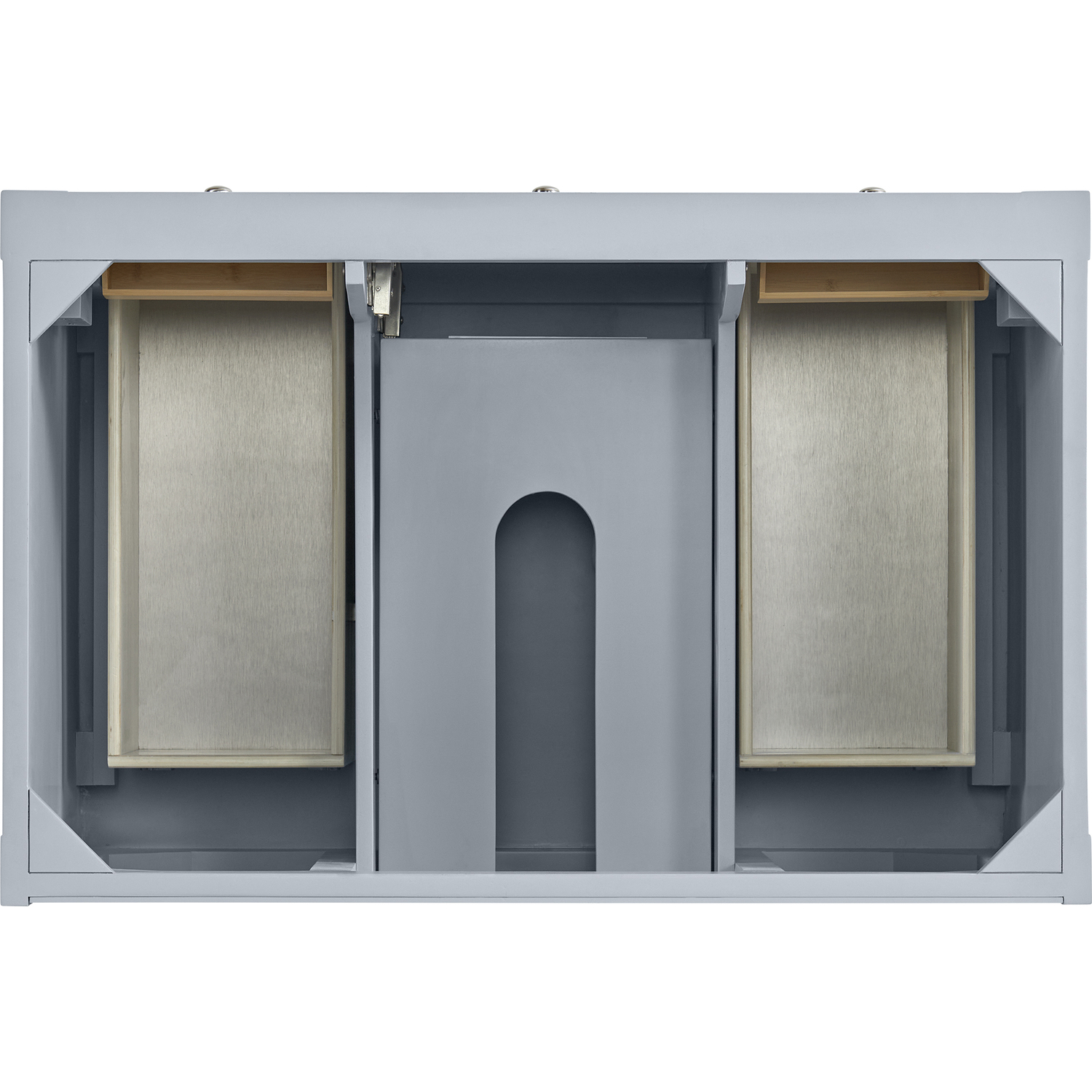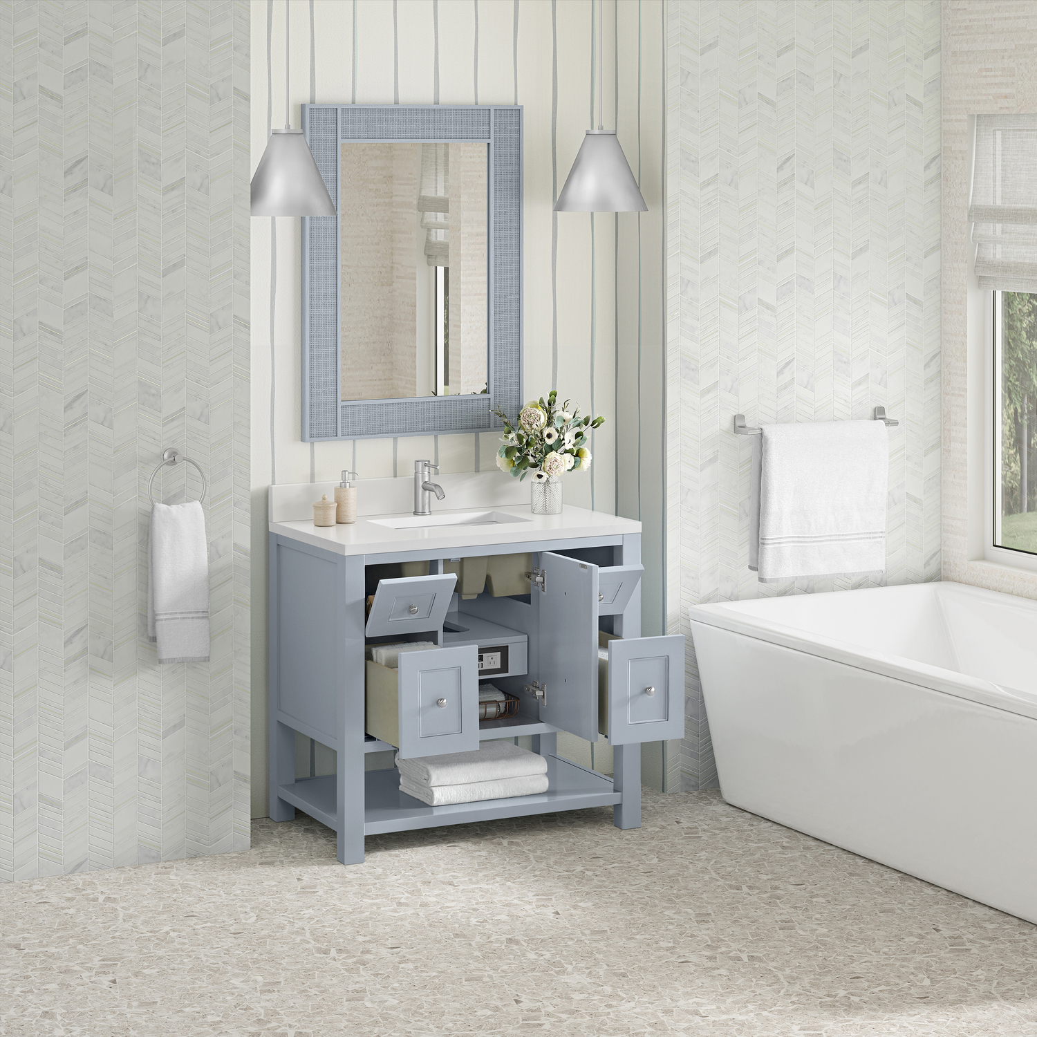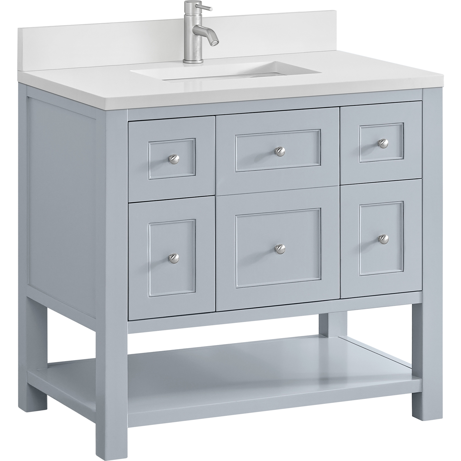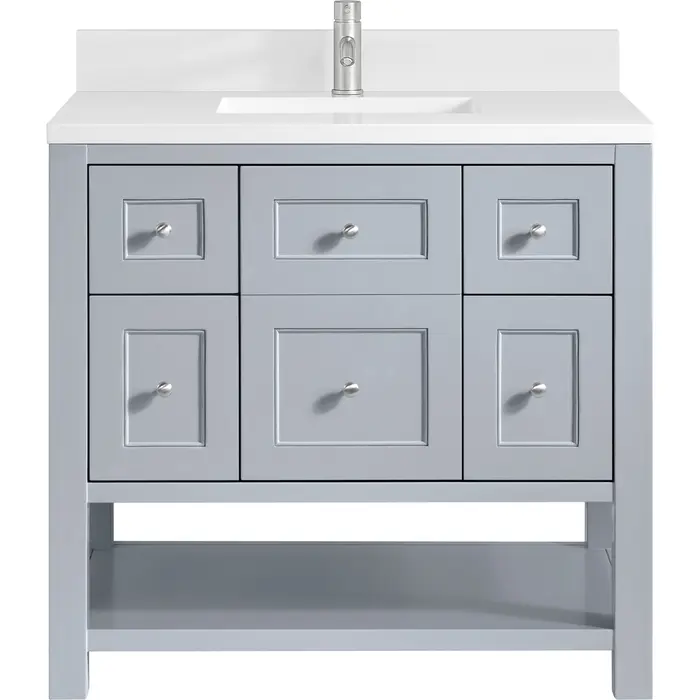 The Breckenridge 36" Single Vanity is a fresh take on traditional Mission furniture that easily transitions to Modern Farmhouse style with an air of understated sophistication. Satin Nickel knobs complement the Serenity Blue finish, while the neatly inset door and drawer fronts lend a fresh appeal to this clean-lined classic. A single-door cabinet opens to reveal an interior shelf equipped with convenient built-in USB/120V power outlet. This console-style vanity also features two top-row tip-out drawers, two standard full-extension drawers, and an open lower shelf for additional storage. A single-hole faucet White Zeus Silestone top with undermount sink and backsplash complete the look with a contemporary touch.Single door cabinet with one adjustable interior shelf, two top-row tip-out drawers, and two standard full-extension drawersDrawer boxes feature English Dovetail joinery with premium, soft-close undermount drawer slides; doors feature soft-close, adjustable door hingesCabinet features a multi-stage premium finish coat to offer UV and moisture resistanceSerenity Blue finish with Satin Nickel hardwareWhite Zeus Silestone top with backsplash is pre-drilled for a single-hole faucet; our 3cm eased edge countertops come with white porcelain rectangular undermount sink(s) that ship separately and include mounting brackets for easy installationIntegrated 120V outlet with USB portsDrawers lined with our signature brushed aluminum laminate for easy cleaningFreestanding VanityMatching White Zeus 3cm Silestone BacksplashFaucet sold separatelyA fresh take on traditional Mission furniture, the Breckenridge Collection easily transitions to Modern Farmhouse style with an air of understated sophistication. This console-style vanity has an integrated open shelf for additional storage, neatly inset door and drawer fronts to maintain the symmetry of the Shaker aesthetic, and coordinating knobs that complement each of the available finishes. With clean lines and a chic design, this vanity is destined to become a classic.1 year warranty against manufacturer's defects. We will repair or replace any defective product, if the product is defective in material or workmanship at our discretion. No warranty is expressed or implied regarding damages resulting from consumer misuse.