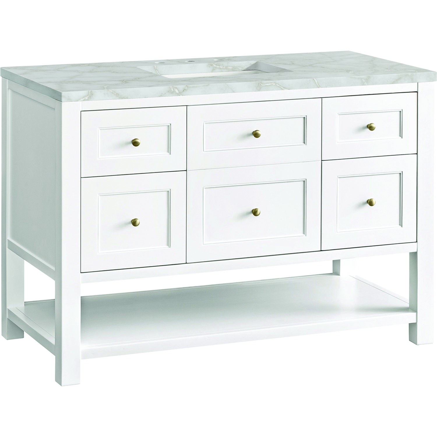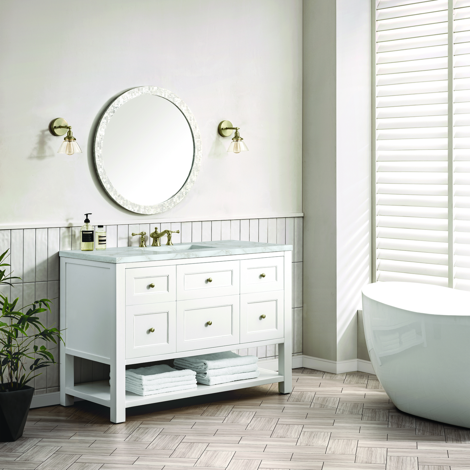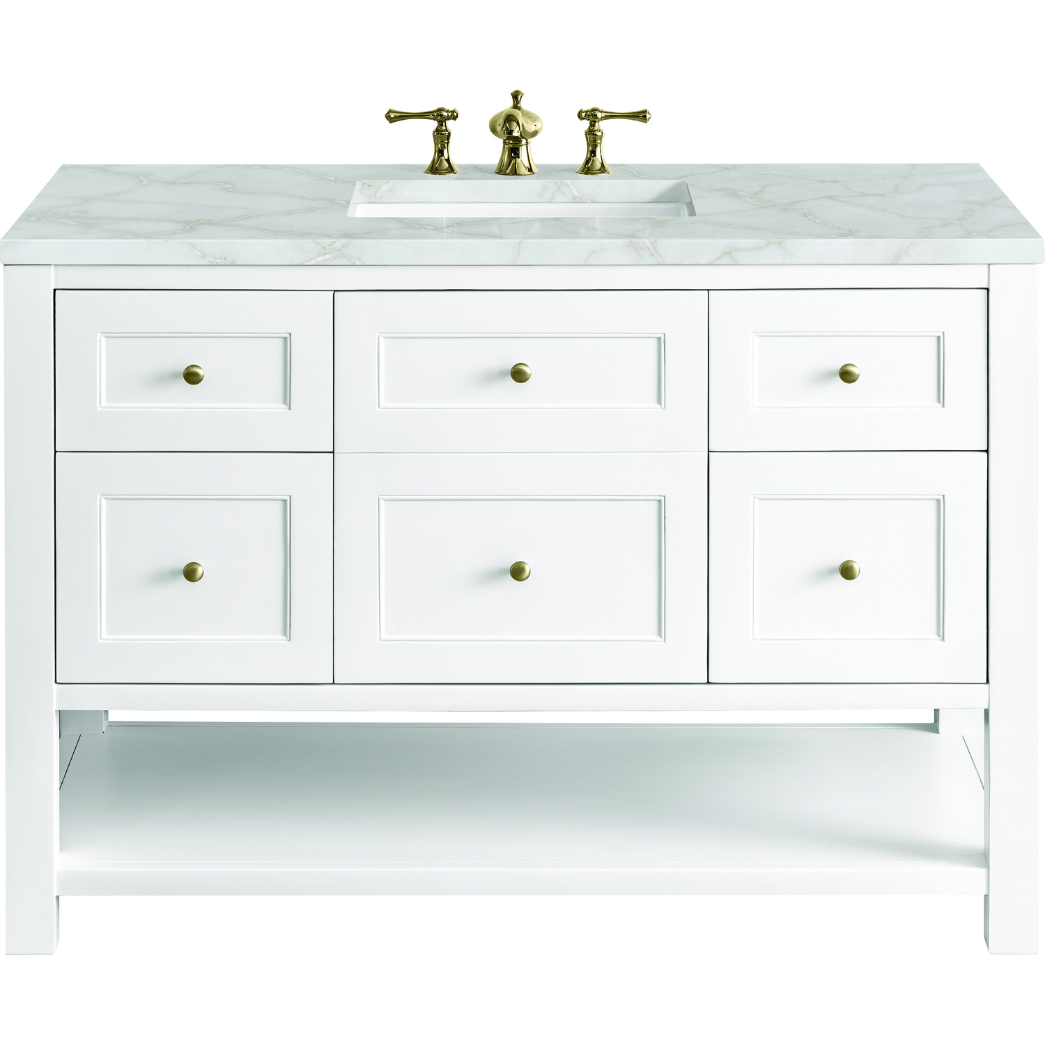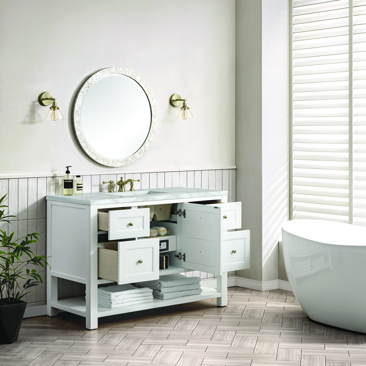 The Breckenridge 48" Single Vanity is a fresh take on traditional Mission furniture that easily transitions to Modern Farmhouse style with an air of understated sophistication. Champagne Brass knobs complement the Bright White finish, while the neatly inset door and drawer fronts lend a fresh appeal to this clean-lined classic. A single-door cabinet opens to reveal an interior shelf equipped with convenient built-in USB/120V power outlet. This console-style vanity also features four full-extension drawers and an open lower shelf for additional storage. A beautiful Victorian Silver Silestone top with undermount sink completes the look.Single door cabinet with one adjustable interior shelf and four full-extension drawersDrawer boxes feature English Dovetail joinery with premium, soft-close undermount drawer slides; doors feature soft-close, adjustable door hingesCabinet features a multi-stage premium finish coat to offer UV and moisture resistanceBright White finish with Champagne Brass hardwareCountertop is pre-drilled for an 8" widespread faucet; our 3cm eased edge countertops come with white porcelain rectangular sink(s) that ship separately and include mounting brackets for easy installationIntegrated 120V outlet with USB portsDrawers lined with our signature brushed aluminum laminate for easy cleaningRemovable bamboo drawer organizer includedFreestanding VanityFaucet sold separatelyA fresh take on traditional Mission furniture, the Breckenridge Collection easily transitions to Modern Farmhouse style with an air of understated sophistication. This console-style vanity has an integrated open shelf for additional storage, neatly inset door and drawer fronts to maintain the symmetry of the Shaker aesthetic, and coordinating knobs that complement each of the available finishes. With clean lines and a chic design, this vanity is destined to become a classic.1 year warranty against manufacturer's defects. We will repair or replace any defective product, if the product is defective in material or workmanship at our discretion. No warranty is expressed or implied regarding damages resulting from consumer misuse.