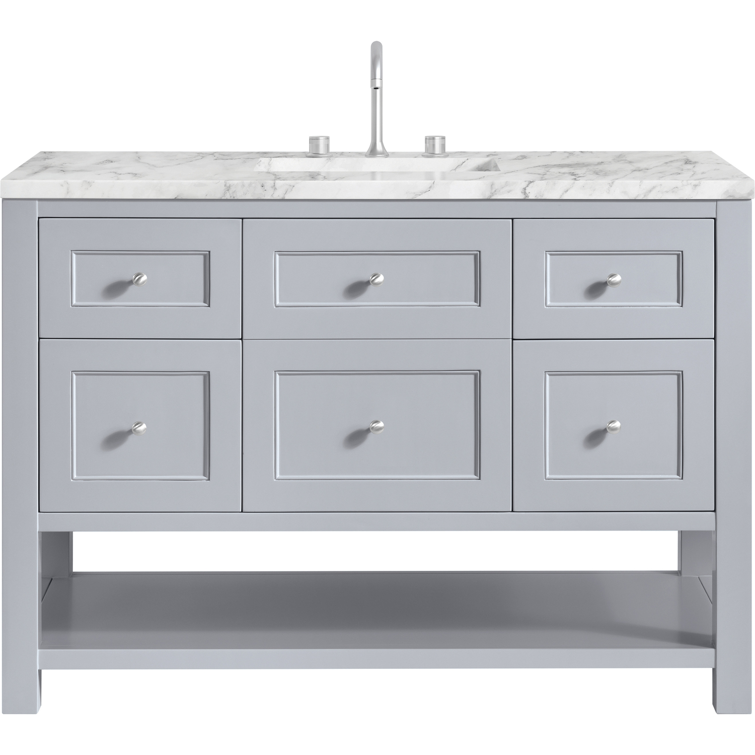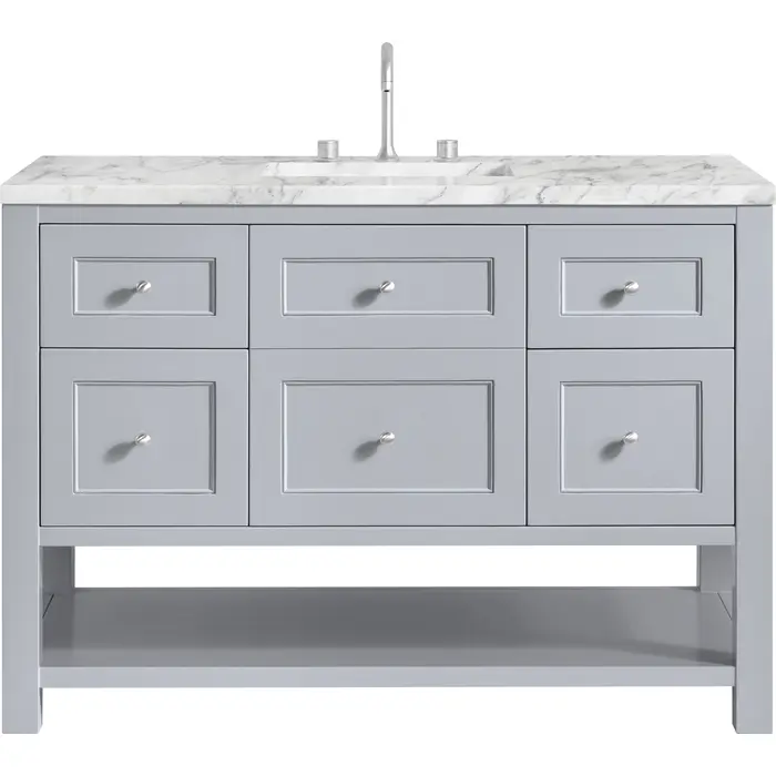 The Breckenridge 48" Single Vanity is a fresh take on traditional Mission furniture that easily transitions to Modern Farmhouse style with an air of understated sophistication. Satin Nickel knobs complement the Serenity Blue finish, while the neatly inset door and drawer fronts lend a fresh appeal to this clean-lined classic. A single-door cabinet opens to reveal an interior shelf equipped with convenient built-in USB/120V power outlet. This console-style vanity also features four full-extension drawers and an open lower shelf for additional storage. A classic Carrara Marble top with undermount sink completes the look.Single door cabinet with one adjustable interior shelf and four full-extension drawersDrawer boxes feature English Dovetail joinery with premium, soft-close undermount drawer slides; doors feature soft-close, adjustable door hingesCabinet features a multi-stage premium finish coat to offer UV and moisture resistanceSerenity Blue finish with Satin Nickel hardwareCountertop is pre-drilled for an 8" widespread faucet; our 3cm eased edge countertops come with white porcelain rectangular sink(s) that ship separately and include mounting brackets for easy installationIntegrated 120V outlet with USB portsDrawers lined with our signature brushed aluminum laminate for easy cleaningRemovable bamboo drawer organizer includedFreestanding VanityFaucet sold separatelyA fresh take on traditional Mission furniture, the Breckenridge Collection easily transitions to Modern Farmhouse style with an air of understated sophistication. This console-style vanity has an integrated open shelf for additional storage, neatly inset door and drawer fronts to maintain the symmetry of the Shaker aesthetic, and coordinating knobs that complement each of the available finishes. With clean lines and a chic design, this vanity is destined to become a classic.1 year warranty against manufacturer's defects. We will repair or replace any defective product, if the product is defective in material or workmanship at our discretion. No warranty is expressed or implied regarding damages resulting from consumer misuse.