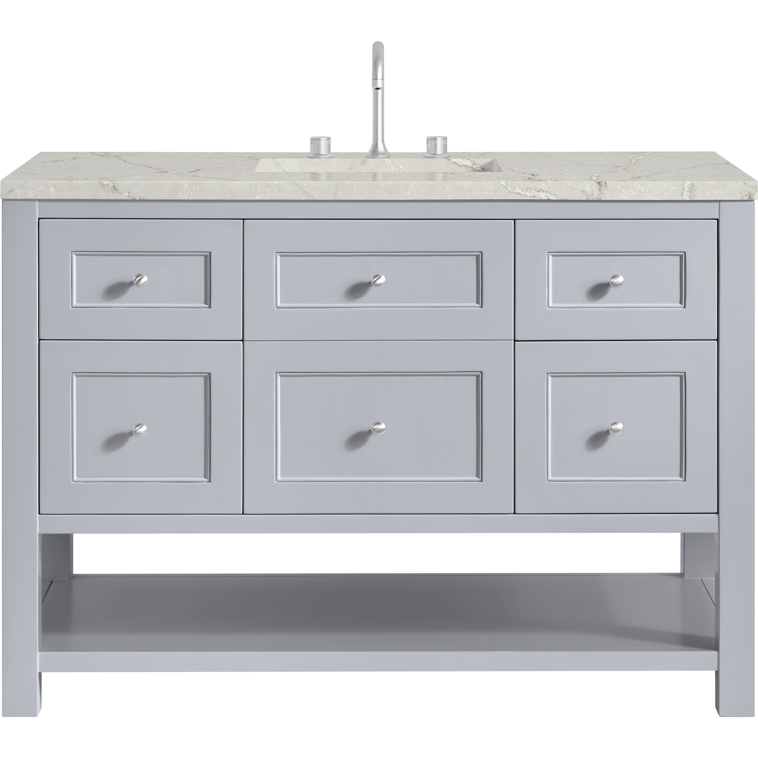 The Breckenridge 48" Single Vanity is a fresh take on traditional Mission furniture that easily transitions to Modern Farmhouse style with an air of understated sophistication. Satin Nickel knobs complement the Serenity Blue finish, while the neatly inset door and drawer fronts lend a fresh appeal to this clean-lined classic. A single-door cabinet opens to reveal an interior shelf equipped with convenient built-in USB/120V power outlet. This console-style vanity also features four full-extension drawers and an open lower shelf for additional storage. A beautiful Victorian Silver Silestone top with undermount sink completes the look.Single door cabinet with one adjustable interior shelf and four full-extension drawersDrawer boxes feature English Dovetail joinery with premium, soft-close undermount drawer slides; doors feature soft-close, adjustable door hingesCabinet features a multi-stage premium finish coat to offer UV and moisture resistanceSerenity Blue finish with Satin Nickel hardwareCountertop is pre-drilled for an 8" widespread faucet; our 3cm eased edge countertops come with white porcelain rectangular sink(s) that ship separately and include mounting brackets for easy installationIntegrated 120V outlet with USB portsDrawers lined with our signature brushed aluminum laminate for easy cleaningRemovable bamboo drawer organizer includedFreestanding VanityFaucet sold separatelyA fresh take on traditional Mission furniture, the Breckenridge Collection easily transitions to Modern Farmhouse style with an air of understated sophistication. This console-style vanity has an integrated open shelf for additional storage, neatly inset door and drawer fronts to maintain the symmetry of the Shaker aesthetic, and coordinating knobs that complement each of the available finishes. With clean lines and a chic design, this vanity is destined to become a classic.1 year warranty against manufacturer's defects. We will repair or replace any defective product, if the product is defective in material or workmanship at our discretion. No warranty is expressed or implied regarding damages resulting from consumer misuse.