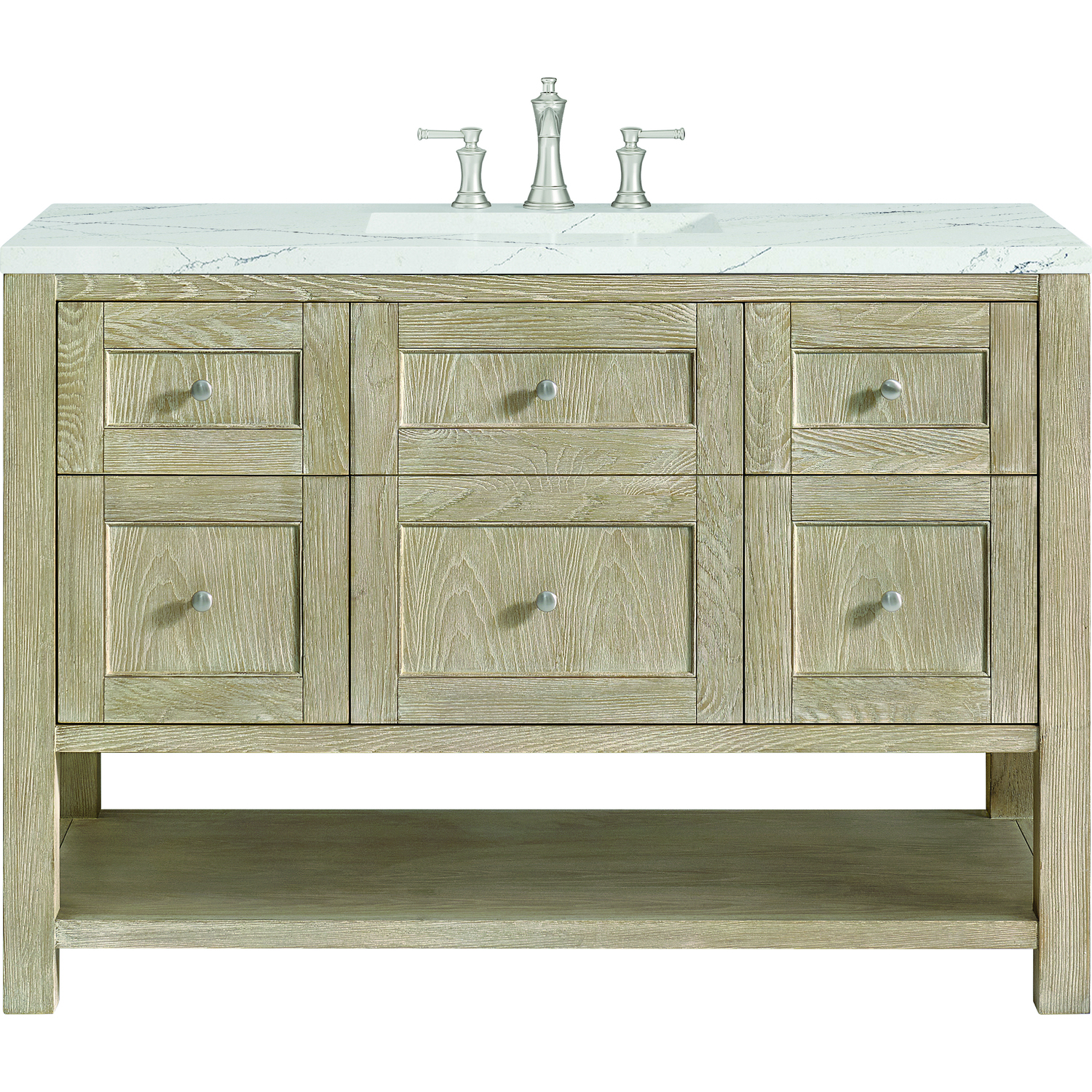 The Breckenridge 48" Single Vanity by James Martin Vanities is a fresh take on traditional Mission furniture that easily transitions to Modern Farmhouse style with an air of understated sophistication. Satin Nickel knobs complement the Whitewashed Oak finish, while the neatly inset door and drawer fronts lend a fresh appeal to this clean-lined classic. A single-door cabinet opens to reveal an interior shelf equipped with convenient built-in USB/120V power outlet. This console-style vanity also features four full-extension drawers and an open lower shelf for additional storage. A stunning Ethereal Noctis Silestone® top with undermount sink completes the look. This unit is enabled with FreePower wireless charging; featuring a single-device charger seamlessly embedded into the countertop, indicated by a light-up halo to the left of the sink. Designed for modern living, FreePower offers convenient, integrated, wireless charging when and where you need it.FreePower Wireless Charging; single-device unit left of sinkSingle door cabinet with one adjustable interior shelf and four full-extension drawersDrawer boxes feature English Dovetail joinery with premium, soft-close undermount drawer slides; doors feature soft-close, adjustable door hingesCabinet features a multi-stage premium finish coat to offer UV and moisture resistanceWhitewashed Oak finish with Satin Nickel hardwareCountertop is pre-drilled for 8" widespread faucet(s); our 3cm eased edge countertops come with white porcelain rectangular sink(s) that ship separately and include mounting brackets for easy installationIntegrated 120V outlet with USB portsDrawers lined with our signature brushed aluminum laminate for easy cleaningRemovable bamboo drawer organizer includedMatching stone backsplash available as add-on purchaseFreestanding VanityFaucet sold separatelyA fresh take on traditional Mission furniture, the Breckenridge Collection by James Martin Vanities easily transitions to Modern Farmhouse style with an air of understated sophistication. This console-style vanity has an integrated open shelf for additional storage, neatly inset door and drawer fronts to maintain the symmetry of the Shaker aesthetic, and coordinating knobs that complement each of the available finishes. With clean lines and a chic design, this vanity is destined to become a classic.1 year warranty against manufacturer's defects. We will repair or replace any defective product, if the product is defective in material or workmanship at our discretion. No warranty is expressed or implied regarding damages resulting from consumer misuse.
