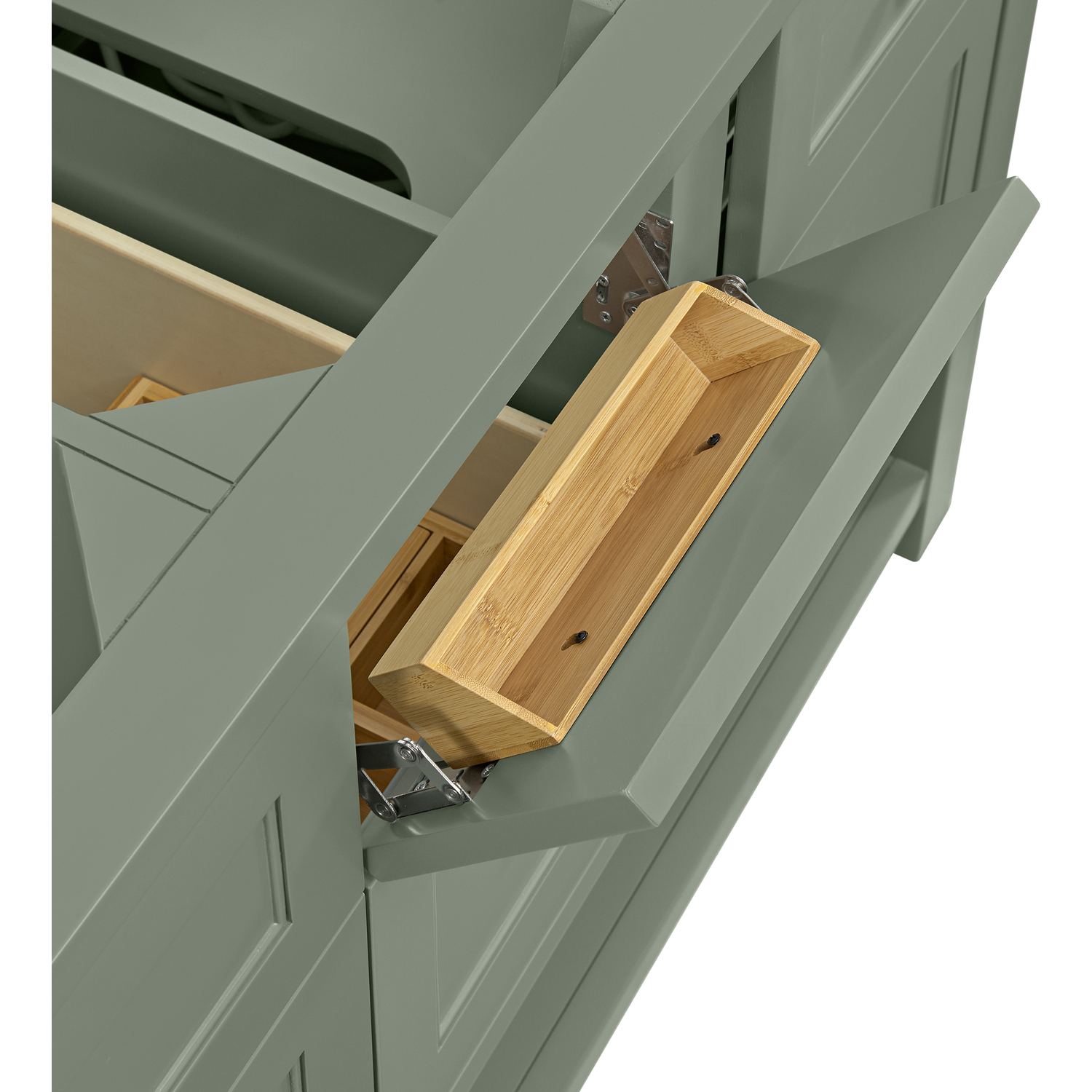 The Breckenridge 60" Double Vanity is a fresh take on traditional Mission furniture that easily transitions to Modern Farmhouse style with an air of understated sophistication. Champagne Brass knobs complement the Smokey Celadon finish, while the neatly inset door and drawer fronts lend a fresh appeal to this clean-lined classic. Two single-door cabinets open to reveal interior shelves equipped with a convenient built-in USB/120V power outlet. This console-style vanity also features two top-row tip-out drawers, two standard full-extension drawers, and an open lower shelf for additional storage. A beautiful Eternal Jasmine Pearl Silestone top with undermount sinks completes the look.Two single-door cabinets with adjustable interior shelves, two top-row tip-out drawers, and two standard full-extension drawersDrawer boxes feature English Dovetail joinery with premium, soft-close undermount drawer slides; doors feature soft-close, adjustable door hingesCabinet features a multi-stage premium finish coat to offer UV and moisture resistanceSmokey Celadon finish with Champagne Brass hardwareCountertop is pre-drilled for 8" widespread faucets; our 3cm eased edge countertops come with white porcelain rectangular sink(s) that ship separately and include mounting brackets for easy installationIntegrated 120V outlet with USB portsDrawers lined with our signature brushed aluminum laminate for easy cleaningFreestanding VanityFaucets sold separatelyA fresh take on traditional Mission furniture, the Breckenridge Collection easily transitions to Modern Farmhouse style with an air of understated sophistication. This console-style vanity has an integrated open shelf for additional storage, neatly inset door and drawer fronts to maintain the symmetry of the Shaker aesthetic, and coordinating knobs that complement each of the available finishes. With clean lines and a chic design, this vanity is destined to become a classic.1 year warranty against manufacturer's defects. We will repair or replace any defective product, if the product is defective in material or workmanship at our discretion. No warranty is expressed or implied regarding damages resulting from consumer misuse.