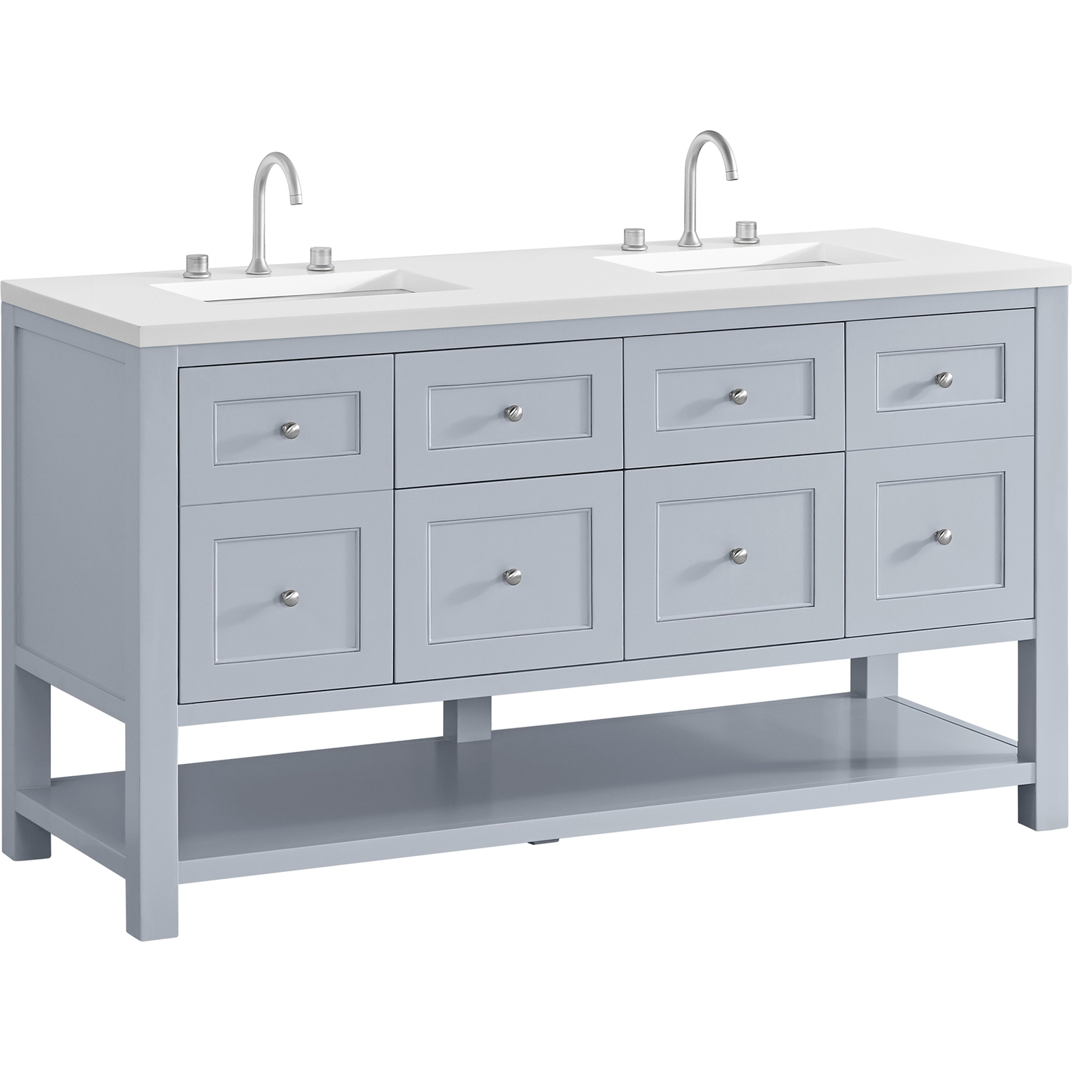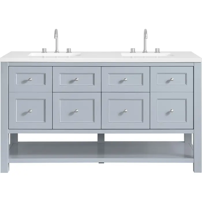 The Breckenridge 60" Double Vanity is a fresh take on traditional Mission furniture that easily transitions to Modern Farmhouse style with an air of understated sophistication. Satin Nickel knobs complement the Serenity Blue finish, while the neatly inset door and drawer fronts lend a fresh appeal to this clean-lined classic. Two single-door cabinets open to reveal interior shelves equipped with a convenient built-in USB/120V power outlet. This console-style vanity also features two top-row tip-out drawers, two standard full-extension drawers, and an open lower shelf for additional storage. A classic White Zeus Silestone top with undermount sinks completes the look.Two single-door cabinets with adjustable interior shelves, two top-row tip-out drawers, and two standard full-extension drawersDrawer boxes feature English Dovetail joinery with premium, soft-close undermount drawer slides; doors feature soft-close, adjustable door hingesCabinet features a multi-stage premium finish coat to offer UV and moisture resistanceSerenity Blue finish with Satin Nickel hardwareCountertop is pre-drilled for 8" widespread faucets; our 3cm eased edge countertops come with white porcelain rectangular sink(s) that ship separately and include mounting brackets for easy installationIntegrated 120V outlet with USB portsDrawers lined with our signature brushed aluminum laminate for easy cleaningFreestanding VanityFaucets sold separatelyA fresh take on traditional Mission furniture, the Breckenridge Collection easily transitions to Modern Farmhouse style with an air of understated sophistication. This console-style vanity has an integrated open shelf for additional storage, neatly inset door and drawer fronts to maintain the symmetry of the Shaker aesthetic, and coordinating knobs that complement each of the available finishes. With clean lines and a chic design, this vanity is destined to become a classic.1 year warranty against manufacturer's defects. We will repair or replace any defective product, if the product is defective in material or workmanship at our discretion. No warranty is expressed or implied regarding damages resulting from consumer misuse.