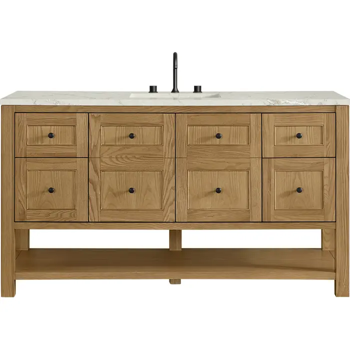 The Breckenridge 60" Single Vanity is a fresh take on traditional Mission furniture that easily transitions to Modern Farmhouse style with an air of understated sophistication. Matte Black knobs complement the Light Natural Oak finish, while the neatly inset door and drawer fronts lend a fresh appeal to this clean-lined classic. A two-door cabinet opens to reveal an interior shelf equipped with convenient built-in USB/120V power outlet. This console-style vanity also features four full-extension drawers and an open lower shelf for additional storage. A beautiful Victorian Silver Silestone top with undermount sink completes the look.Two-door cabinet with one adjustable interior shelf and four full-extension drawersDrawer boxes feature English Dovetail joinery with premium, soft-close undermount drawer slides; doors feature soft-close, adjustable door hingesCabinet features a multi-stage premium finish coat to offer UV and moisture resistanceLight Natural Oak finish with Matte Black hardwareCountertop is pre-drilled for an 8" widespread faucet; our 3cm eased edge countertops come with white porcelain rectangular sink(s) that ship separately and include mounting brackets for easy installationIntegrated 120V outlet with USB portsDrawers lined with our signature brushed aluminum laminate for easy cleaningFreestanding VanityFaucets sold separatelyA fresh take on traditional Mission furniture, the Breckenridge Collection easily transitions to Modern Farmhouse style with an air of understated sophistication. This console-style vanity has an integrated open shelf for additional storage, neatly inset door and drawer fronts to maintain the symmetry of the Shaker aesthetic, and coordinating knobs that complement each of the available finishes. With clean lines and a chic design, this vanity is destined to become a classic.1 year warranty against manufacturer's defects. We will repair or replace any defective product, if the product is defective in material or workmanship at our discretion. No warranty is expressed or implied regarding damages resulting from consumer misuse.