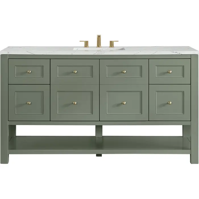 The Breckenridge 60" Single Vanity is a fresh take on traditional Mission furniture that easily transitions to Modern Farmhouse style with an air of understated sophistication. Champagne Brass knobs complement the Smokey Celadon finish, while the neatly inset door and drawer fronts lend a fresh appeal to this clean-lined classic. A two-door cabinet opens to reveal an interior shelf equipped with convenient built-in USB/120V power outlet. This console-style vanity also features four full-extension drawers and an open lower shelf for additional storage. A stunning Ethereal Noctis Silestone top with undermount sink completes the look.Two-door cabinet with one adjustable interior shelf and four full-extension drawersDrawer boxes feature English Dovetail joinery with premium, soft-close undermount drawer slides; doors feature soft-close, adjustable door hingesCabinet features a multi-stage premium finish coat to offer UV and moisture resistanceSmokey Celadon finish with Champagne Brass hardwareCountertop is pre-drilled for an 8" widespread faucet; our 3cm eased edge countertops come with white porcelain rectangular sink(s) that ship separately and include mounting brackets for easy installationIntegrated 120V outlet with USB portsDrawers lined with our signature brushed aluminum laminate for easy cleaningFreestanding VanityFaucets sold separatelyA fresh take on traditional Mission furniture, the Breckenridge Collection easily transitions to Modern Farmhouse style with an air of understated sophistication. This console-style vanity has an integrated open shelf for additional storage, neatly inset door and drawer fronts to maintain the symmetry of the Shaker aesthetic, and coordinating knobs that complement each of the available finishes. With clean lines and a chic design, this vanity is destined to become a classic.1 year warranty against manufacturer's defects. We will repair or replace any defective product, if the product is defective in material or workmanship at our discretion. No warranty is expressed or implied regarding damages resulting from consumer misuse.