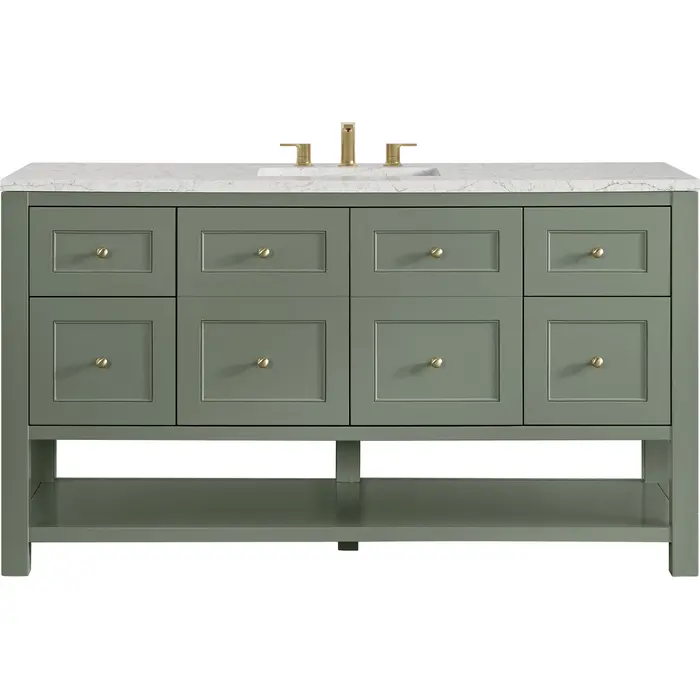 The Breckenridge 60" Single Vanity by James Martin Vanities is a fresh take on traditional Mission furniture that easily transitions to Modern Farmhouse style with an air of understated sophistication. Champagne Brass knobs complement the Smokey Celadon finish, while the neatly inset door and drawer fronts lend a fresh appeal to this clean-lined classic. A two-door cabinet opens to reveal an interior shelf equipped with convenient built-in USB/120V power outlet. This console-style vanity also features four full-extension drawers and an open lower shelf for additional storage. A beautiful Eternal Jasmine Pearl Silestone® top with undermount sink completes the look. This unit is enabled with FreePower wireless charging; featuring a single-device charger seamlessly embedded into the countertop, indicated by a light-up halo to the left of the sink. Designed for modern living, FreePower offers convenient, integrated, wireless charging when and where you need it.Two-door cabinet with one adjustable interior shelf and four full-extension drawersDrawer boxes feature English Dovetail joinery with premium, soft-close undermount drawer slides; doors feature soft-close, adjustable door hingesCabinet features a multi-stage premium finish coat to offer UV and moisture resistanceSmokey Celadon finish with Champagne Brass hardwareCountertop is pre-drilled for an 8" widespread faucet; our 3cm eased edge countertops come with white porcelain rectangular sink(s) that ship separately and include mounting brackets for easy installationIntegrated 120V outlet with USB portsDrawers lined with our signature brushed aluminum laminate for easy cleaningFreestanding VanityFaucet sold separatelyMatching stone backsplash available as add-on purchaseFreePower Wireless Charging; single-device unit left of sinkA fresh take on traditional Mission furniture, the Breckenridge Collection by James Martin Vanities easily transitions to Modern Farmhouse style with an air of understated sophistication. This console-style vanity has an integrated open shelf for additional storage, neatly inset door and drawer fronts to maintain the symmetry of the Shaker aesthetic, and coordinating knobs that complement each of the available finishes. With clean lines and a chic design, this vanity is destined to become a classic.1 year warranty against manufacturer's defects. We will repair or replace any defective product, if the product is defective in material or workmanship at our discretion. No warranty is expressed or implied regarding damages resulting from consumer misuse.