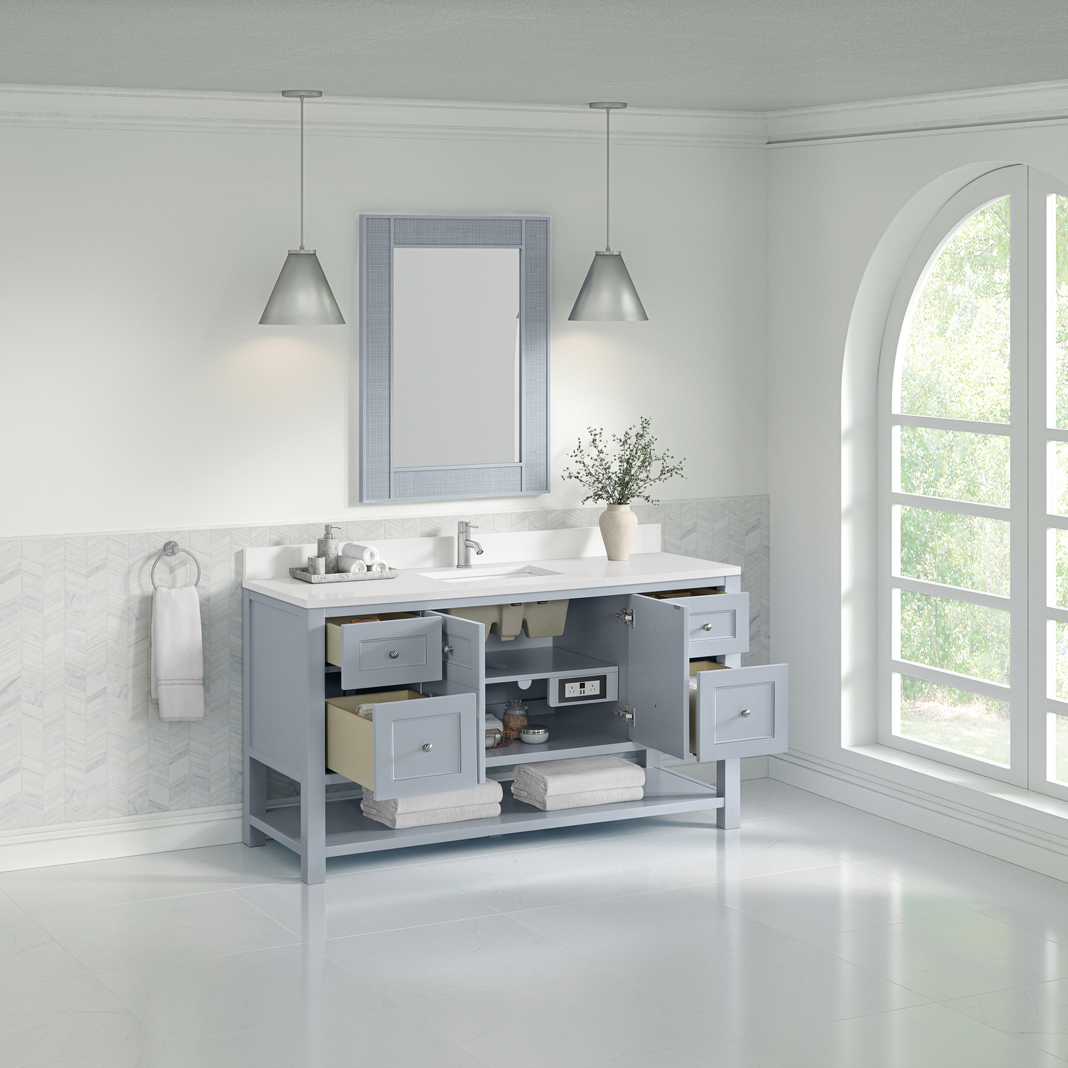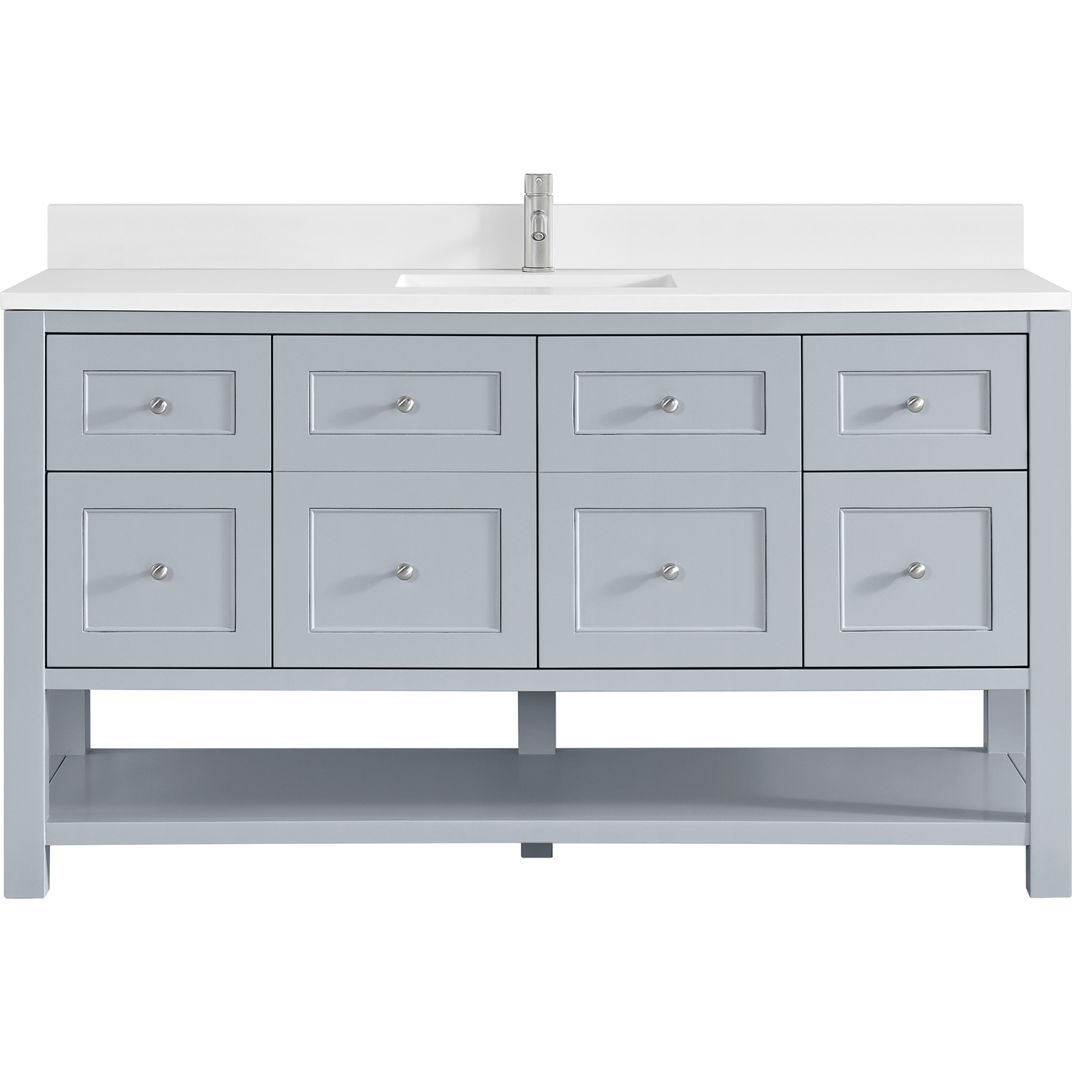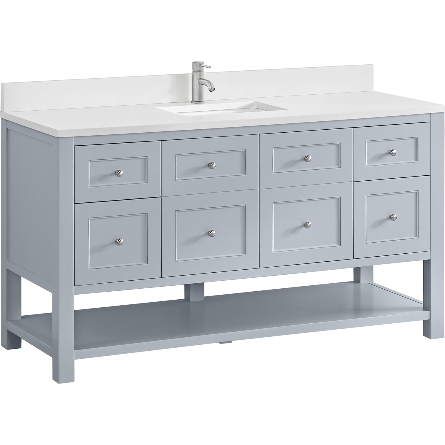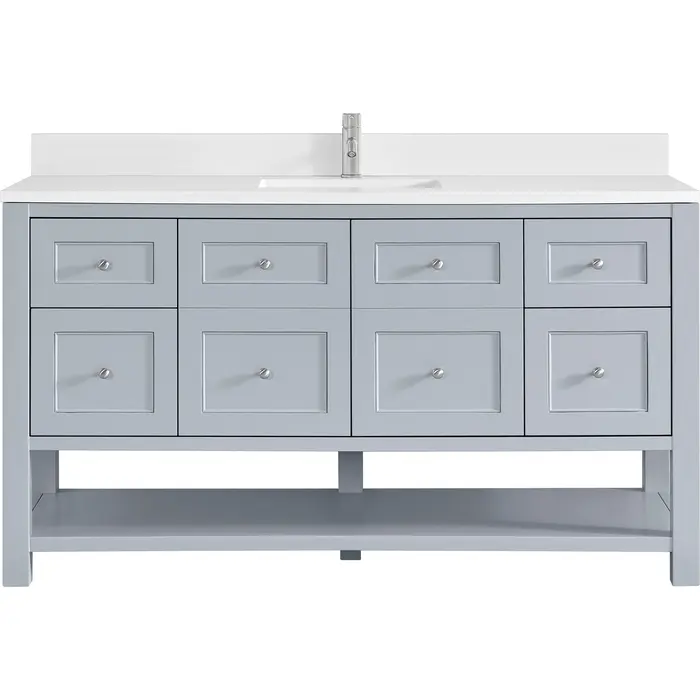 The Breckenridge 60" Single Vanity is a fresh take on traditional Mission furniture that easily transitions to Modern Farmhouse style with an air of understated sophistication. Satin Nickel knobs complement the Serenity Blue finish, while the neatly inset door and drawer fronts lend a fresh appeal to this clean-lined classic. A two-door cabinet opens to reveal an interior shelf equipped with convenient built-in USB/120V power outlet. This console-style vanity also features four full-extension drawers and an open lower shelf for additional storage. A single-hole faucet White Zeus Silestone top with undermount sink and backsplash complete the look with a contemporary touch.Two-door cabinet with one adjustable interior shelf and four full-extension drawersDrawer boxes feature English Dovetail joinery with premium, soft-close undermount drawer slides; doors feature soft-close, adjustable door hingesCabinet features a multi-stage premium finish coat to offer UV and moisture resistanceSerenity Blue finish with Satin Nickel hardwareWhite Zeus Silestone top with backsplash is pre-drilled for a single-hole faucet; our 3cm eased edge countertops come with white porcelain rectangular undermount sink(s) that ship separately and include mounting brackets for easy installationIntegrated 120V outlet with USB portsDrawers lined with our signature brushed aluminum laminate for easy cleaningFreestanding VanityMatching White Zeus 3cm Silestone BacksplashFaucets sold separatelyA fresh take on traditional Mission furniture, the Breckenridge Collection easily transitions to Modern Farmhouse style with an air of understated sophistication. This console-style vanity has an integrated open shelf for additional storage, neatly inset door and drawer fronts to maintain the symmetry of the Shaker aesthetic, and coordinating knobs that complement each of the available finishes. With clean lines and a chic design, this vanity is destined to become a classic.1 year warranty against manufacturer's defects. We will repair or replace any defective product, if the product is defective in material or workmanship at our discretion. No warranty is expressed or implied regarding damages resulting from consumer misuse.