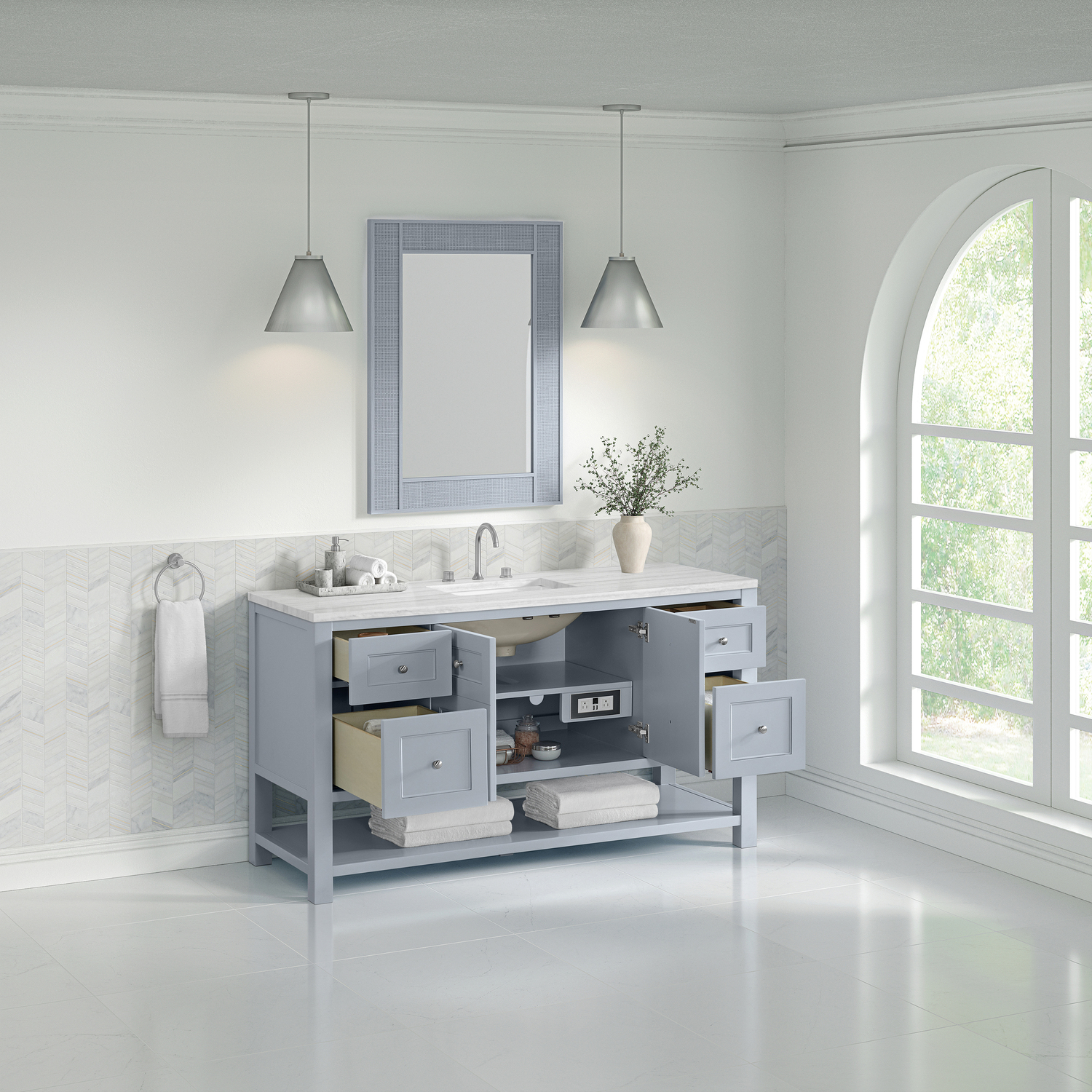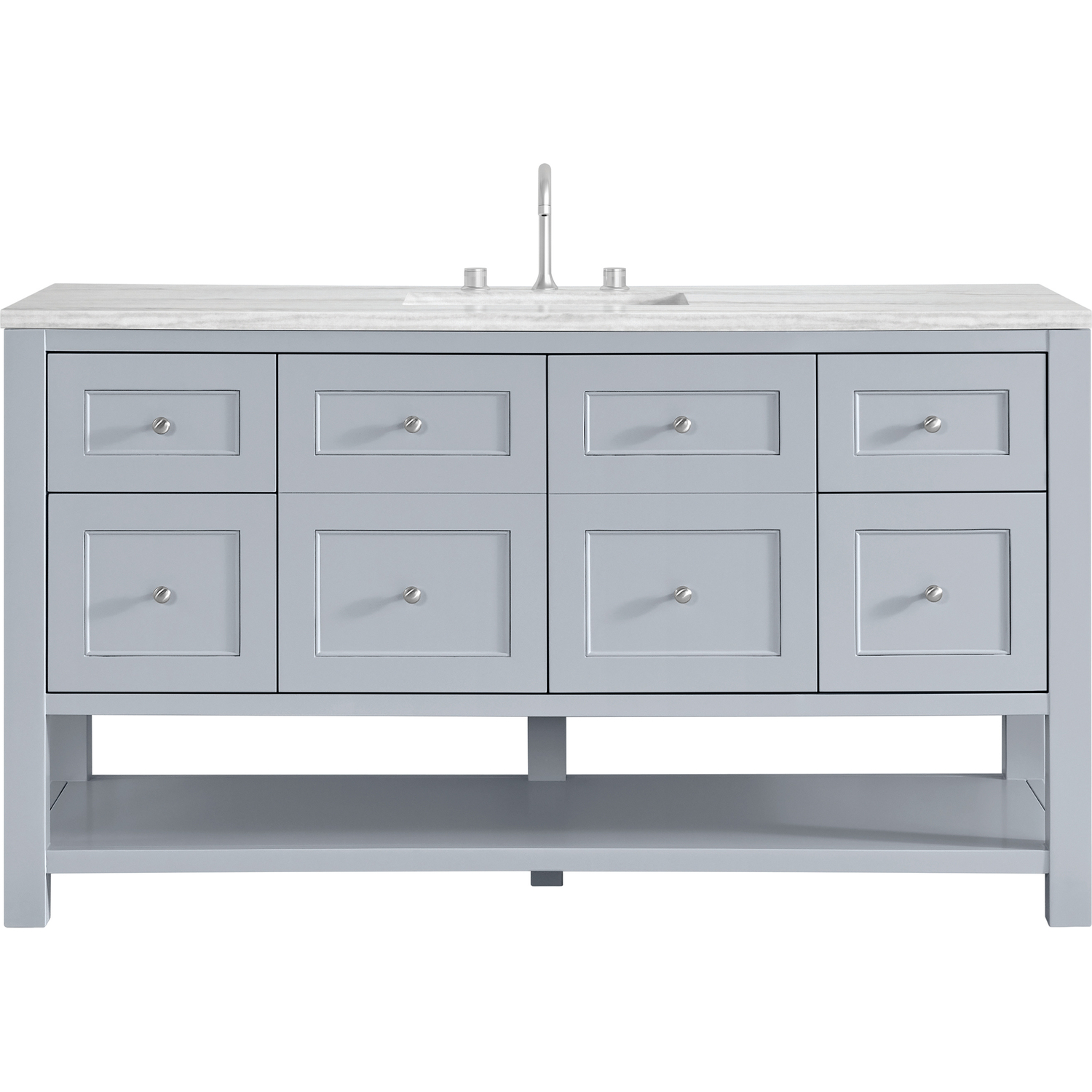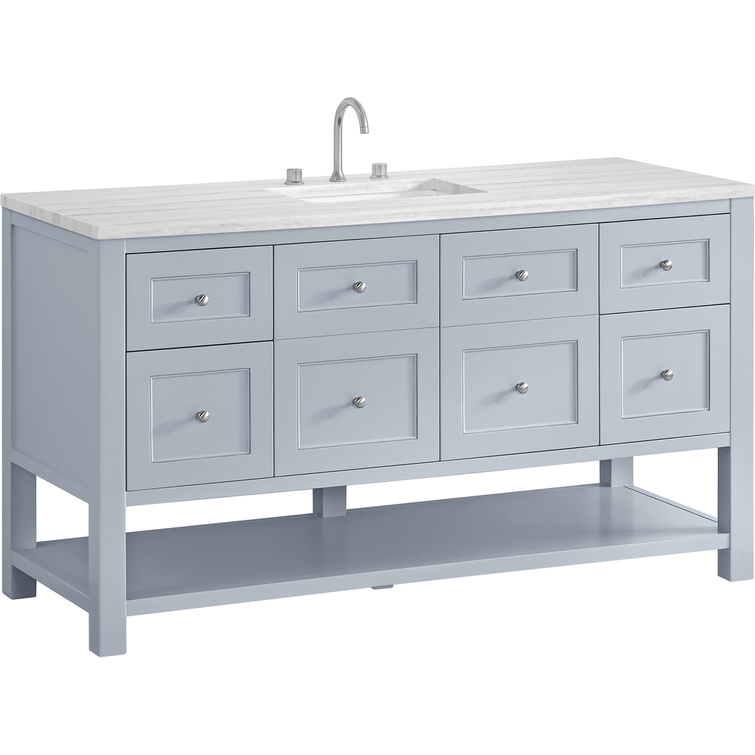 The Breckenridge 60" Single Vanity is a fresh take on traditional Mission furniture that easily transitions to Modern Farmhouse style with an air of understated sophistication. Satin Nickel knobs complement the Serenity Blue finish, while the neatly inset door and drawer fronts lend a fresh appeal to this clean-lined classic. A two-door cabinet opens to reveal an interior shelf equipped with convenient built-in USB/120V power outlet. This console-style vanity also features four full-extension drawers and an open lower shelf for additional storage. A modern Arctic Fall Solid Surface top with undermount sink completes the look.Two-door cabinet with one adjustable interior shelf and four full-extension drawersDrawer boxes feature English Dovetail joinery with premium, soft-close undermount drawer slides; doors feature soft-close, adjustable door hingesCabinet features a multi-stage premium finish coat to offer UV and moisture resistanceSerenity Blue finish with Satin Nickel hardwareCountertop is pre-drilled for an 8" widespread faucet; our 3cm eased edge countertops come with white porcelain rectangular sink(s) that ship separately and include mounting brackets for easy installationIntegrated 120V outlet with USB portsDrawers lined with our signature brushed aluminum laminate for easy cleaningFreestanding VanityFaucets sold separatelyA fresh take on traditional Mission furniture, the Breckenridge Collection easily transitions to Modern Farmhouse style with an air of understated sophistication. This console-style vanity has an integrated open shelf for additional storage, neatly inset door and drawer fronts to maintain the symmetry of the Shaker aesthetic, and coordinating knobs that complement each of the available finishes. With clean lines and a chic design, this vanity is destined to become a classic.1 year warranty against manufacturer's defects. We will repair or replace any defective product, if the product is defective in material or workmanship at our discretion. No warranty is expressed or implied regarding damages resulting from consumer misuse.