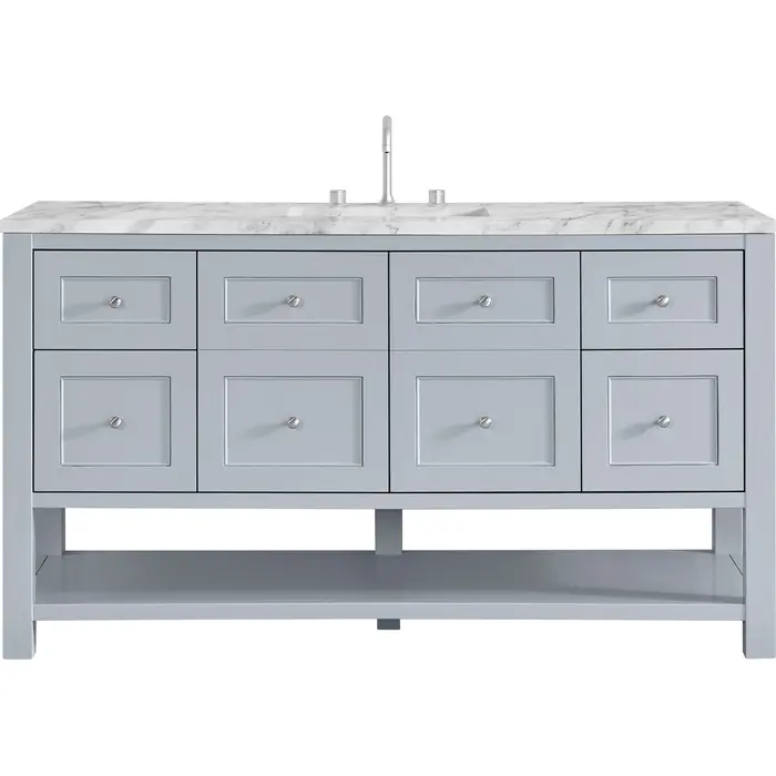 The Breckenridge 60" Single Vanity is a fresh take on traditional Mission furniture that easily transitions to Modern Farmhouse style with an air of understated sophistication. Satin Nickel knobs complement the Serenity Blue finish, while the neatly inset door and drawer fronts lend a fresh appeal to this clean-lined classic. A two-door cabinet opens to reveal an interior shelf equipped with convenient built-in USB/120V power outlet. This console-style vanity also features four full-extension drawers and an open lower shelf for additional storage. A classic Carrara Marble top with undermount sink completes the look.Two-door cabinet with one adjustable interior shelf and four full-extension drawersDrawer boxes feature English Dovetail joinery with premium, soft-close undermount drawer slides; doors feature soft-close, adjustable door hingesCabinet features a multi-stage premium finish coat to offer UV and moisture resistanceSerenity Blue finish with Satin Nickel hardwareCountertop is pre-drilled for an 8" widespread faucet; our 3cm eased edge countertops come with white porcelain rectangular sink(s) that ship separately and include mounting brackets for easy installationIntegrated 120V outlet with USB portsDrawers lined with our signature brushed aluminum laminate for easy cleaningFreestanding VanityFaucets sold separatelyA fresh take on traditional Mission furniture, the Breckenridge Collection easily transitions to Modern Farmhouse style with an air of understated sophistication. This console-style vanity has an integrated open shelf for additional storage, neatly inset door and drawer fronts to maintain the symmetry of the Shaker aesthetic, and coordinating knobs that complement each of the available finishes. With clean lines and a chic design, this vanity is destined to become a classic.1 year warranty against manufacturer's defects. We will repair or replace any defective product, if the product is defective in material or workmanship at our discretion. No warranty is expressed or implied regarding damages resulting from consumer misuse.
