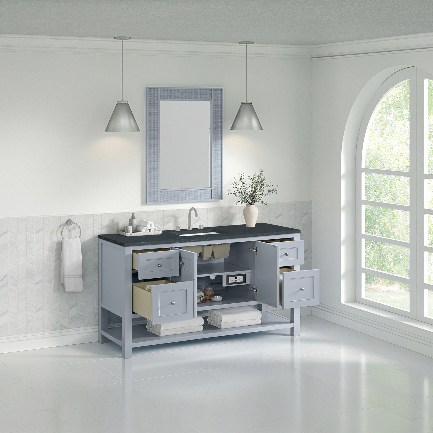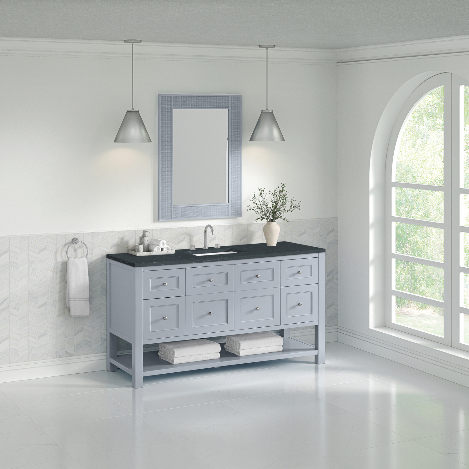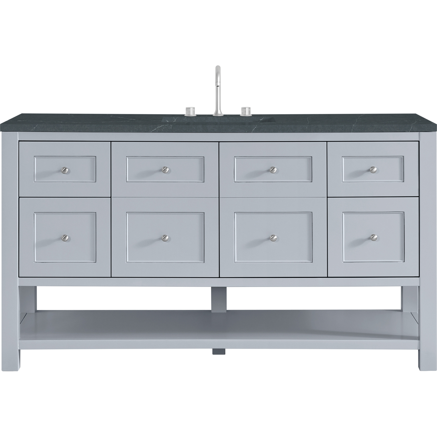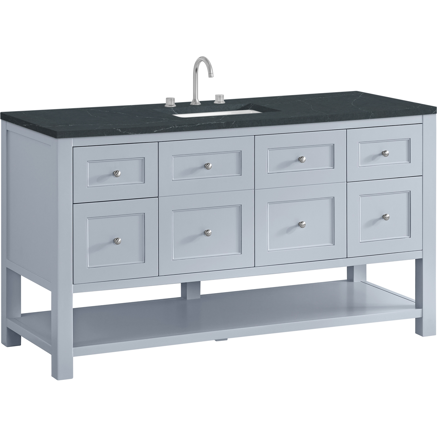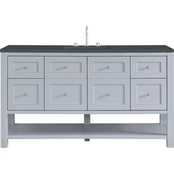 The Breckenridge 60" Single Vanity is a fresh take on traditional Mission furniture that easily transitions to Modern Farmhouse style with an air of understated sophistication. Satin Nickel knobs complement the Serenity Blue finish, while the neatly inset door and drawer fronts lend a fresh appeal to this clean-lined classic. A two-door cabinet opens to reveal an interior shelf equipped with convenient built-in USB/120V power outlet. This console-style vanity also features four full-extension drawers and an open lower shelf for additional storage. A suede-finished Charcoal Soapstone Silestone top with undermount sink completes the look.Two-door cabinet with one adjustable interior shelf and four full-extension drawersDrawer boxes feature English Dovetail joinery with premium, soft-close undermount drawer slides; doors feature soft-close, adjustable door hingesCabinet features a multi-stage premium finish coat to offer UV and moisture resistanceSerenity Blue finish with Satin Nickel hardwareCountertop is pre-drilled for an 8" widespread faucet; our 3cm eased edge countertops come with white porcelain rectangular sink(s) that ship separately and include mounting brackets for easy installationIntegrated 120V outlet with USB portsDrawers lined with our signature brushed aluminum laminate for easy cleaningFreestanding VanityFaucets sold separatelyA fresh take on traditional Mission furniture, the Breckenridge Collection easily transitions to Modern Farmhouse style with an air of understated sophistication. This console-style vanity has an integrated open shelf for additional storage, neatly inset door and drawer fronts to maintain the symmetry of the Shaker aesthetic, and coordinating knobs that complement each of the available finishes. With clean lines and a chic design, this vanity is destined to become a classic.1 year warranty against manufacturer's defects. We will repair or replace any defective product, if the product is defective in material or workmanship at our discretion. No warranty is expressed or implied regarding damages resulting from consumer misuse.
