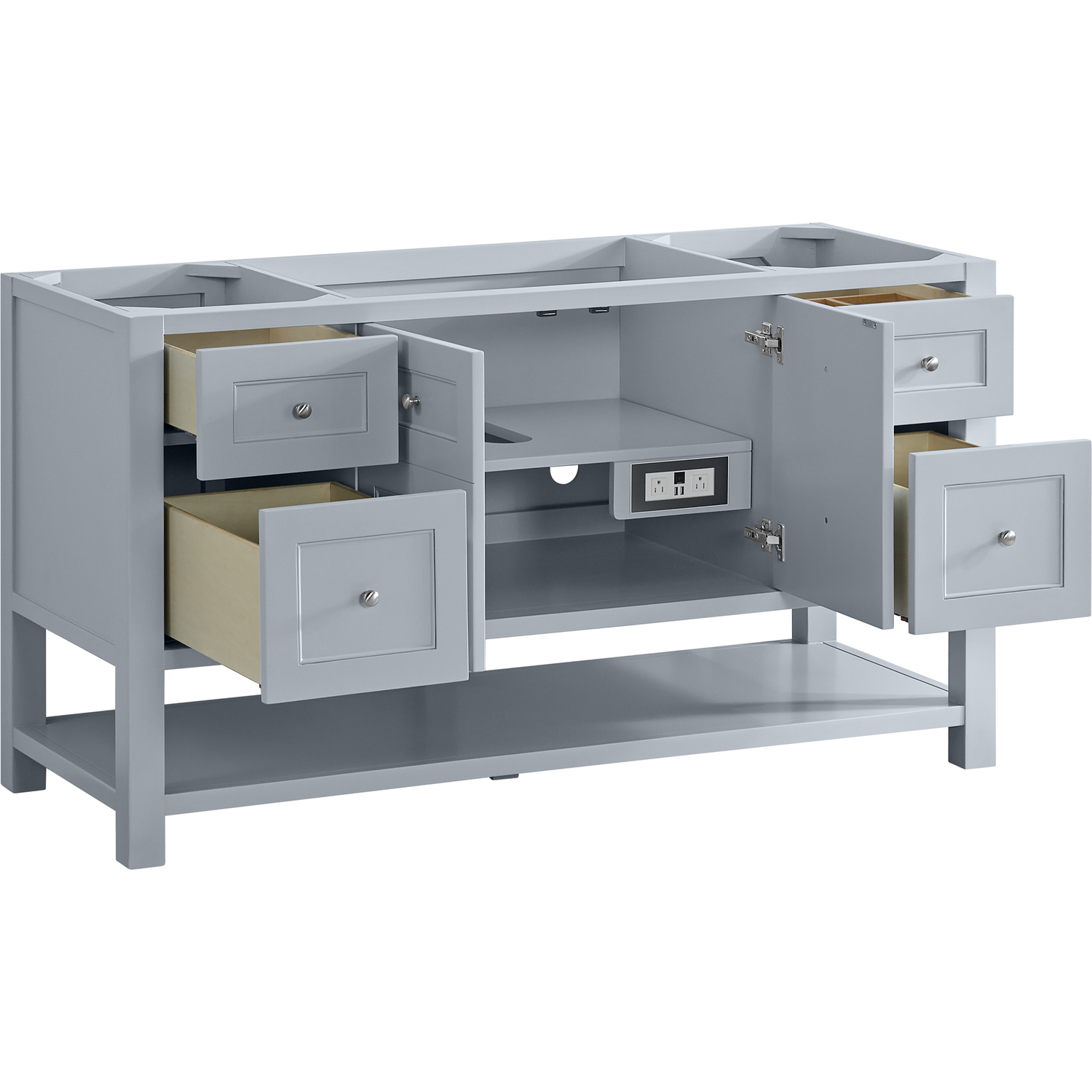The Breckenridge 60" Single Vanity is a fresh take on traditional Mission furniture that easily transitions to Modern Farmhouse style with an air of understated sophistication. Satin Nickel knobs complement the Serenity Blue finish, while the neatly inset door and drawer fronts lend a fresh appeal to this clean-lined classic. A two-door cabinet opens to reveal an interior shelf equipped with convenient built-in USB/120V power outlet. This console-style vanity also features four full-extension drawers and an open lower shelf for additional storage. A beautiful Eternal Jasmine Pearl Silestone top with undermount sink completes the look.Two-door cabinet with one adjustable interior shelf and four full-extension drawersDrawer boxes feature English Dovetail joinery with premium, soft-close undermount drawer slides; doors feature soft-close, adjustable door hingesCabinet features a multi-stage premium finish coat to offer UV and moisture resistanceSerenity Blue finish with Satin Nickel hardwareCountertop is pre-drilled for an 8" widespread faucet; our 3cm eased edge countertops come with white porcelain rectangular sink(s) that ship separately and include mounting brackets for easy installationIntegrated 120V outlet with USB portsDrawers lined with our signature brushed aluminum laminate for easy cleaningFreestanding VanityFaucets sold separatelyA fresh take on traditional Mission furniture, the Breckenridge Collection easily transitions to Modern Farmhouse style with an air of understated sophistication. This console-style vanity has an integrated open shelf for additional storage, neatly inset door and drawer fronts to maintain the symmetry of the Shaker aesthetic, and coordinating knobs that complement each of the available finishes. With clean lines and a chic design, this vanity is destined to become a classic.1 year warranty against manufacturer's defects. We will repair or replace any defective product, if the product is defective in material or workmanship at our discretion. No warranty is expressed or implied regarding damages resulting from consumer misuse.